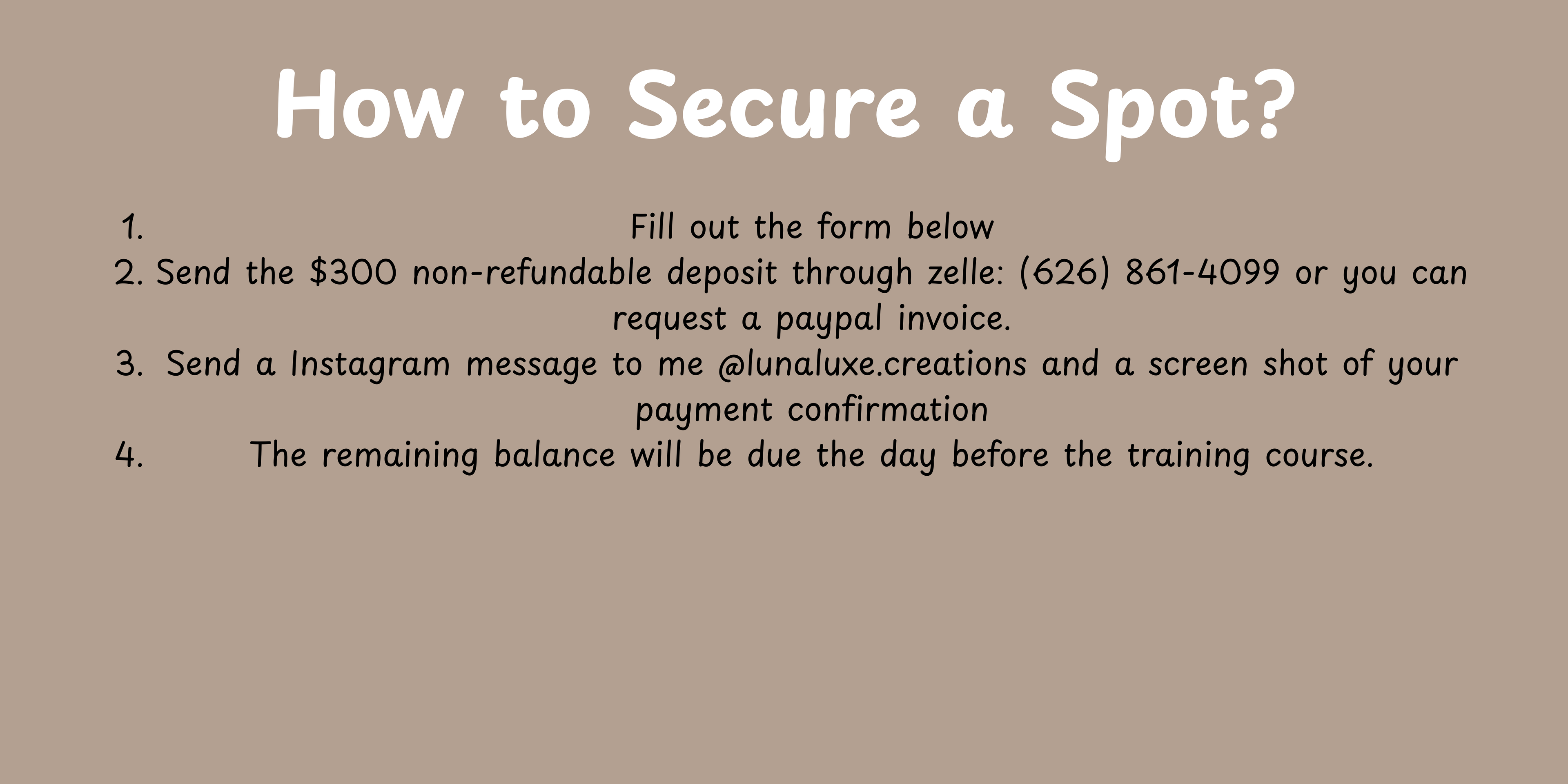 You can reserve your spot directly through our website using the booking link, and sending a $300 deposit to reserve your date.