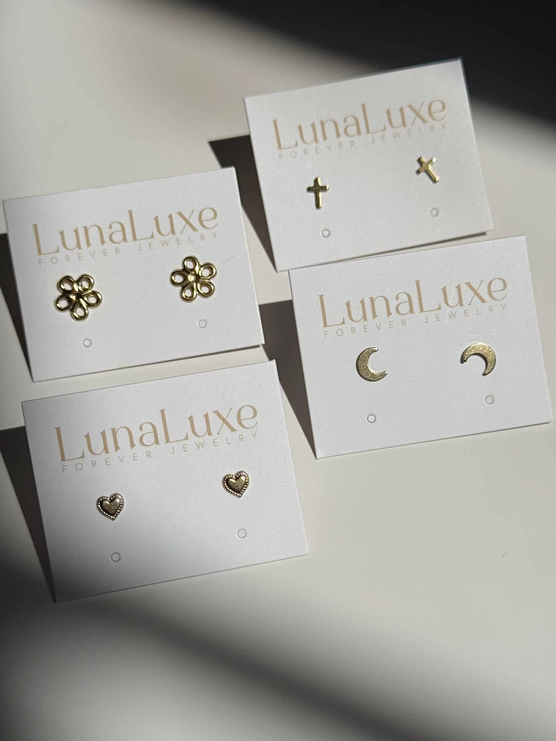 Delicate, meaningful, and made to last — our 14k Gold-Filled Stud Earrings are the perfect everyday accessory. Choose from four timeless designs: a dainty cross, sweet flower, celestial crescent moon, or romantic heart. Each piece adds a subtle charm to your look, whether worn solo or styled in an ear stack.