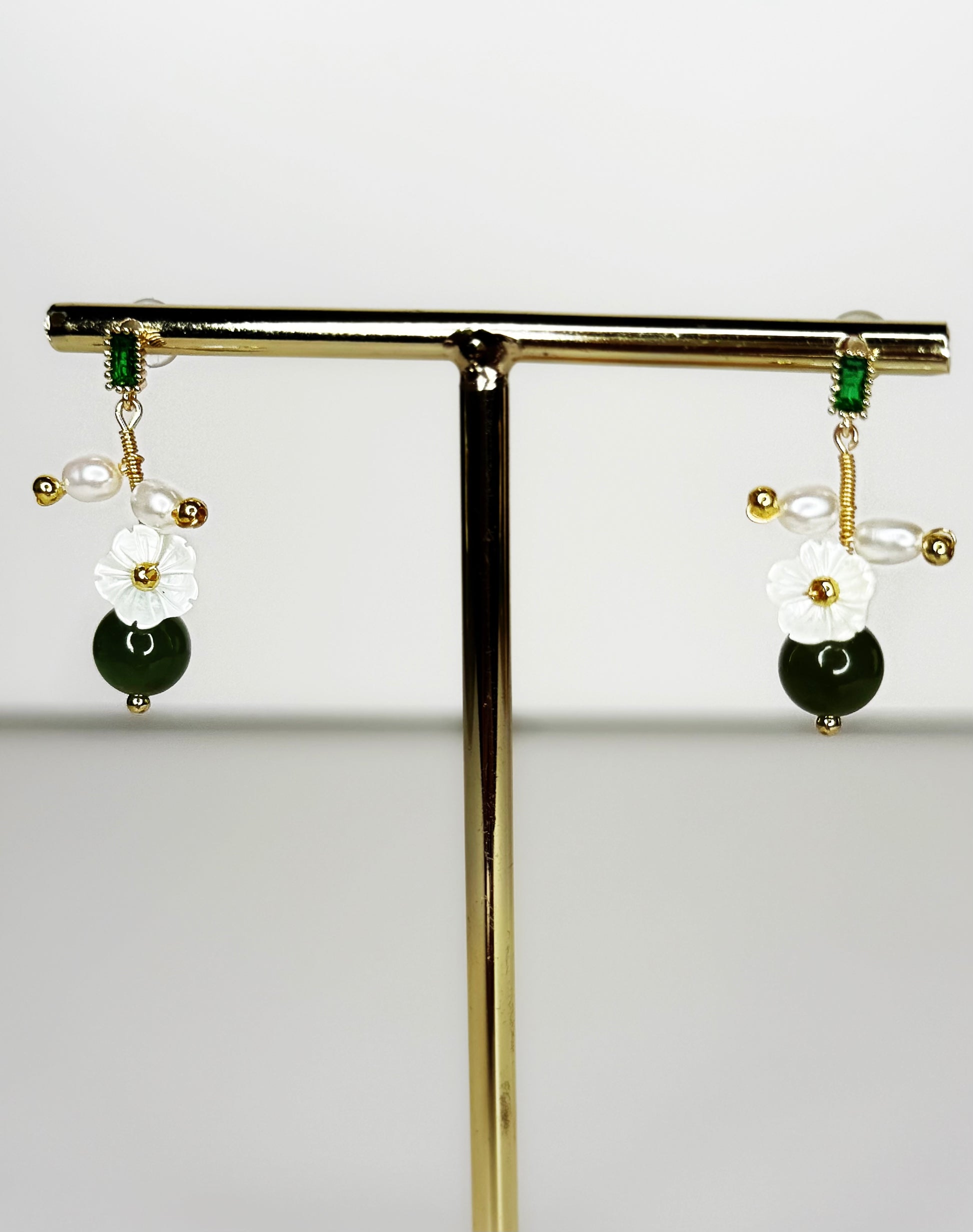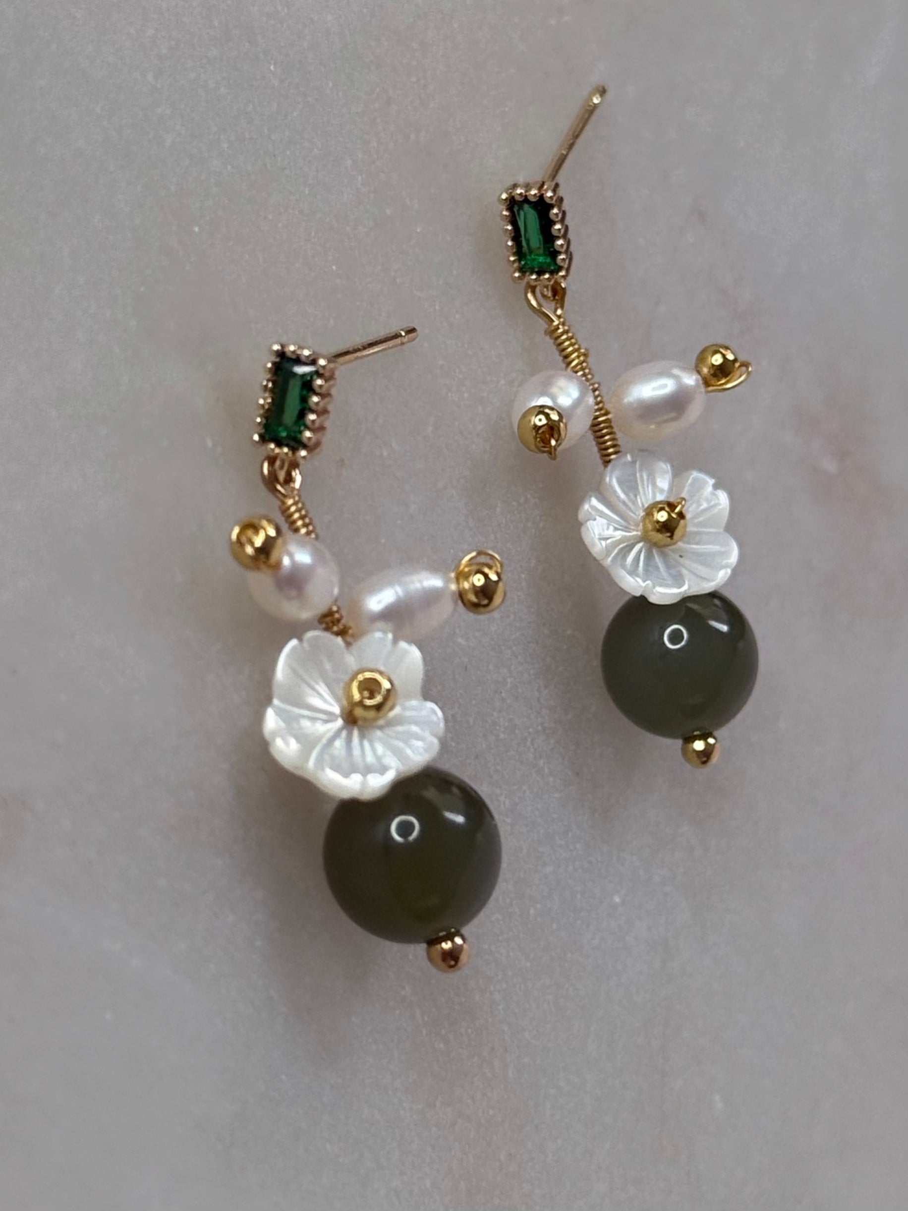 Elegant and enchanting, the Anastasia Jade Earrings are a harmonious blend of natural beauty and timeless sophistication. Featuring a rich green jade sphere as the focal point, these earrings are delicately accented with a white floral detail, evoking a sense of grace and femininity. Above the flower, two freshwater rice pearls add a soft, luminous touch, while a rectangular green zircon stud set in 18K gold plating brings a subtle sparkle. Whether worn for a special occasion or as an everyday statement, the Anastasia Jade Earrings capture the perfect balance of nature and refinement.