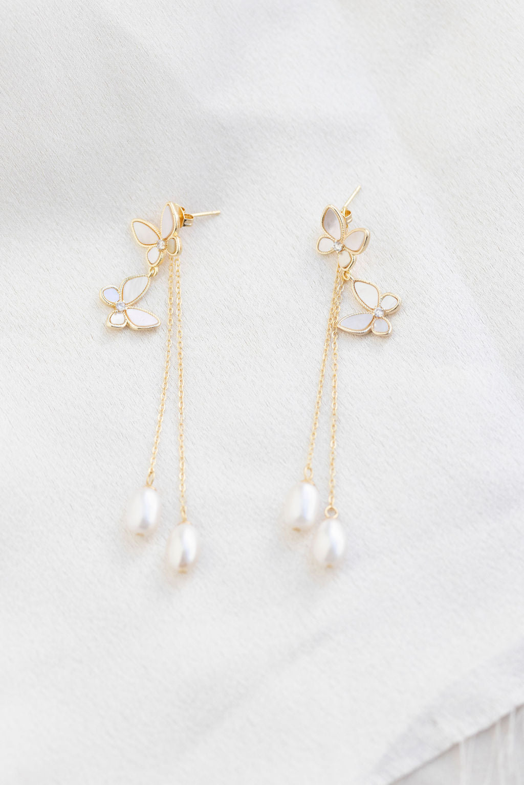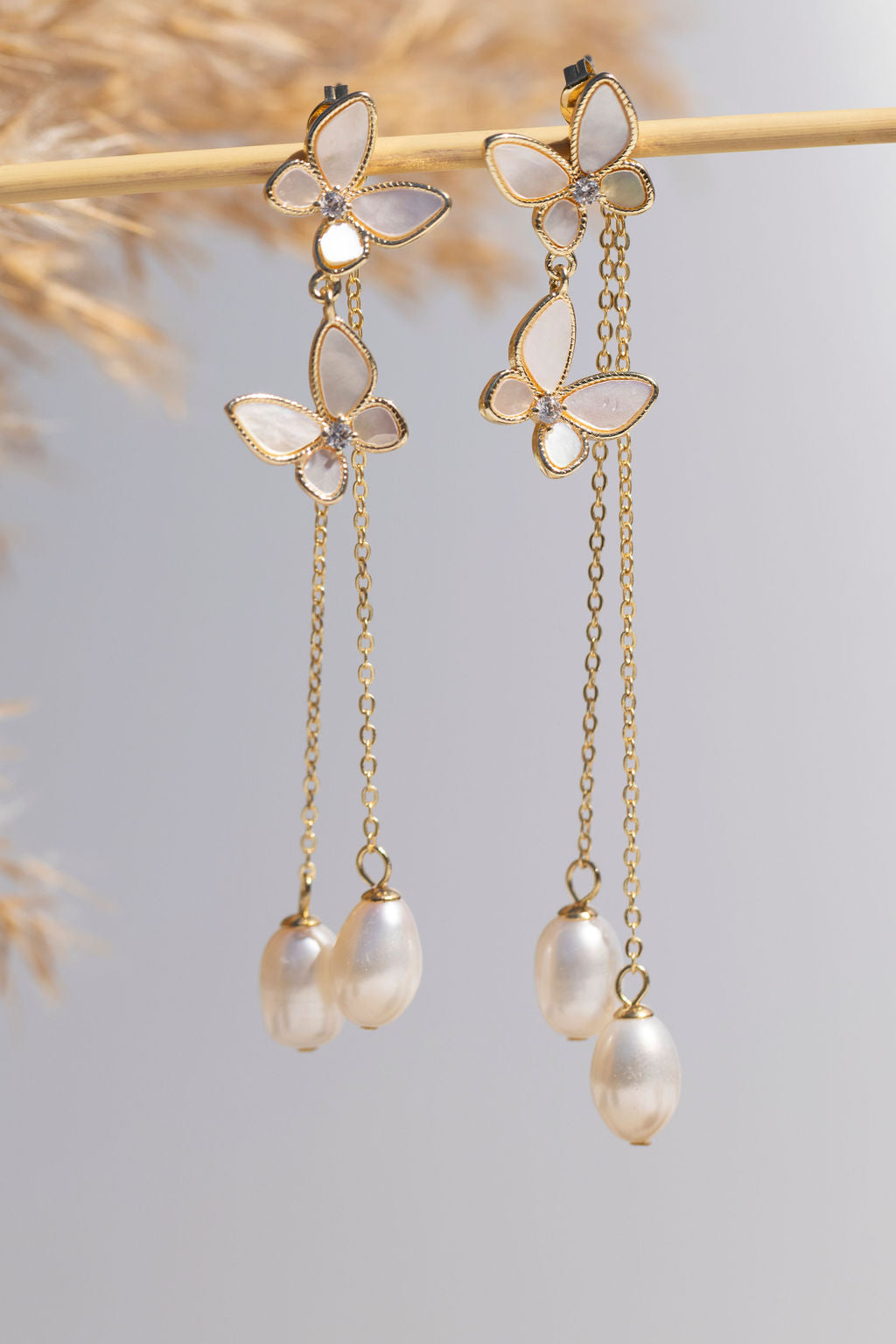 Aurelia Duo Earrings: Experience the magic of versatility with the Aurelia Duo Earrings. Featuring two delicate butterflies on each earring, complemented by a graceful gold chain with a lustrous freshwater pearl. The removable chain allows you to wear these earrings two ways—either as an elegant statement piece or a minimal, butterfly-only look. Perfect for adding a touch of whimsy and sophistication to any ensemble.