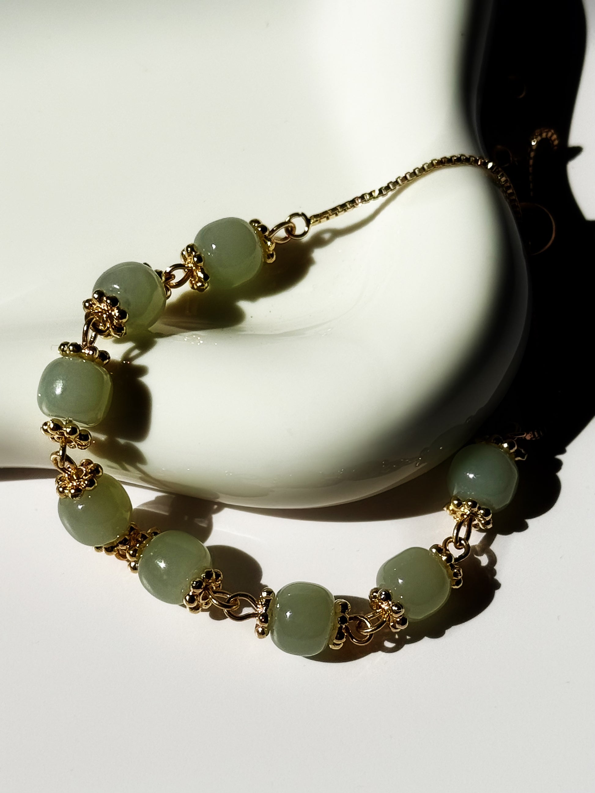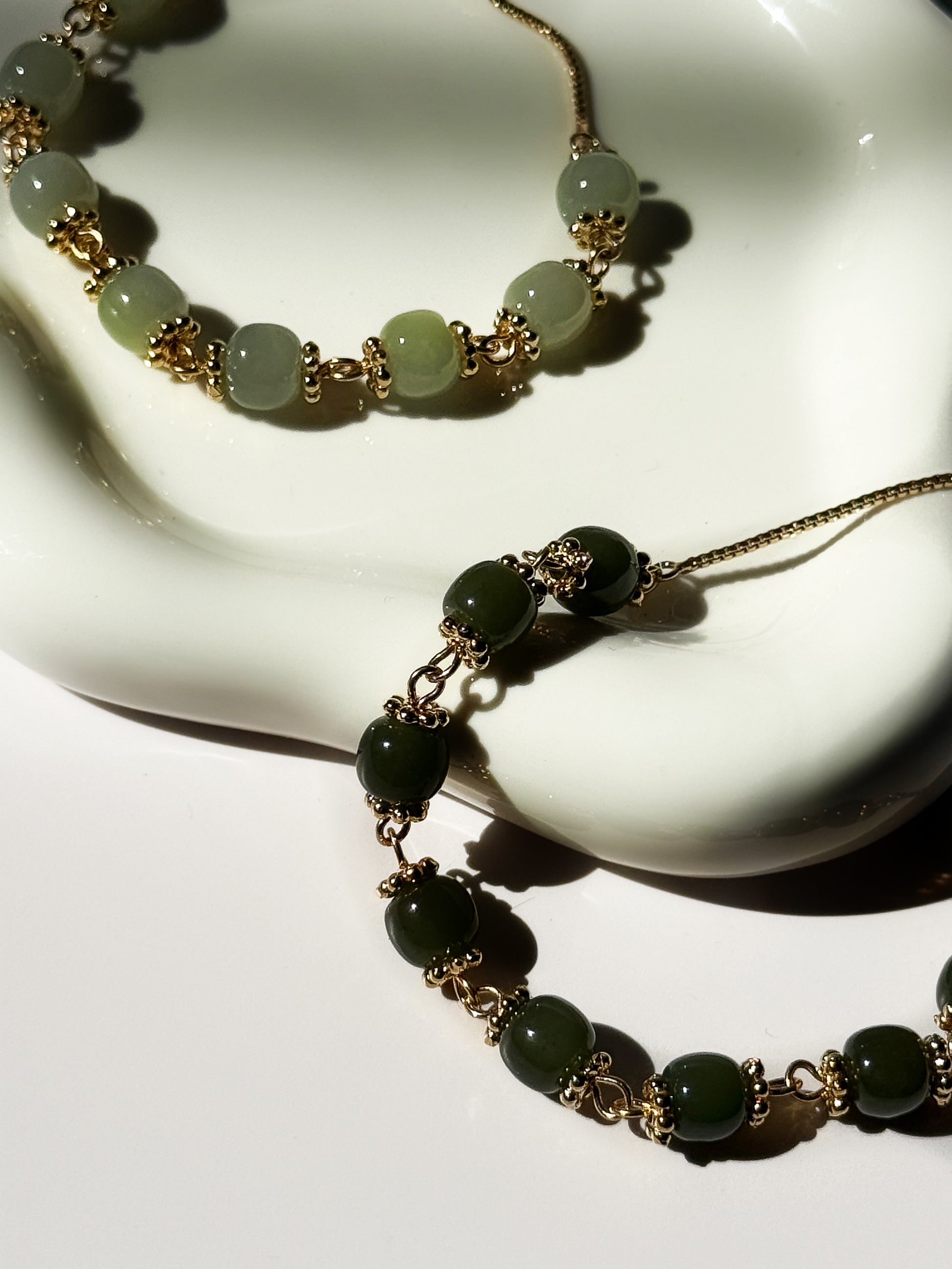 The Aveline Bracelet features smooth, natural jade beads, beautifully spaced along a sleek snake chain. Accented with 18k gold-plated brass between each jade bead, this bracelet exudes effortless elegance and balanced energy. The adjustable ball closure ensures a custom fit, allowing you to wear it comfortably at 6"-7.5". Choose from two stunning shades of jade: a rich, dark green or a soft, light green. Whether you wear it for a pop of color or as a symbol of harmony, this bracelet is a versatile and timeless piece.
