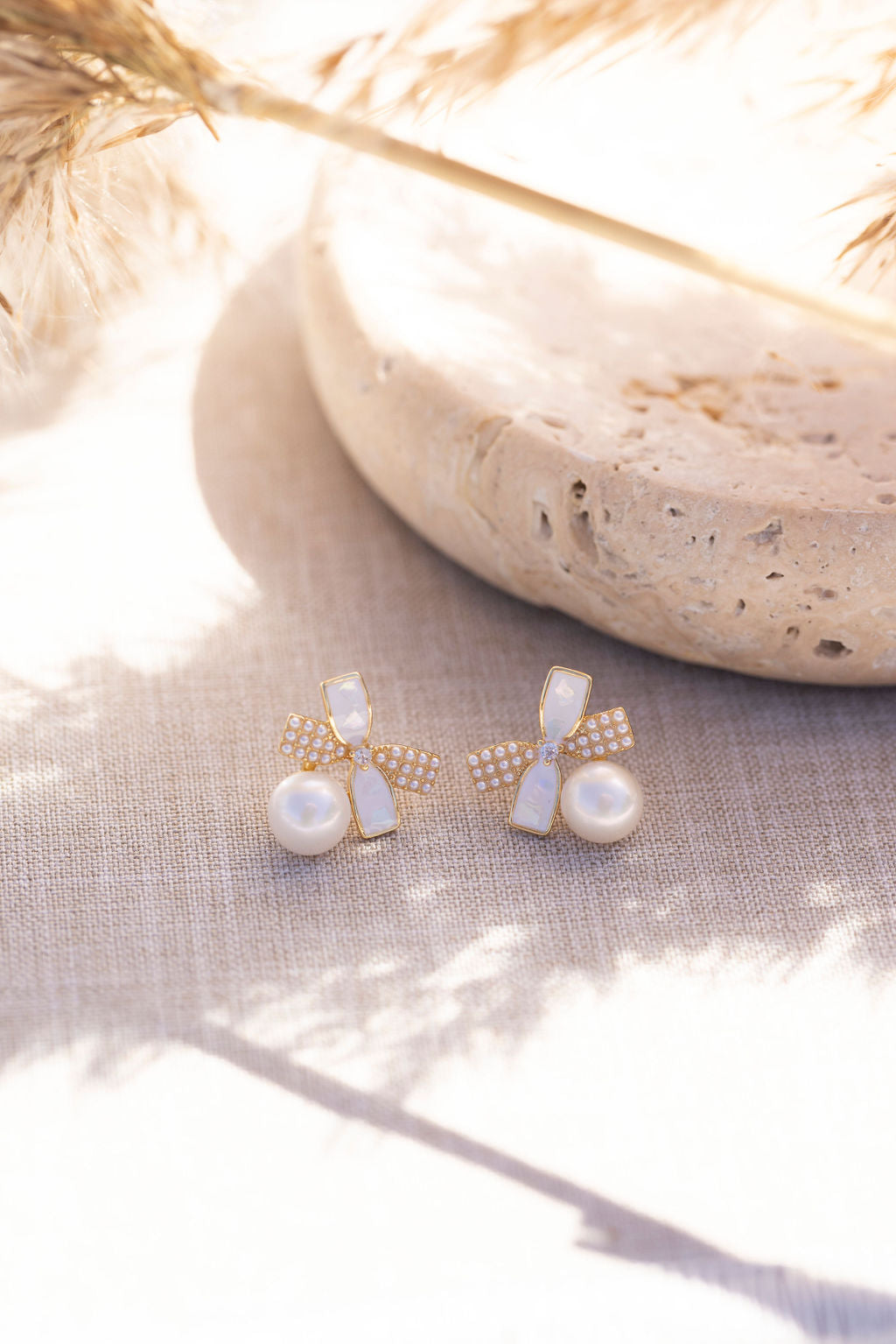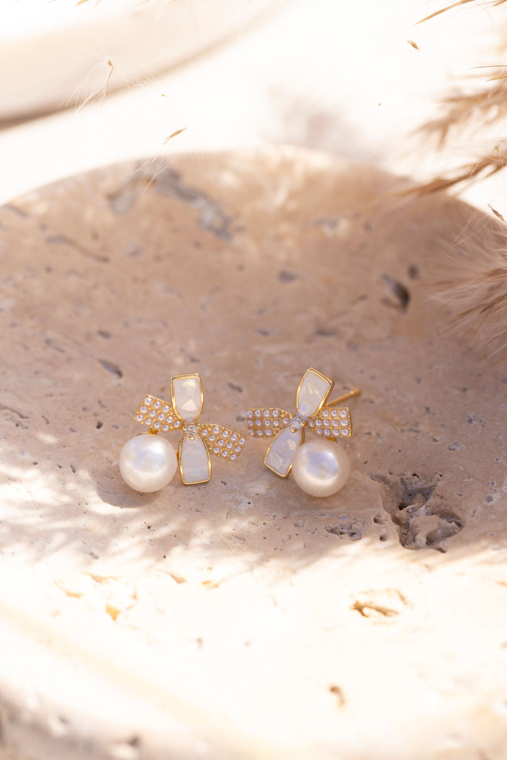 - Design: Gold and white two-tone bow with mini pearl detailing and freshwater pearl dangle