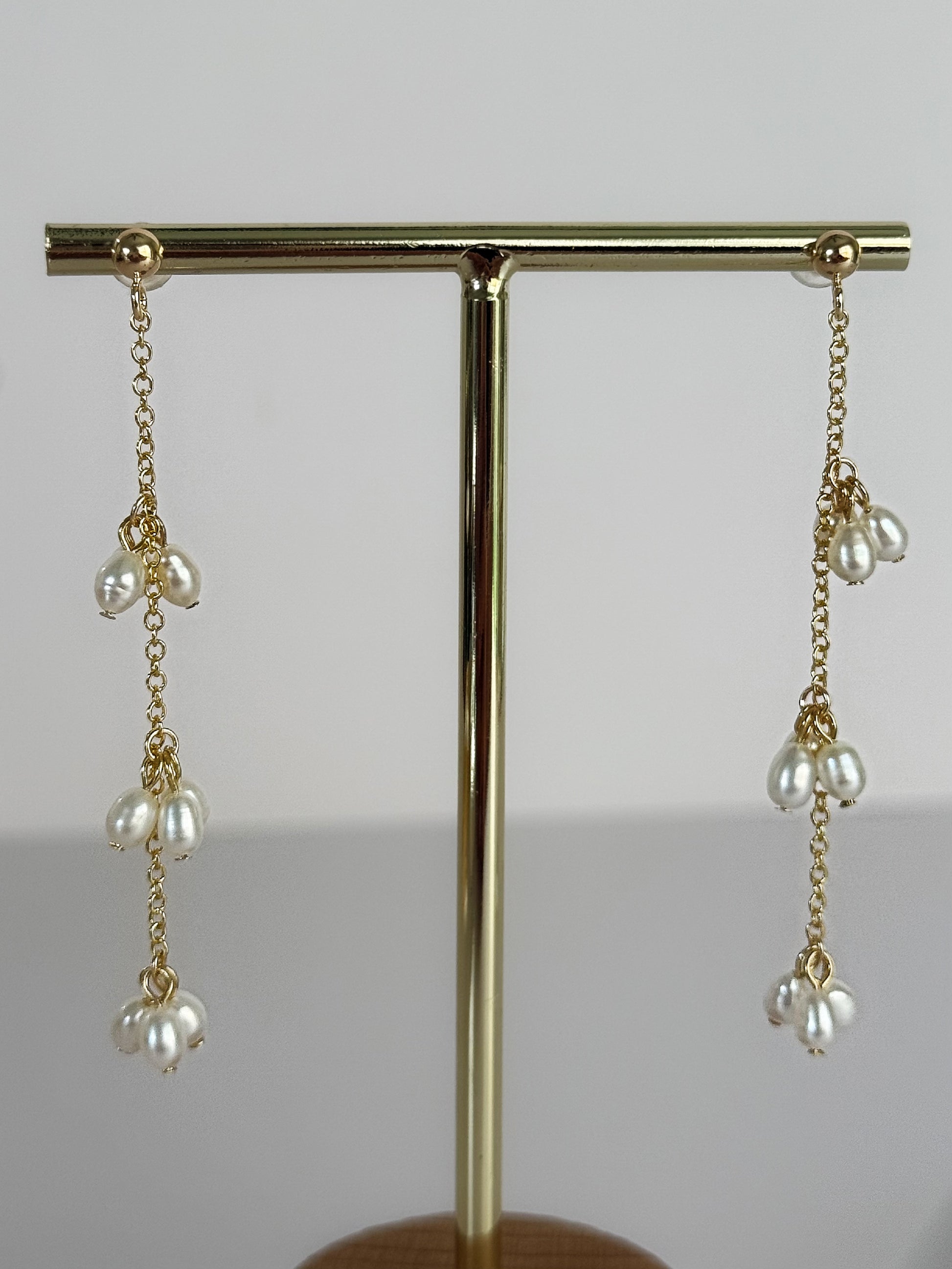 Graceful and glowing, the Cascade Pearl Earrings are designed to move with you. Featuring three delicate clusters of natural freshwater rice pearls suspended along a dainty gold chain, these earrings offer an effortless elegance that feels both timeless and modern. Lightweight and eye-catching, they’re the perfect statement for weddings, date nights, or elevating your everyday look.