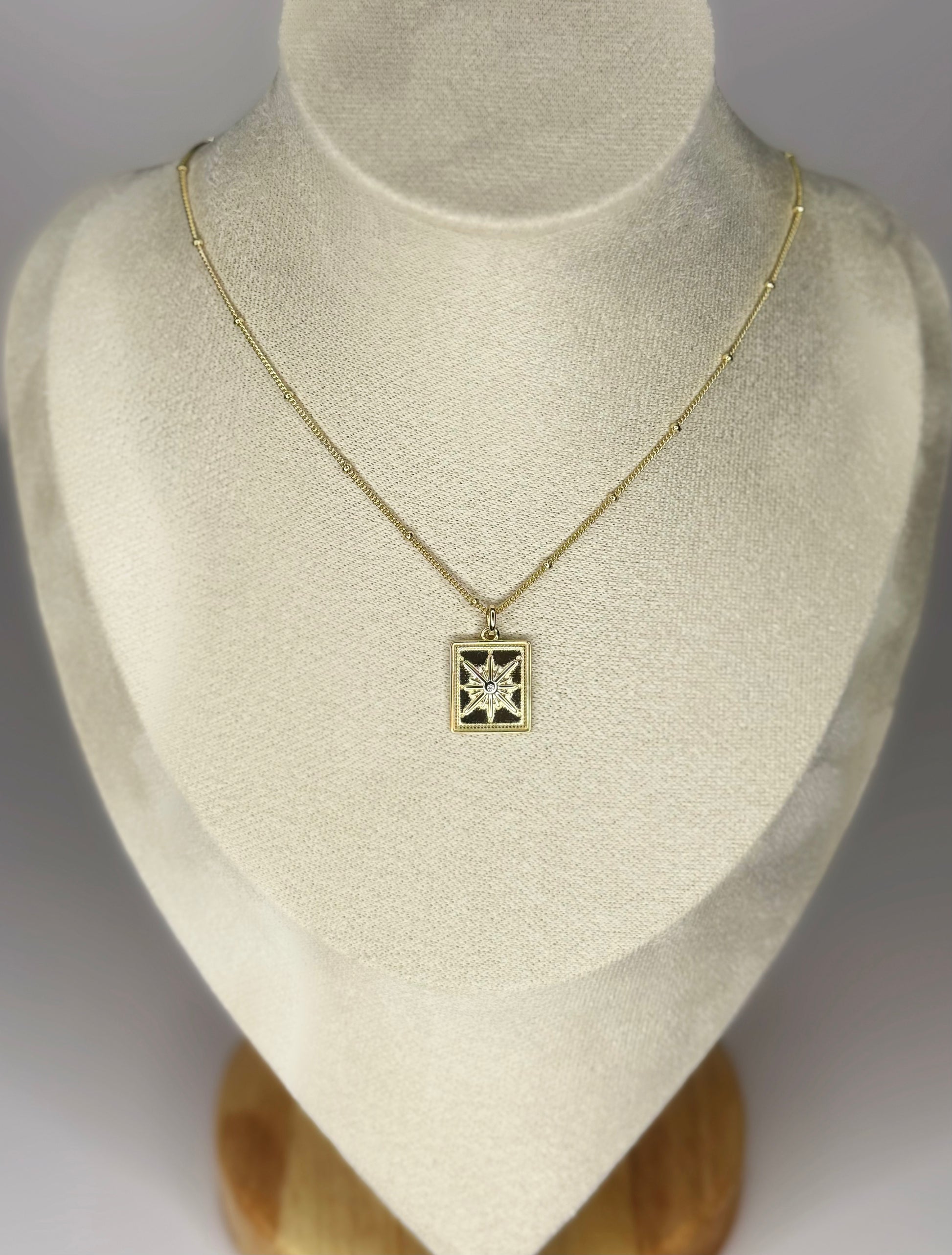 Illuminate your style with the Celestial Star necklace. This stunning piece features a unique square pendant adorned with a striking star design at its center, highlighted by a natural zircon stone that radiates brilliance. Complemented by a delicate beaded chain, this necklace adds a touch of celestial elegance to any outfit.