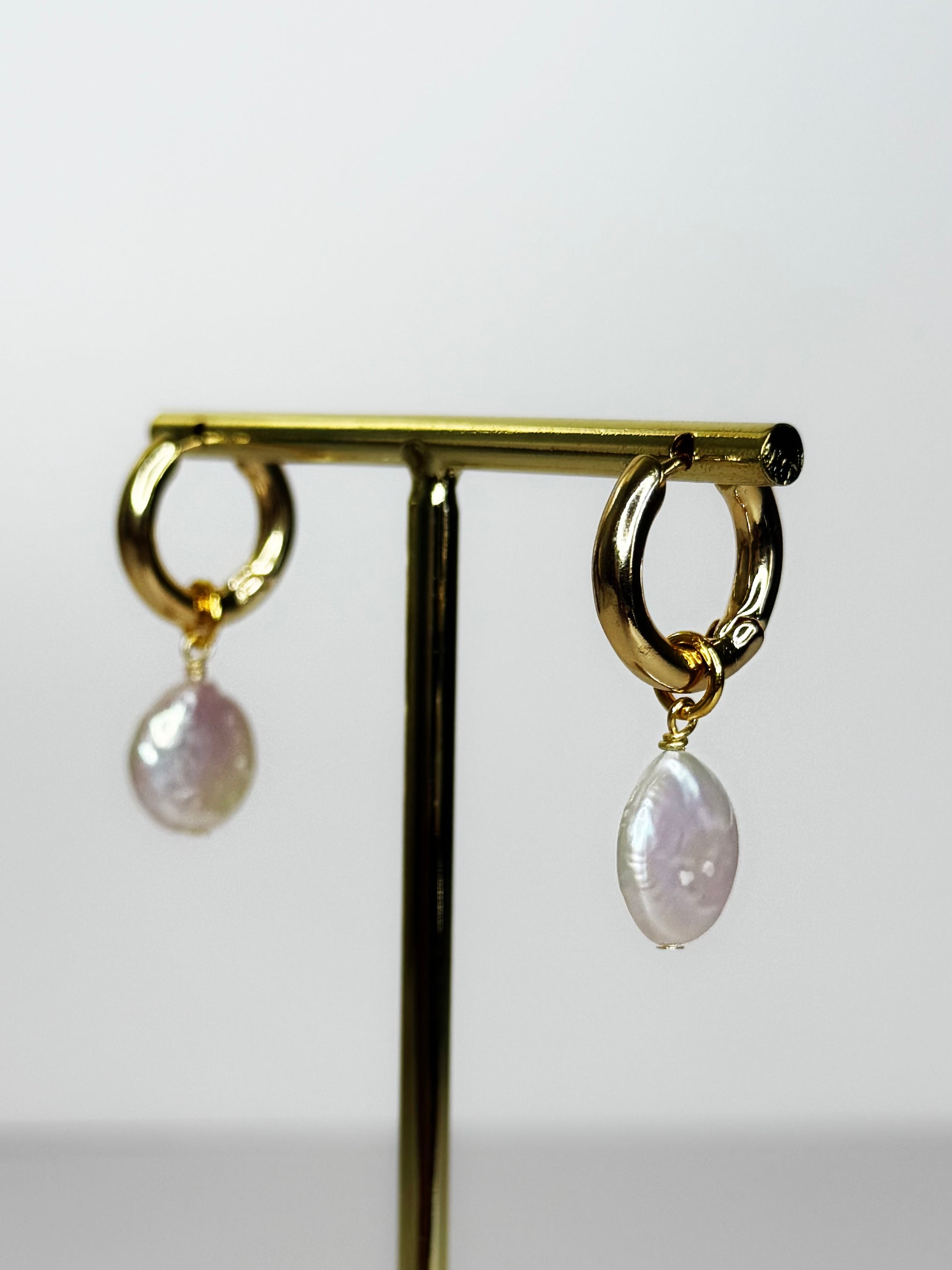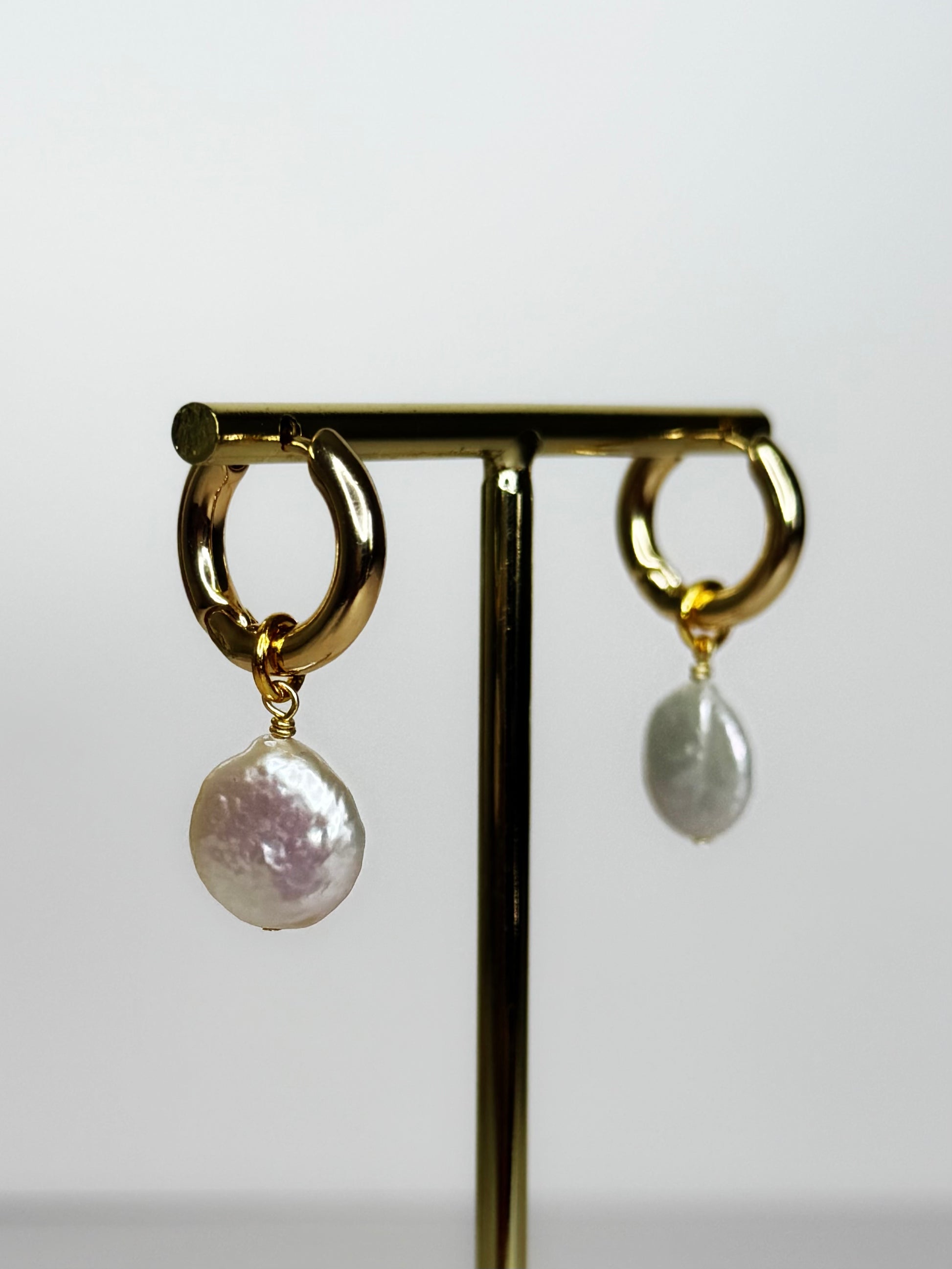 • Design: Chunky hoop design with a dangling coin freshwater pearls