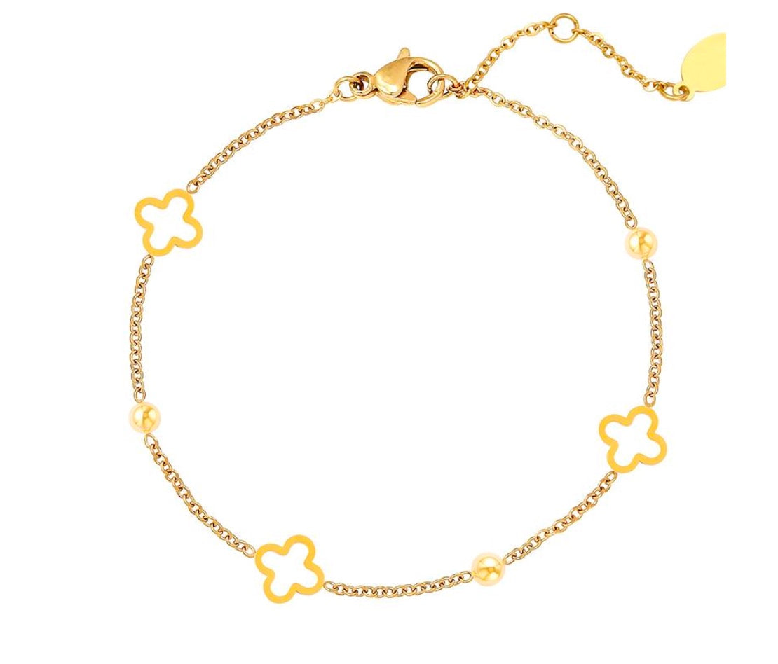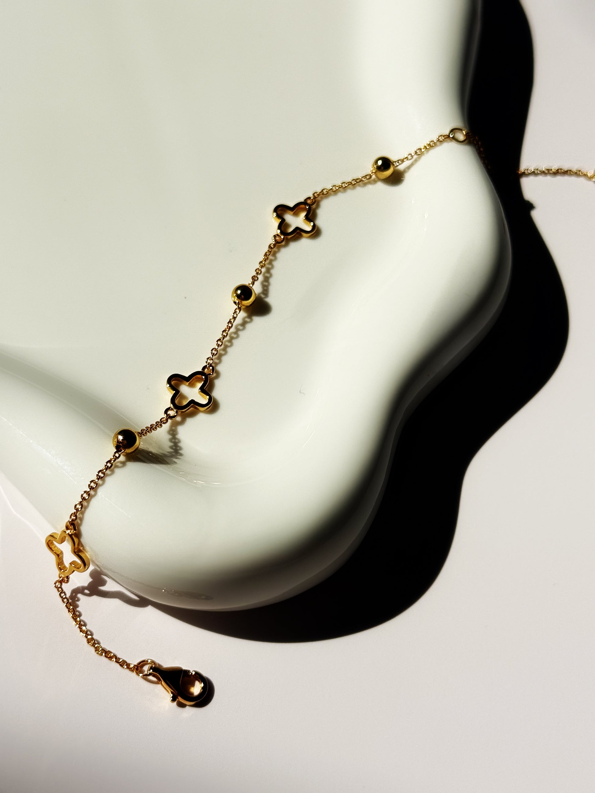 Bring a touch of luck and elegance to your everyday look with the Clover Charm bracelet. This delicate piece features a dainty clover charm nestled between golden ball accents along a fine gold vermeil chain. Its understated sparkle makes it a versatile accessory for stacking or wearing solo. With its timeless design and touch of whimsy, the Clover Charm bracelet is perfect for those who appreciate classic charm with a hint of good fortune.