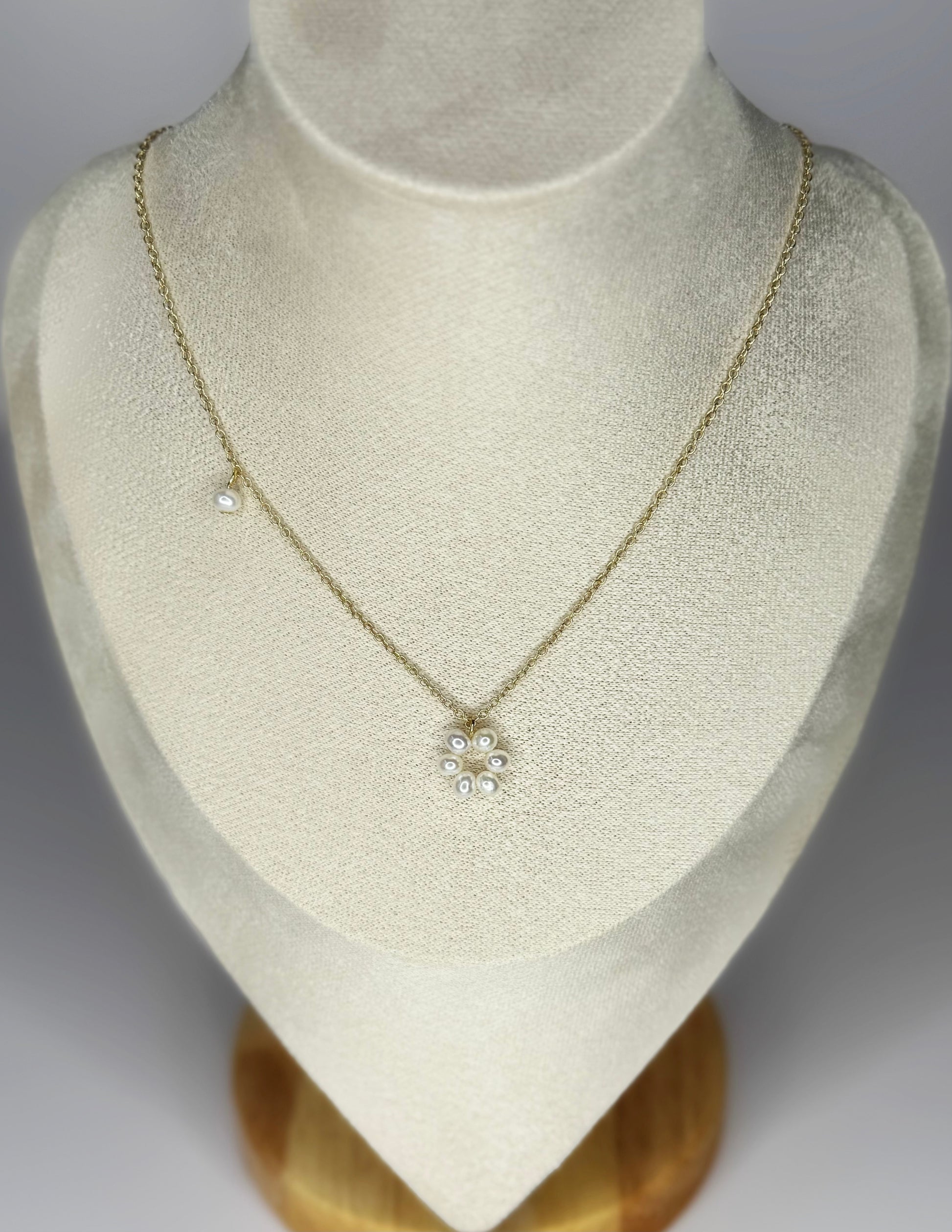 The Daisy Charm necklace is a delightful fusion of elegance and whimsy. Featuring a daisy pendant made from lustrous freshwater pearls, this charming piece is accentuated by a single pearl attached to the chain a few centimeters away. Measuring 16 inches with a 2-inch extender, it offers a perfect fit for any occasion, adding a playful touch to your jewelry collection.