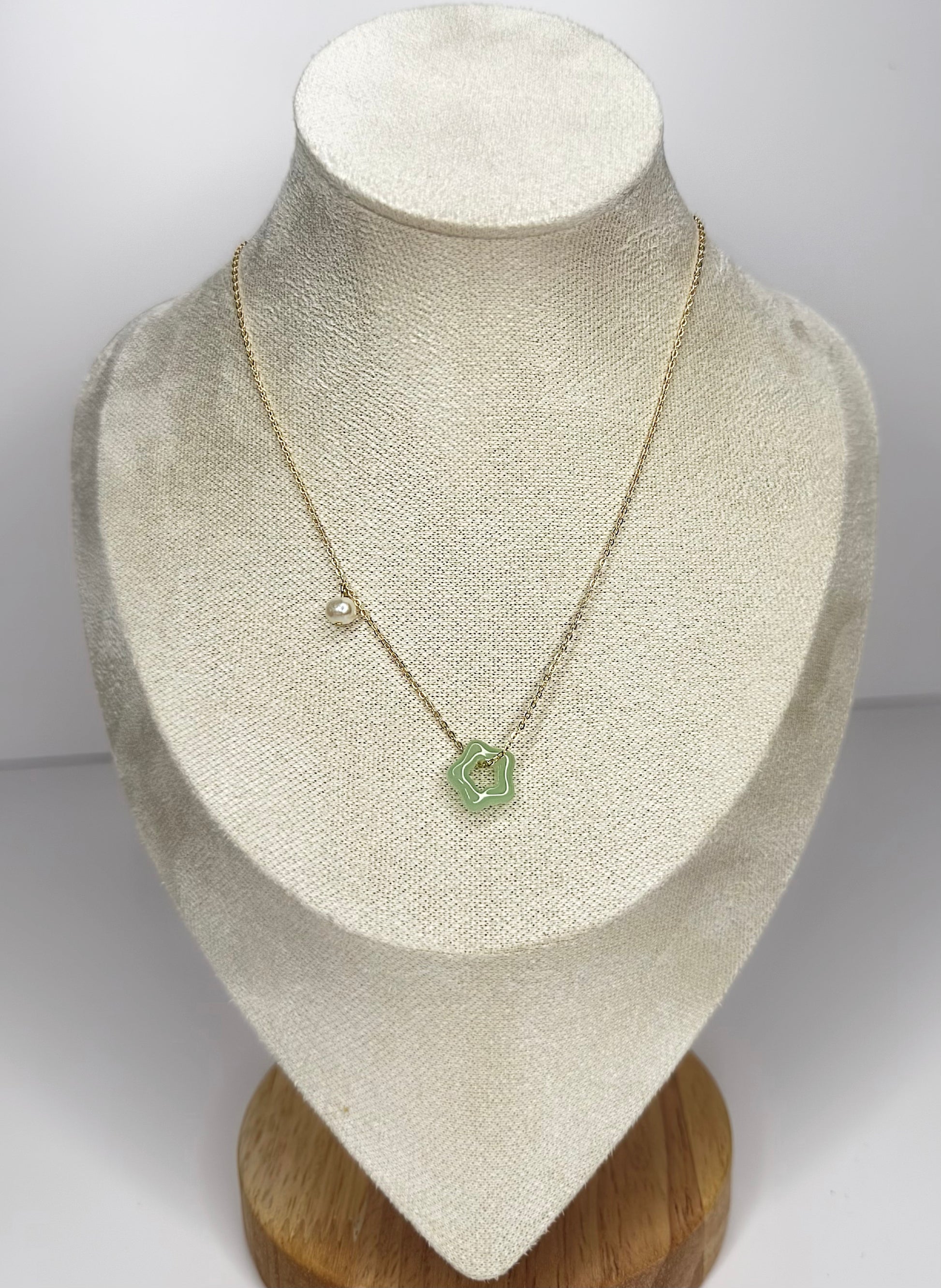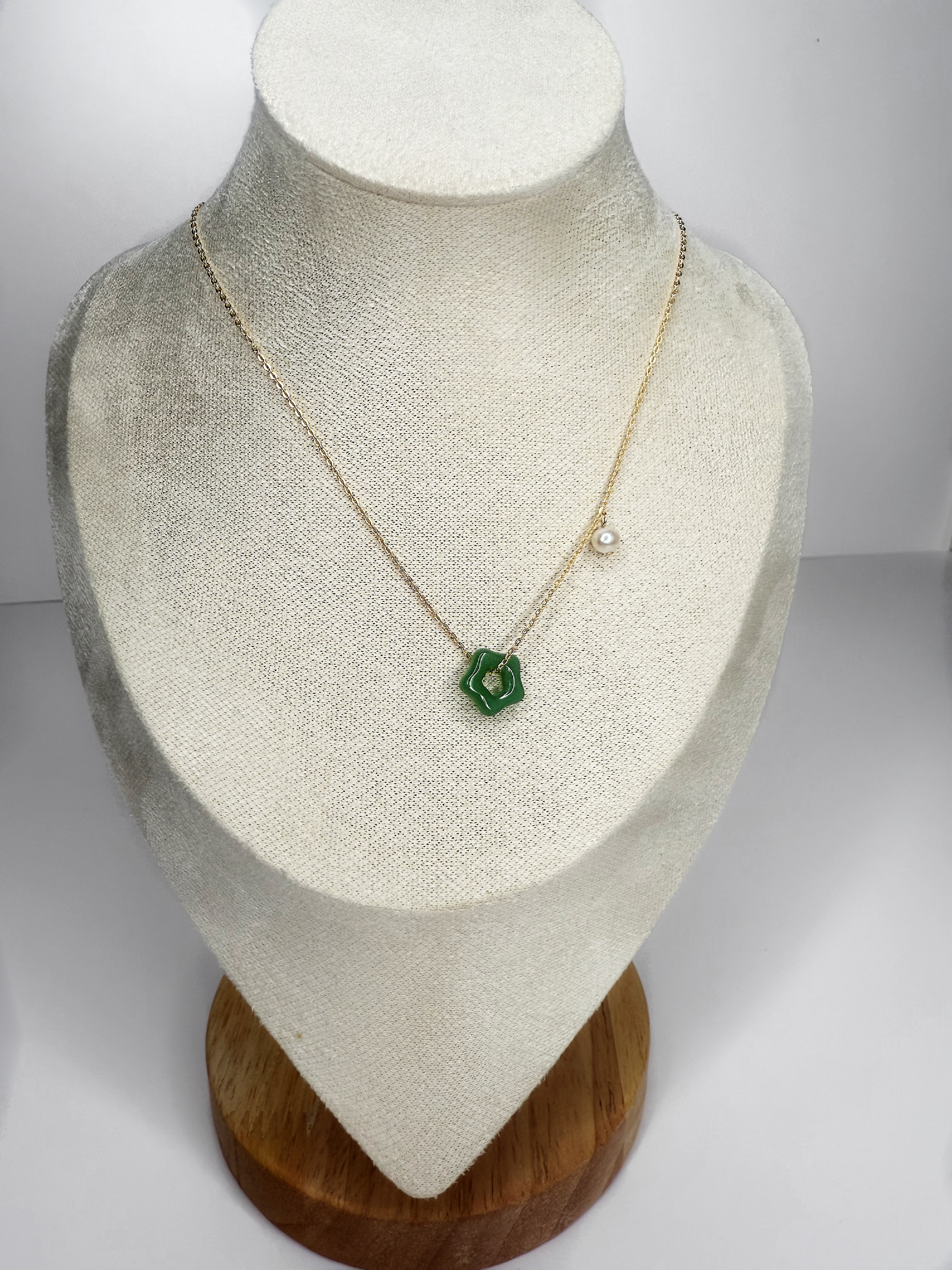 At the heart of the necklace is a stunning natural jade star pendant, symbolizing hope, guidance, and a sense of wonder. A single dainty freshwater pearl delicately rests beside the pendant, adding a touch of softness and elegance to the design.