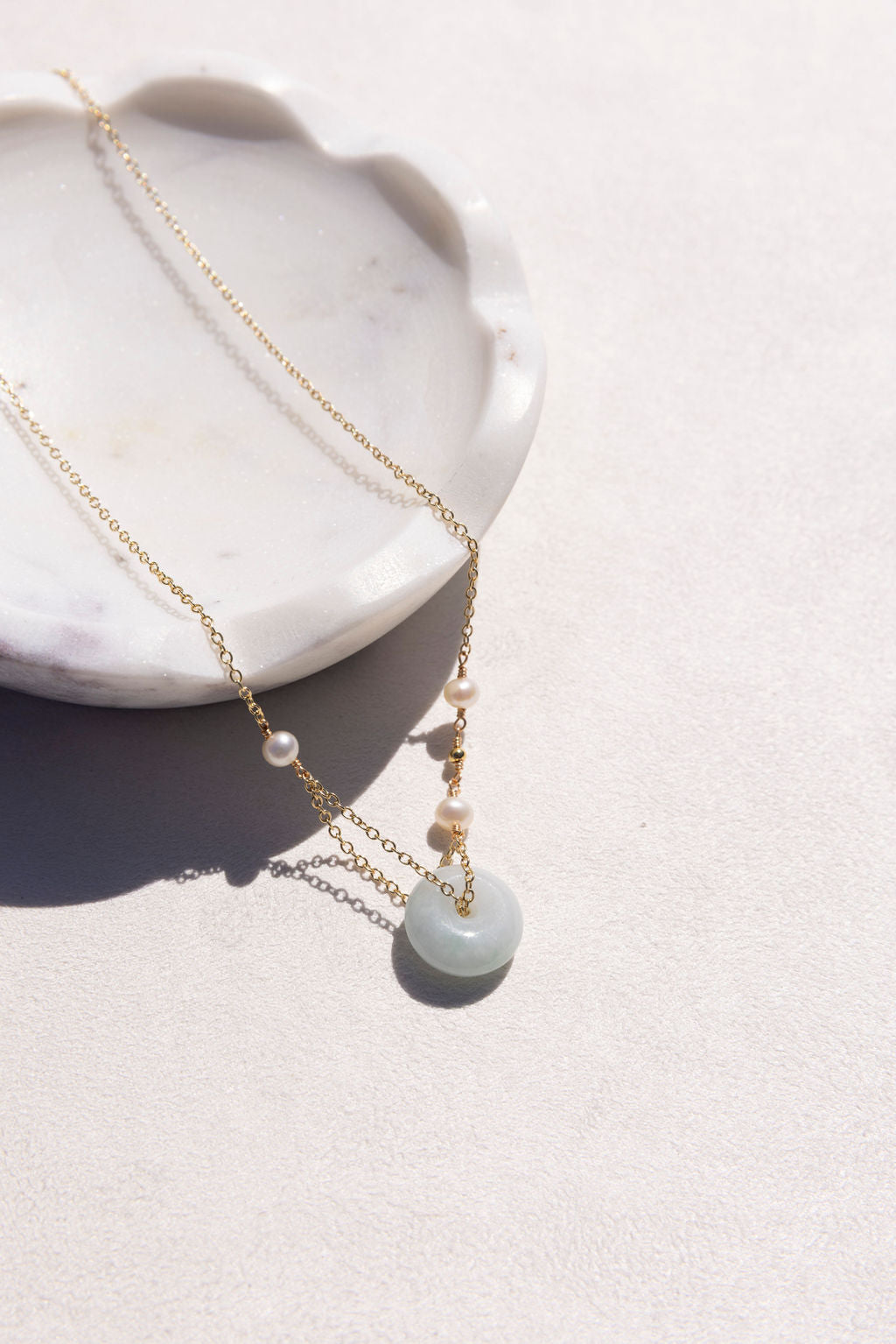 Crafted with 14k gold plating or 14k gold-filled, the necklace offers a timeless, refined look that effortlessly complements any style. Whether layered with other pieces or worn alone, the Elara Jade Necklace is a radiant expression of grace and harmony.