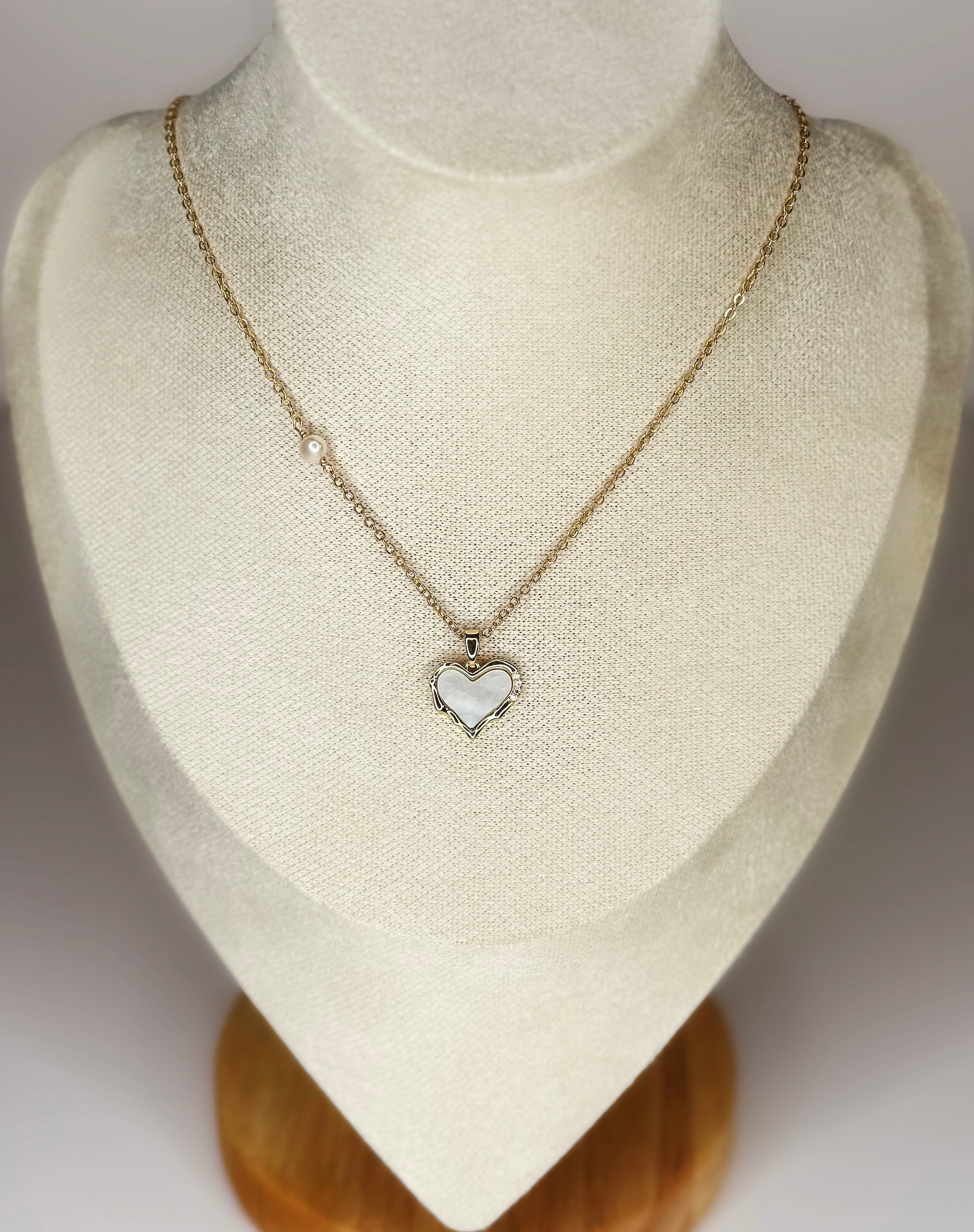 The Elysia Heart Necklace embodies elegance and sophistication, blending the timeless beauty of mother of pearl with a touch of sparkle. The heart-shaped pendant is crafted from lustrous mother of pearl, offering a smooth, iridescent glow that catches the light beautifully. Adorning one corner of the heart are micro-pave mini CZ diamonds, adding a refined, luxurious touch to the piece.