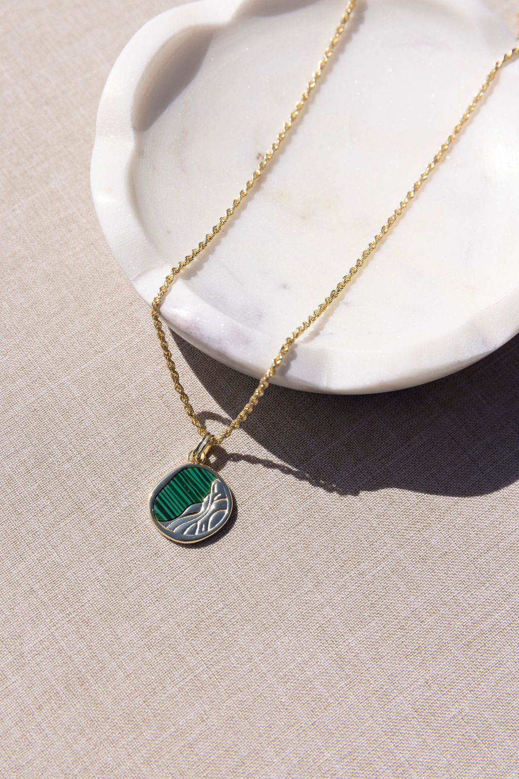 The Emerald Peaks necklace captures the essence of nature’s beauty with its striking design. Featuring a round gold vermeil pendant, one half showcases a rich malachite stone, while the other half presents a serene mountain-inspired image. Crafted from 18k gold vermeil over sterling silver, this piece adds a vibrant touch to your jewelry collection.