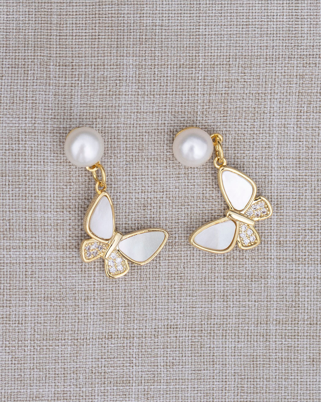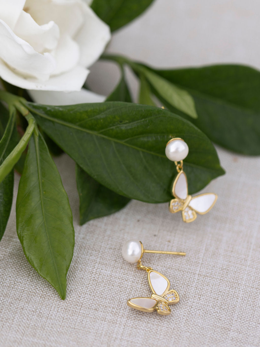 - Design: Butterfly earrings with a fresh water pearl drop, featuring a half pearl shelling top and CZ diamond bottom
