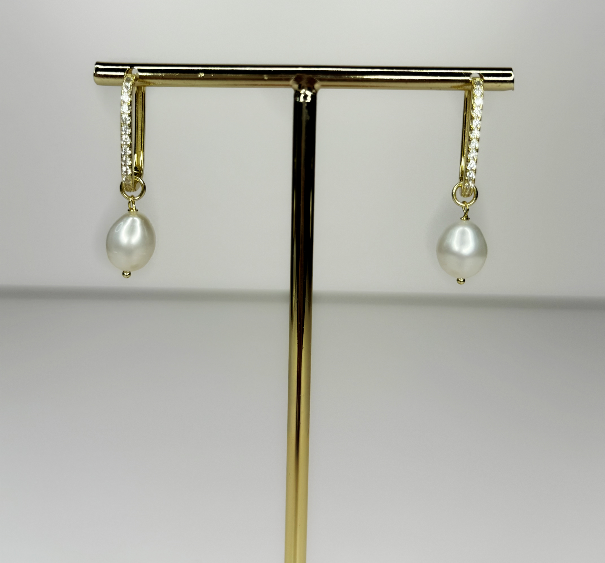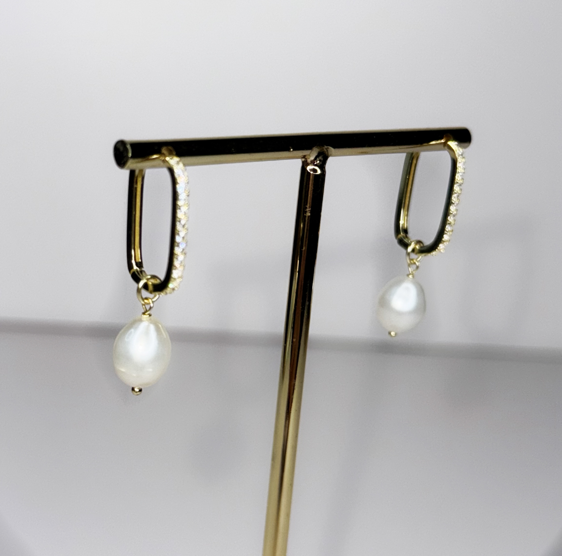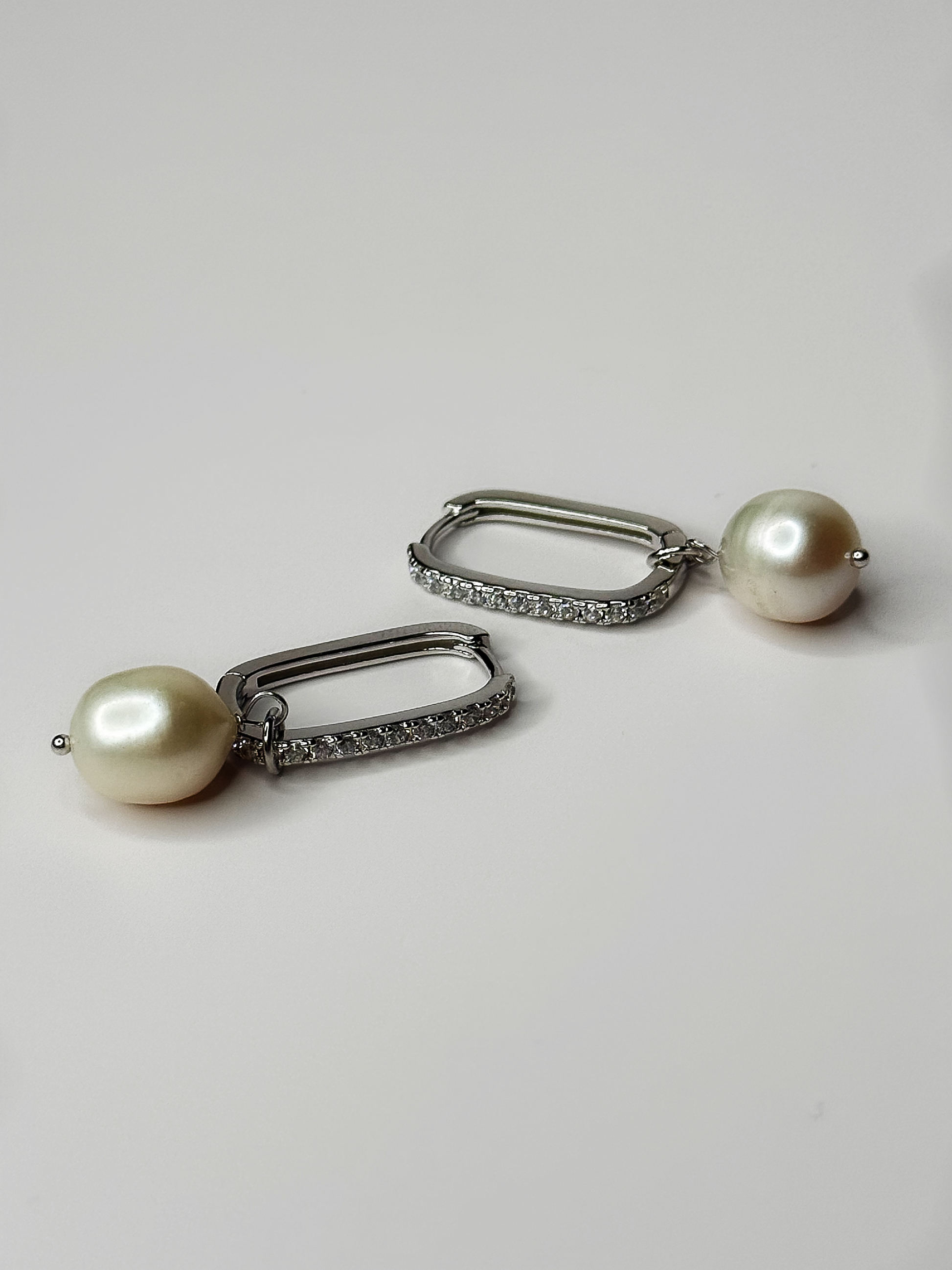 A symbol of timeless beauty, the Eternal Pearl earrings feature an elegant, curved rectangular hoop design adorned with shimmering natural zircon stones. Suspended gracefully from the bottom is a radiant freshwater pearl, offering a sophisticated contrast to the brilliance of the zircons. Unlike cubic zirconia, zircon is a natural gemstone prized for its dazzling brilliance and range of colors, giving these earrings a luxurious sparkle. Perfect for any occasion, these earrings embody elegance with a modern twist.