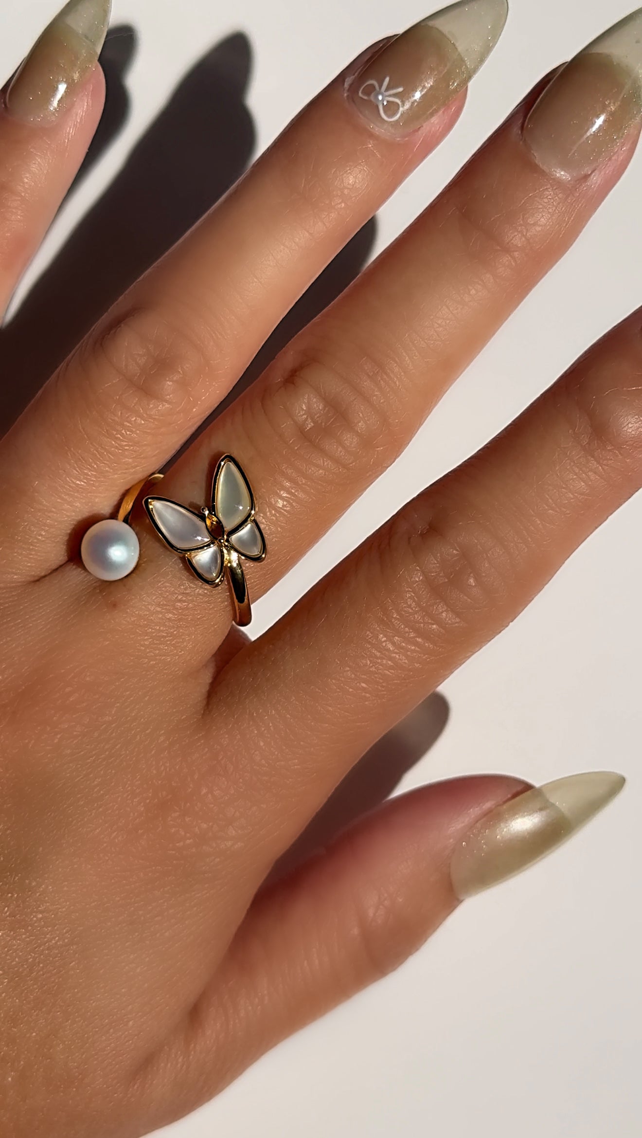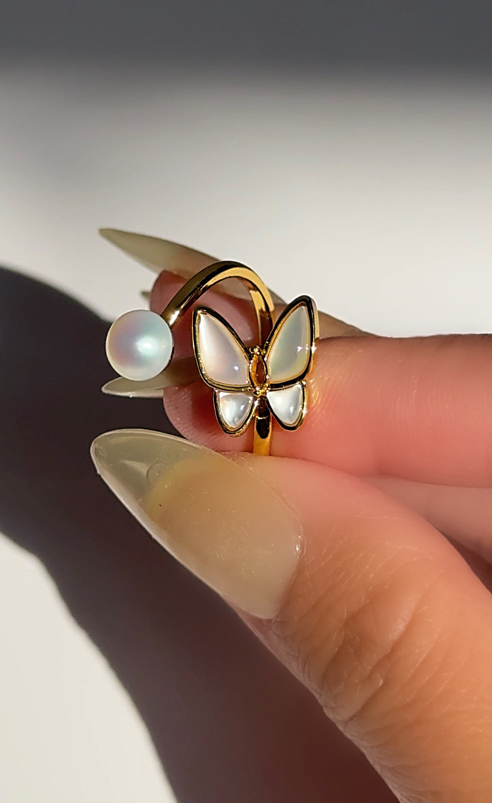 Delicate and luminous, the Flutter Ring captures the graceful beauty of nature in motion. This open wrap-style ring features a carved mother-of-pearl butterfly on one end, and a single freshwater pearl on the other—symbolizing transformation, peace, and feminine energy.