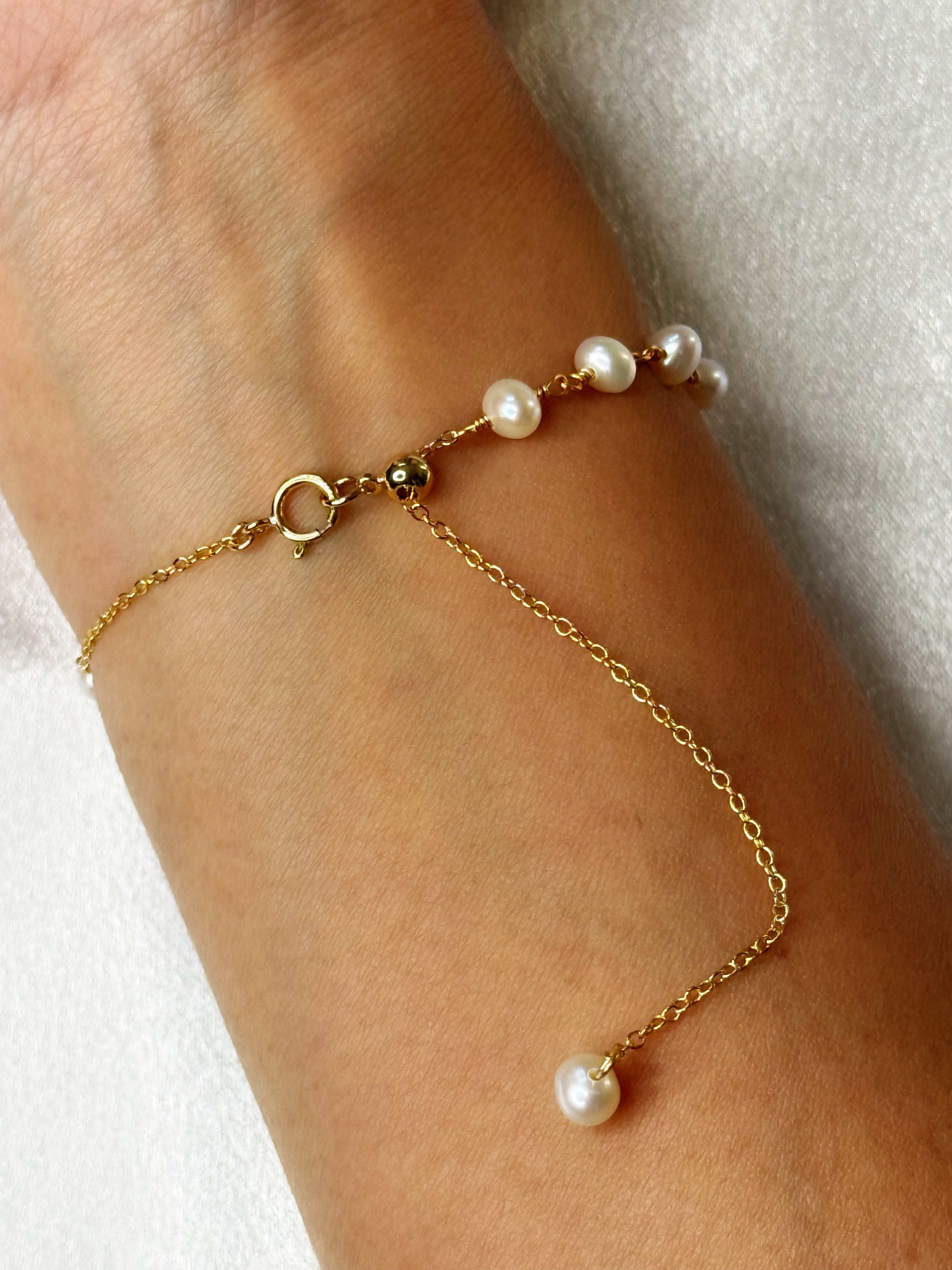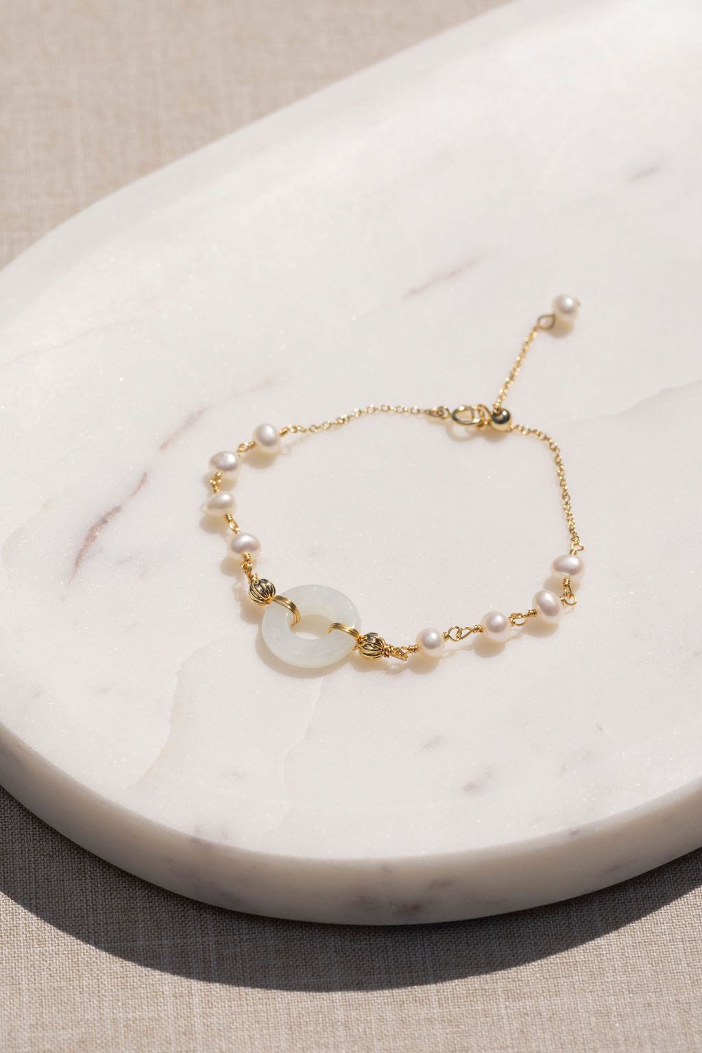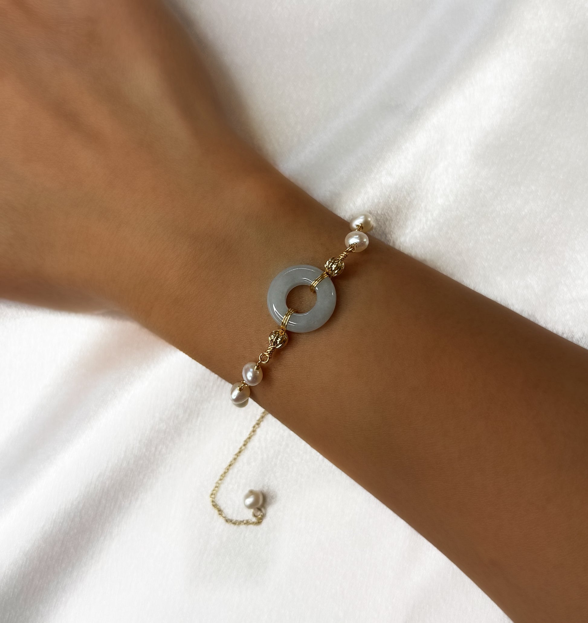 The Glistening Jade bracelet beautifully combines the elegance of jade and the lustrous shine of pearls. At its center lies a stunning jade stone, flanked by delicate freshwater pearls that are thoughtfully spaced along a gold chain, creating a harmonious balance of color and texture. The adjustable chain, featuring a sleek gold ball for easy customization, allows you to find the perfect fit. This bracelet is not only a statement piece but also a reflection of grace and serenity, making it an ideal accessory for any occasion.