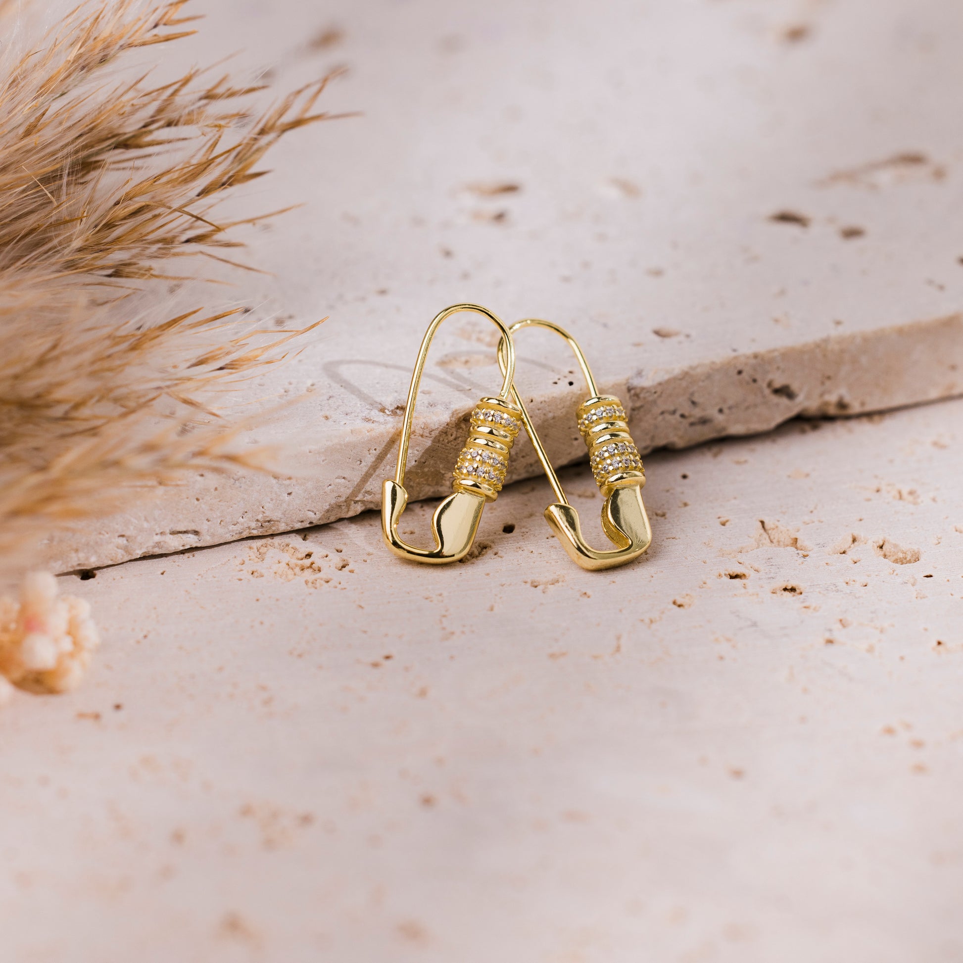 Elevate your accessory game with the Luminous Hold earrings, a striking blend of elegance and modern design from our gold vermeil collection. Inspired by the classic safety pin, these earrings feature a chic gold paperclip silhouette adorned with shimmering zircon stones that catch the light with every movement. The unique design seamlessly combines playful sophistication with a touch of edge, making these earrings the perfect statement piece for both everyday wear and special occasions.