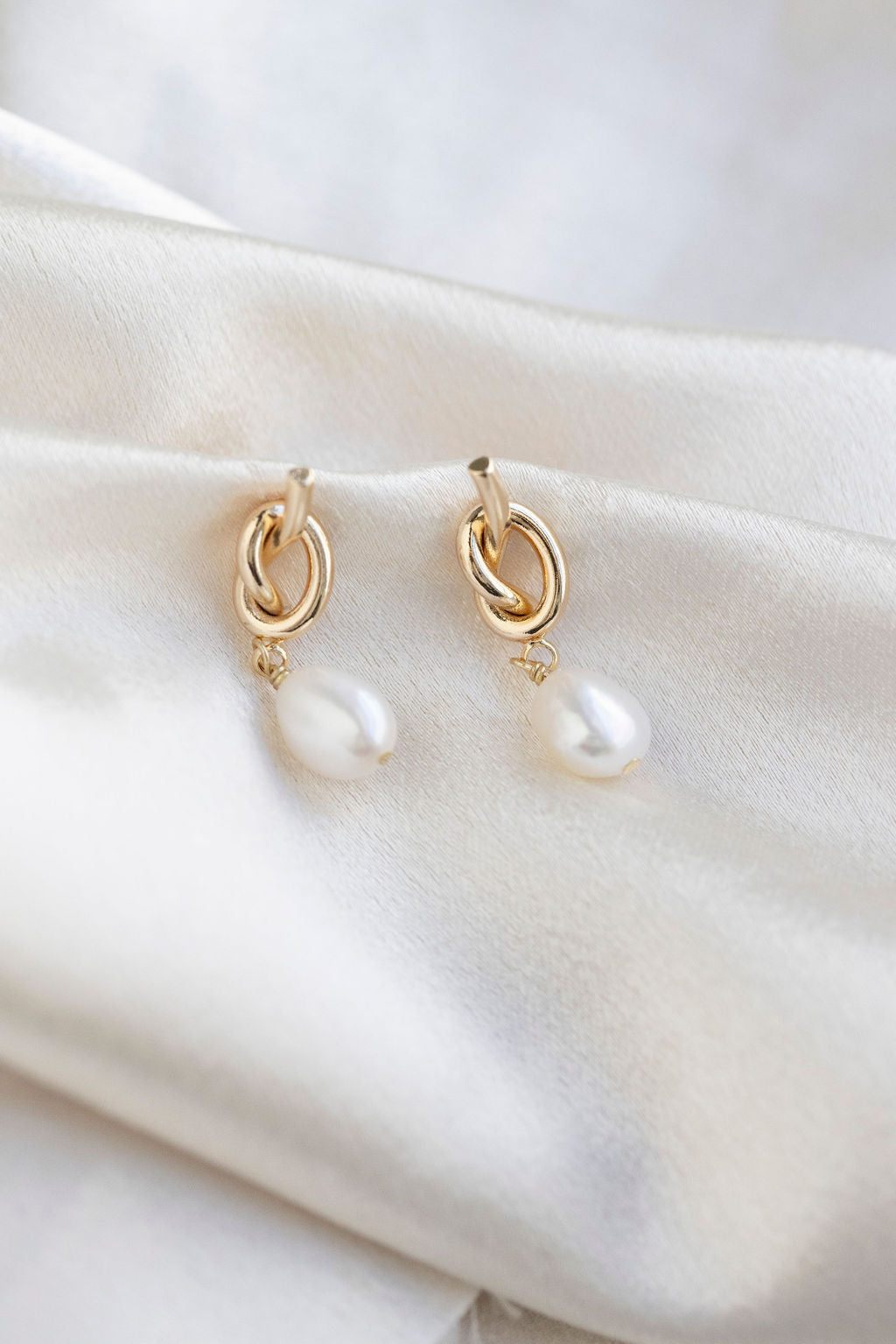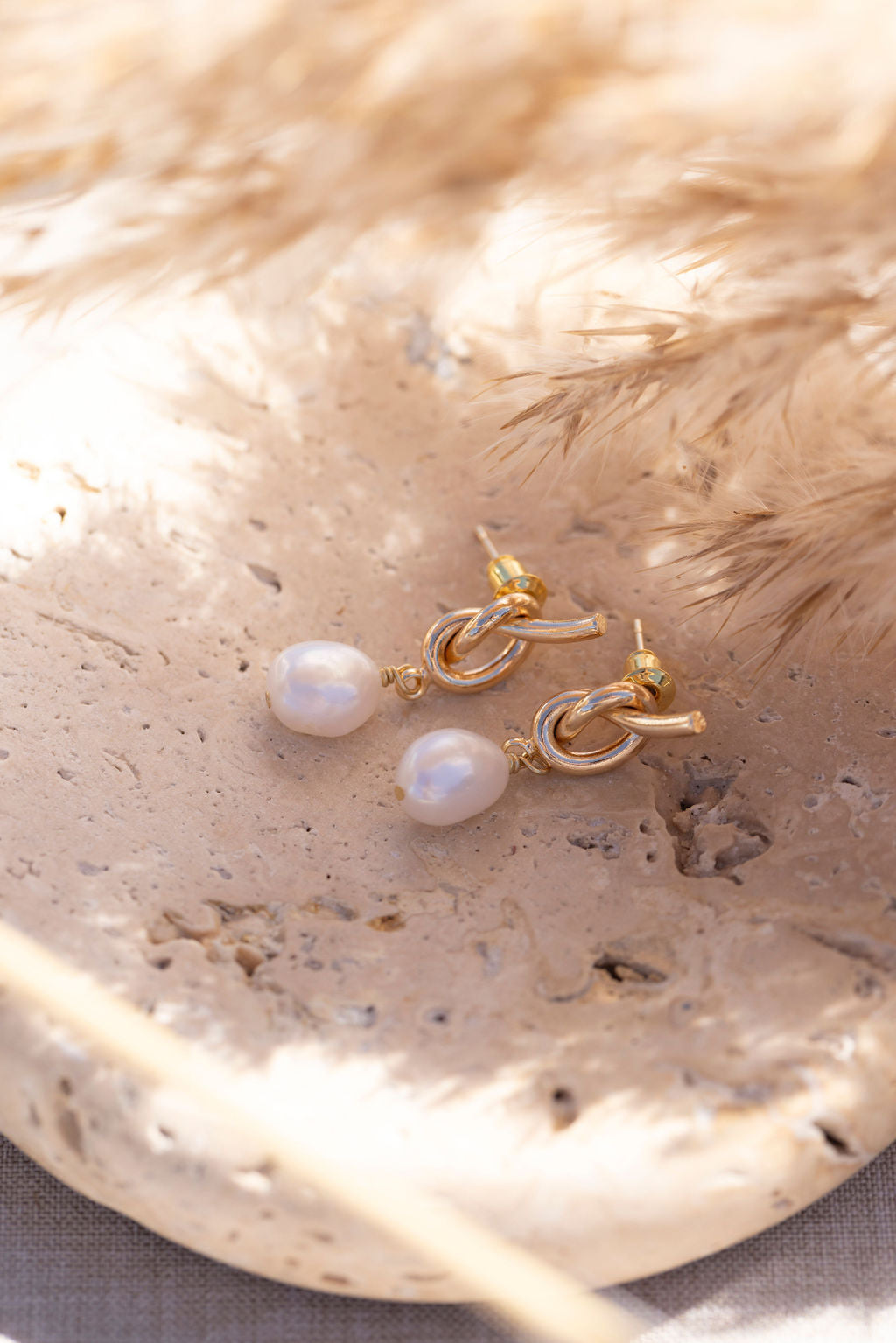 Embrace timeless elegance with the Golden Knot earrings, featuring a delicate gold knot design that symbolizes unity and grace. A lustrous freshwater pearl gently hangs from the knot, adding a touch of sophistication to this modern, minimalist style. These earrings are perfect for day-to-night transitions, blending the simplicity of gold with the natural beauty of pearls for an effortlessly chic look.