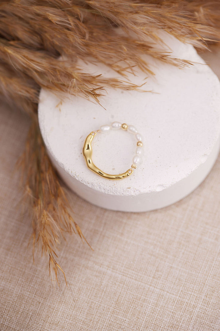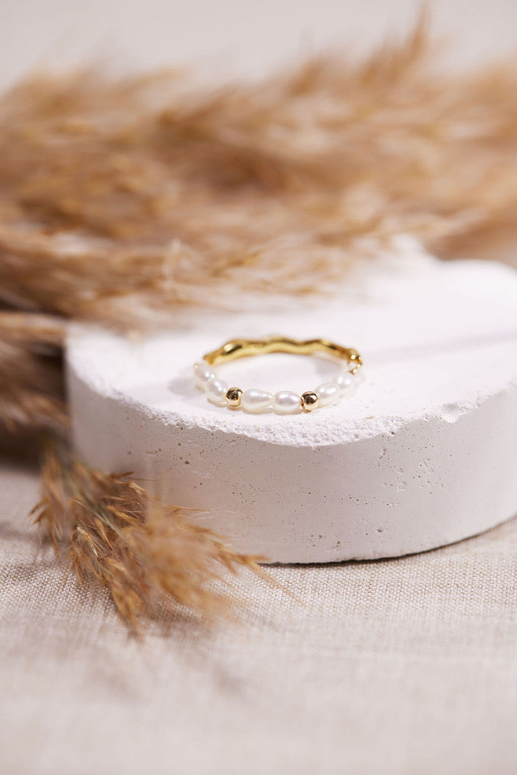 Introduce a touch of elegance to your jewelry collection with the Sunlit Wave Ring. This stunning piece showcases a unique design featuring a stretchable material that elegantly intertwines elongated freshwater pearls, all enhanced by the warmth of gold plating. The ring's design is accented with gleaming gold balls, adding a sophisticated flair that complements the natural beauty of the pearls.