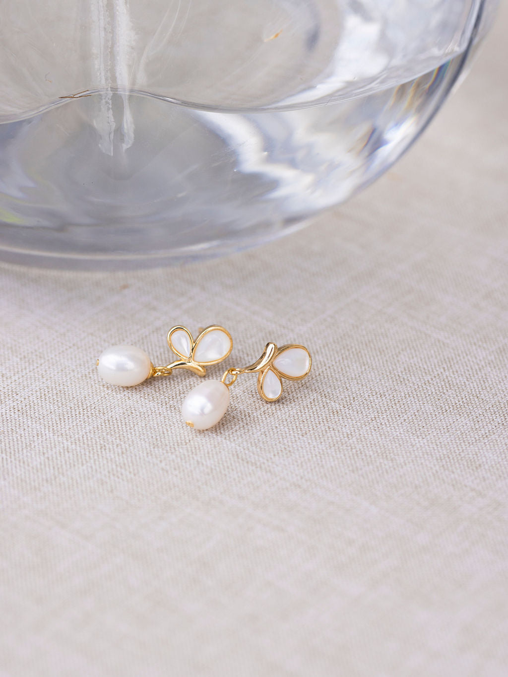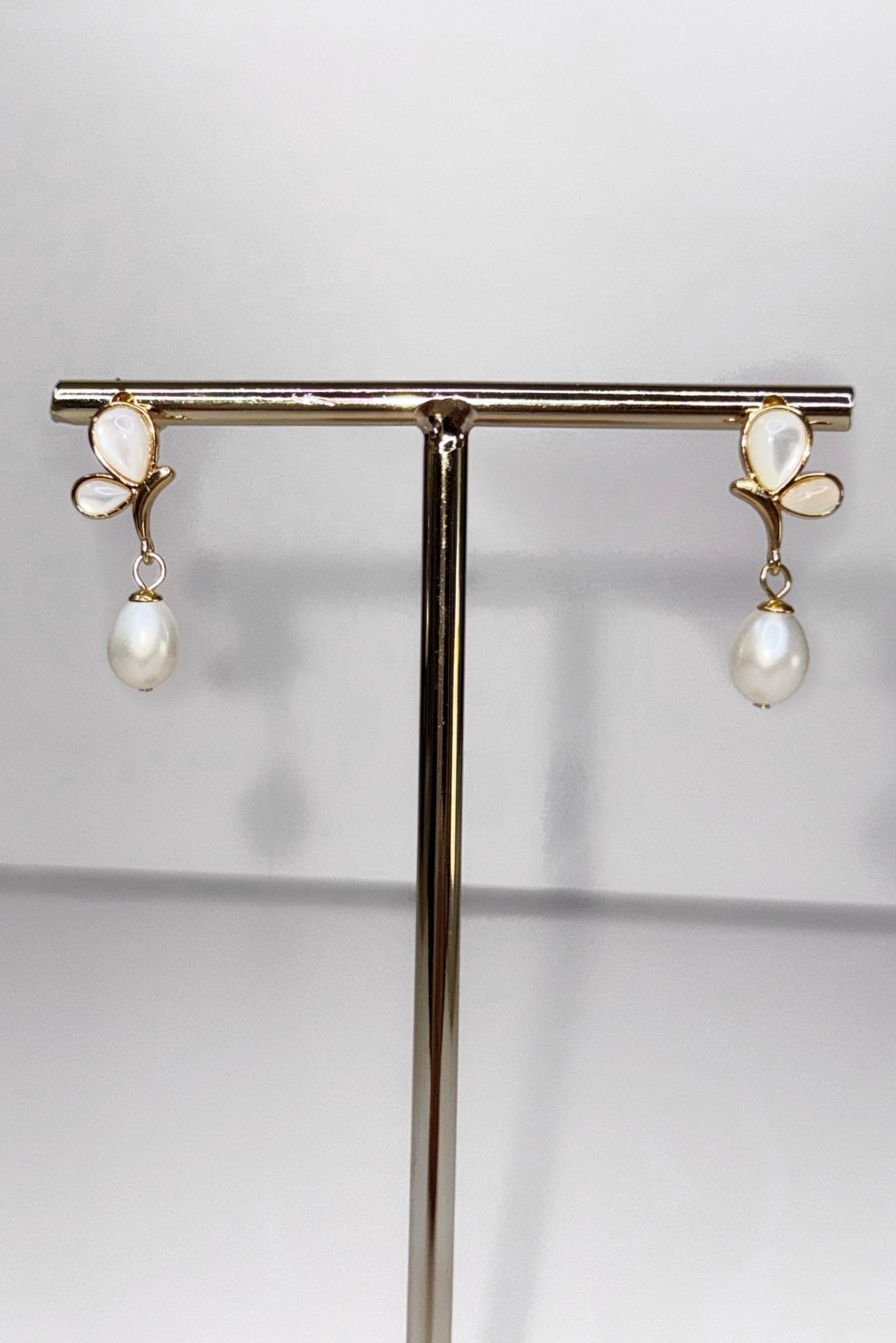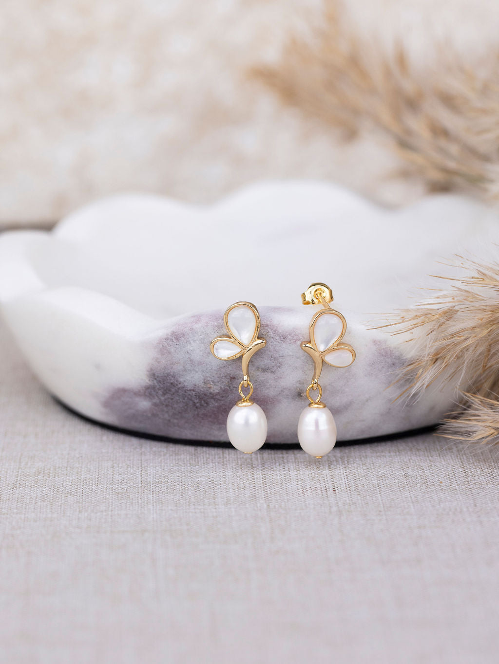 Elegantly capturing the delicate beauty of butterflies, the Graceful Flight earrings are designed to add a touch of whimsical charm to your look. Each earring features a single butterfly in flight, crafted from lustrous pearl shell, holding a freshwater pearl that dangles gently with every movement. The gold-plated finish adds a warm, timeless glow, making these earrings a perfect blend of sophistication and nature-inspired grace.