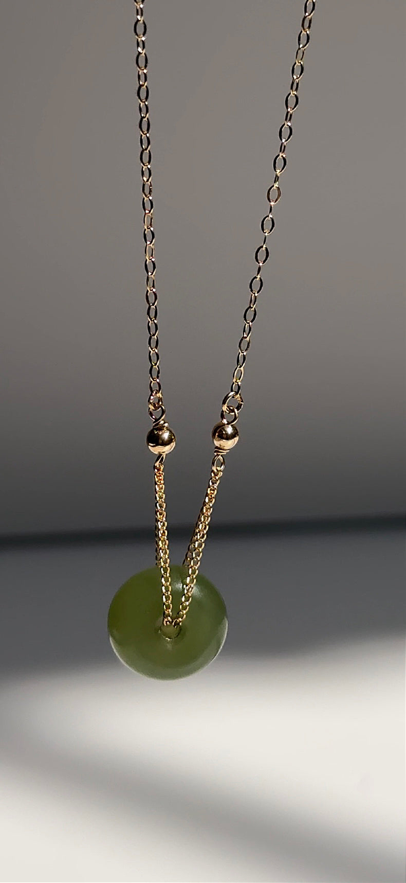 Graceful, balanced, and rooted in natural beauty — the Hana Jade Necklace is a timeless expression of feminine strength and serenity. Featuring a petite natural jade button pendant, this design is elevated with dual gold-filled chains on each side, joined by elegant golden ball accents and flowing into a single, delicate strand for a dimensional, modern silhouette. Crafted with a 14k gold-filled chain, the Hana necklace is waterproof, non-tarnish, and hypoallergenic, making it perfect for 24/7 wear — from morning rituals to evening elegance. In Chinese culture, jade symbolizes harmony, protection, and prosperity. Worn close to the heart, it’s believed to bring balance, positive energy, and spiritual wellness — a perfect piece for those who value beauty with intention.