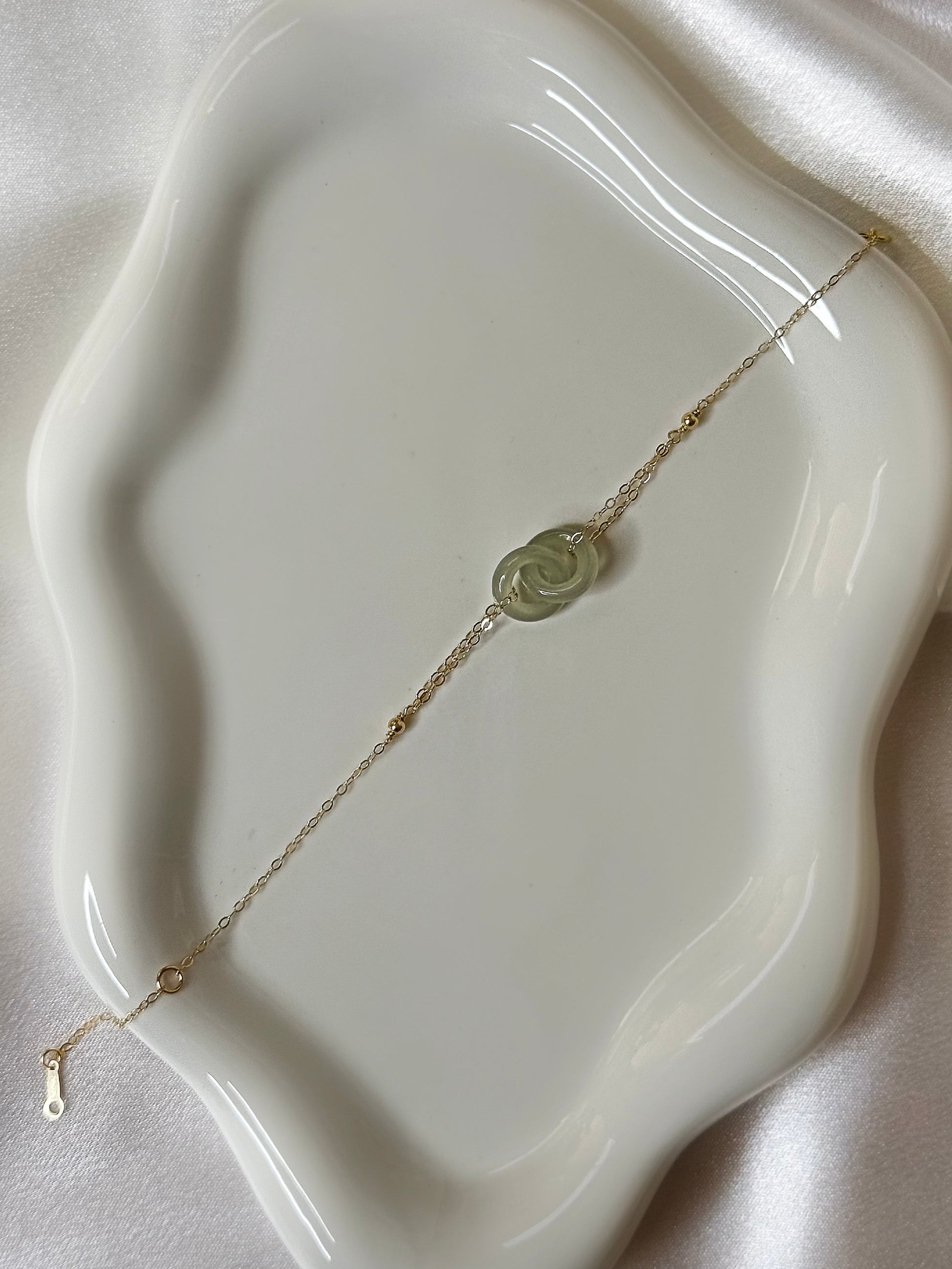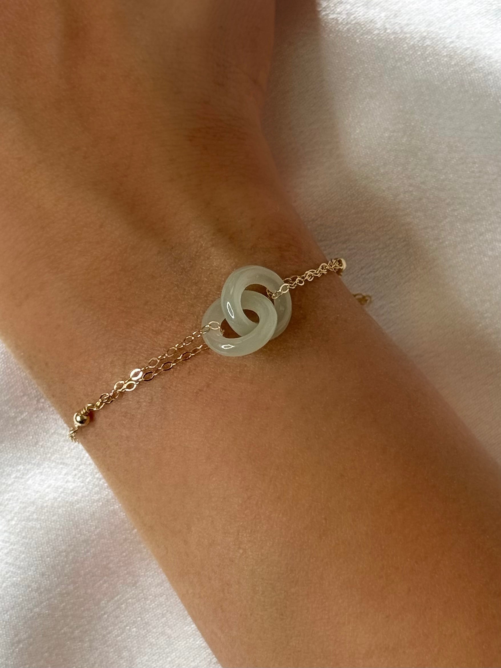 The Harmony Links Bracelet is a timeless piece from our gold-filled collection, celebrating balance and unity. Its delicate gold chain highlights the centerpiece: two natural jade rings interlinked to symbolize connection and harmony. Secured by double gold-filled links on each side, this bracelet is designed to be as meaningful as it is beautiful.