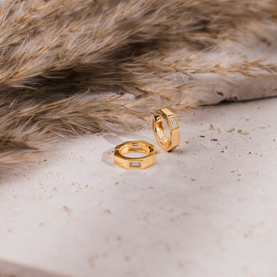 Add a geometric touch to your style with the HexaGlow Earrings from our LunaLuxe Gold Vermeil collection. These sleek, hexagon-shaped earrings are crafted from premium gold vermeil, offering a modern yet timeless appeal. A dazzling natural zircon stone is set on one side of the hexagon, catching the light with every movement. Perfect for elevating your everyday look or complementing a sophisticated evening outfit, these earrings are designed to shine effortlessly.