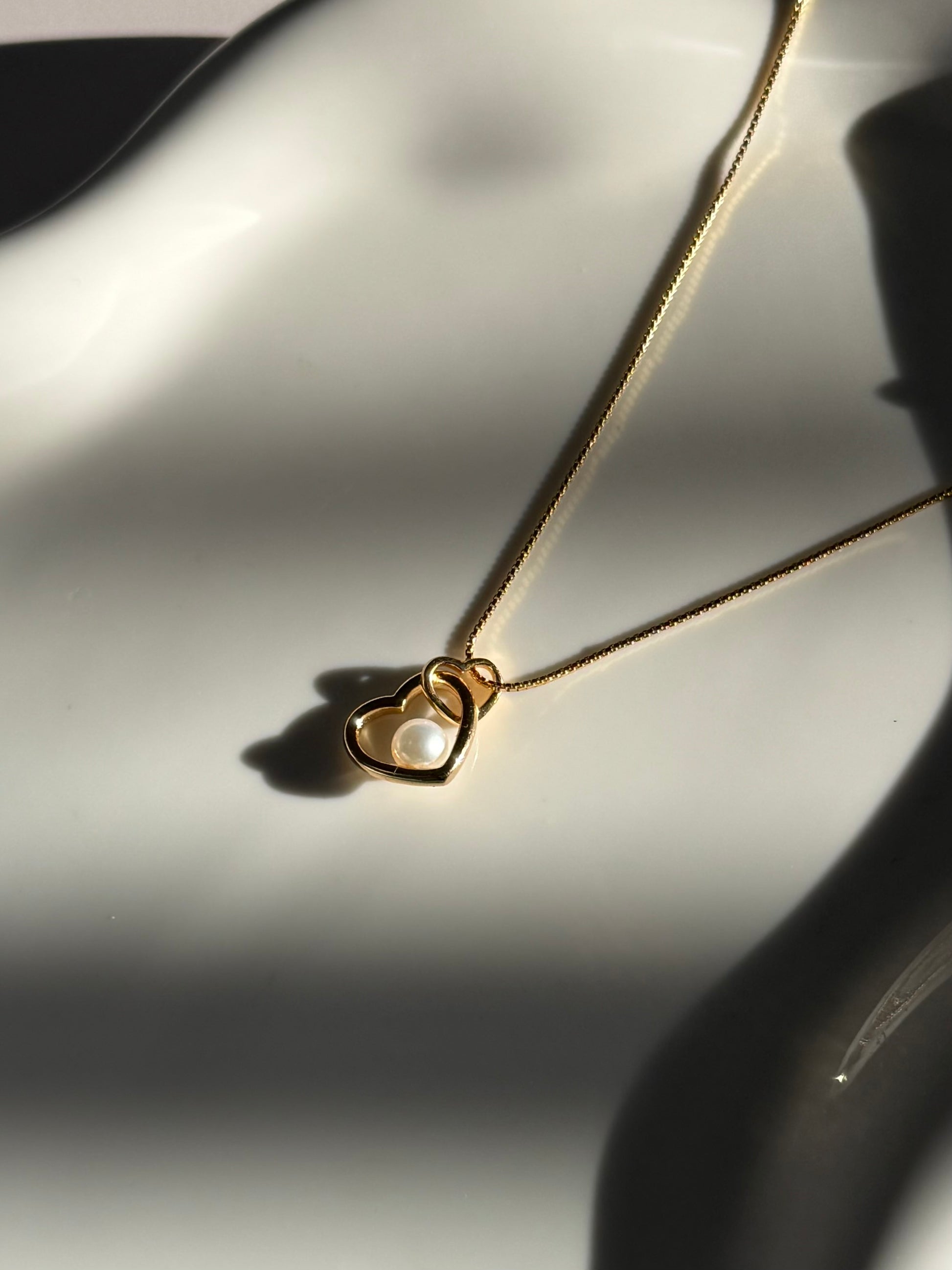 At its center, an open gold heart pendant serves as a delicate symbol of love and connection. Nestled inside is a single lustrous freshwater pearl, representing purity and wisdom. A mini golden heart interlocks seamlessly with the larger heart, adding a subtle yet meaningful touch.