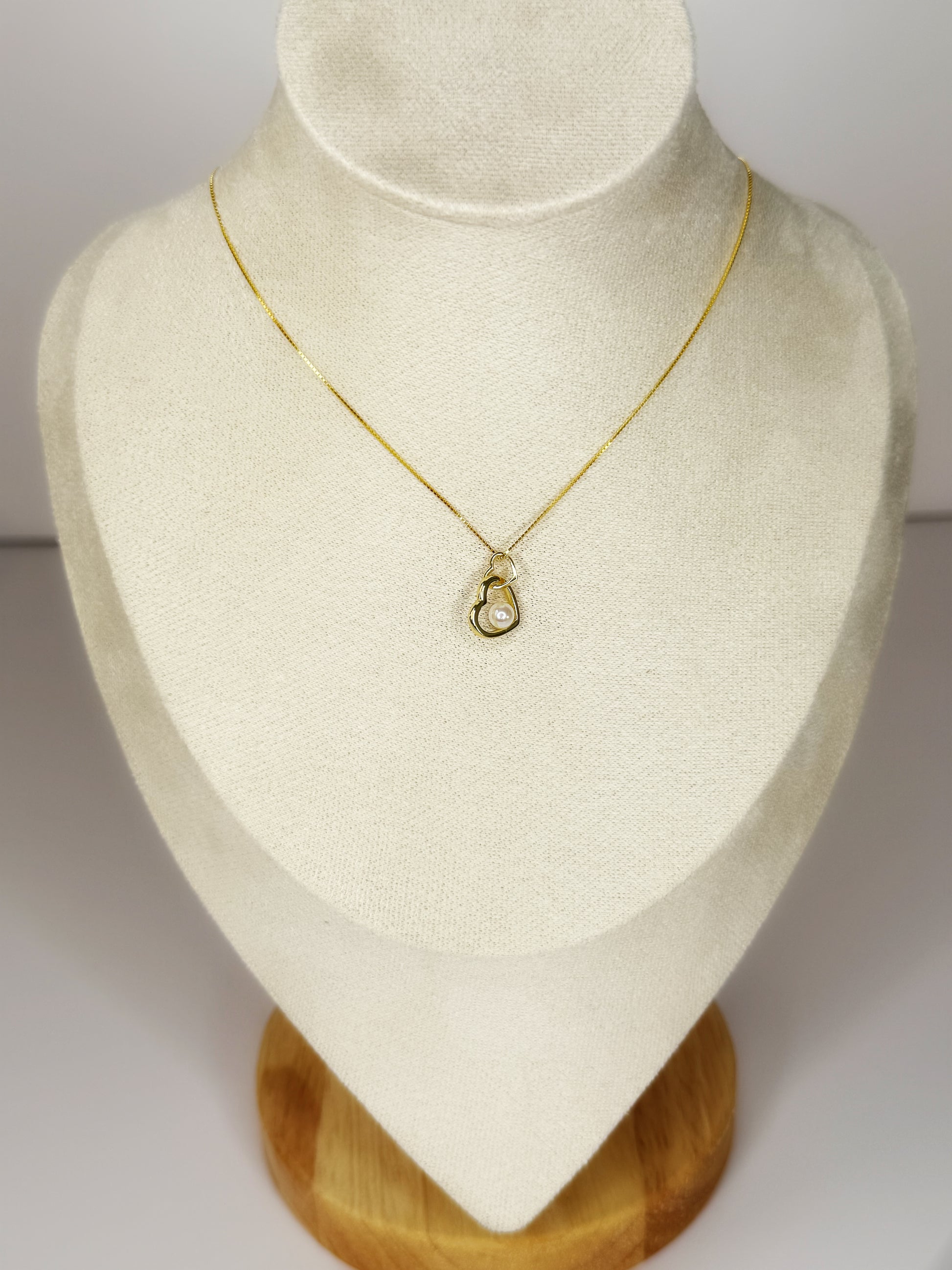 • Pendant: Open gold heart with a freshwater pearl and an interlocked mini golden heart