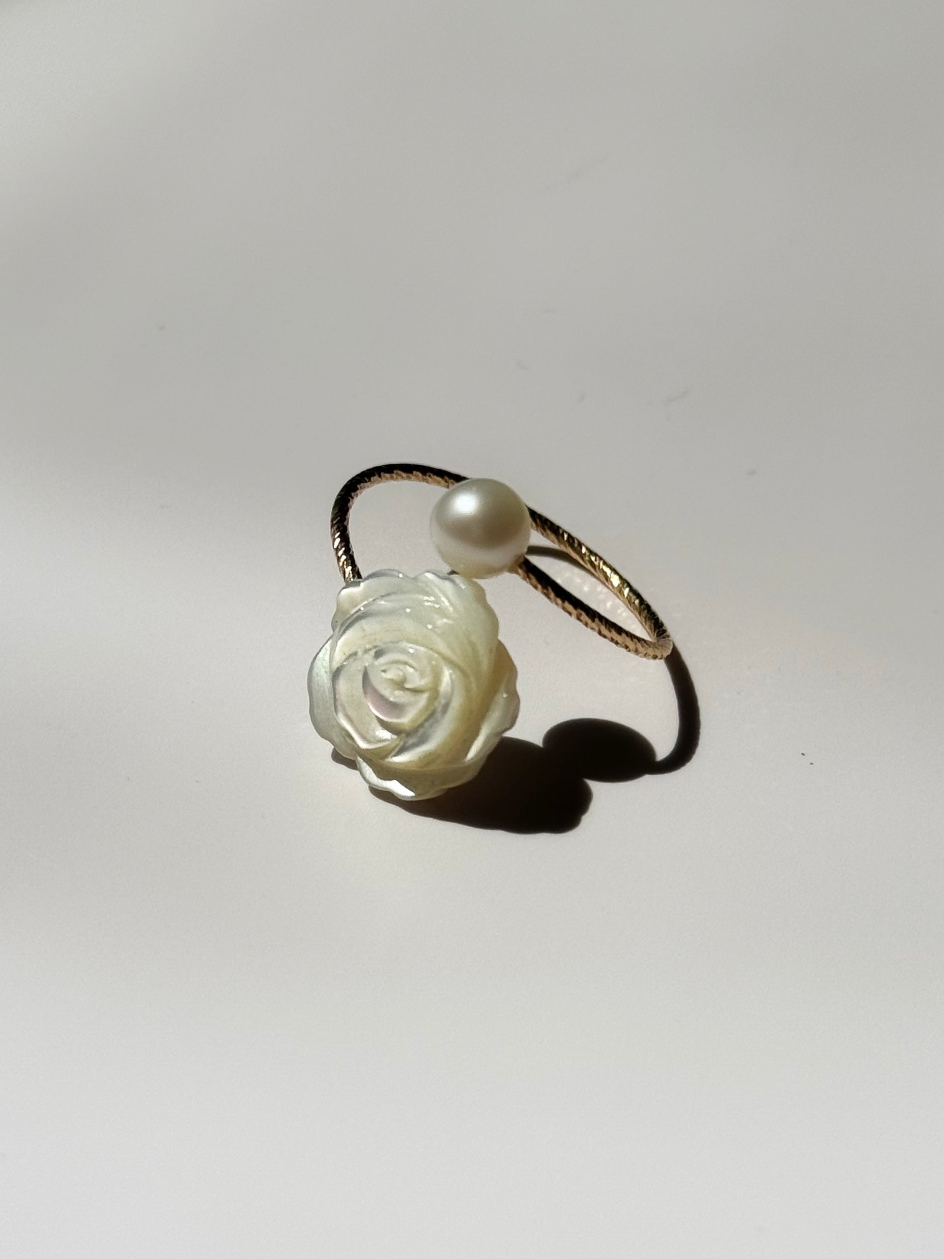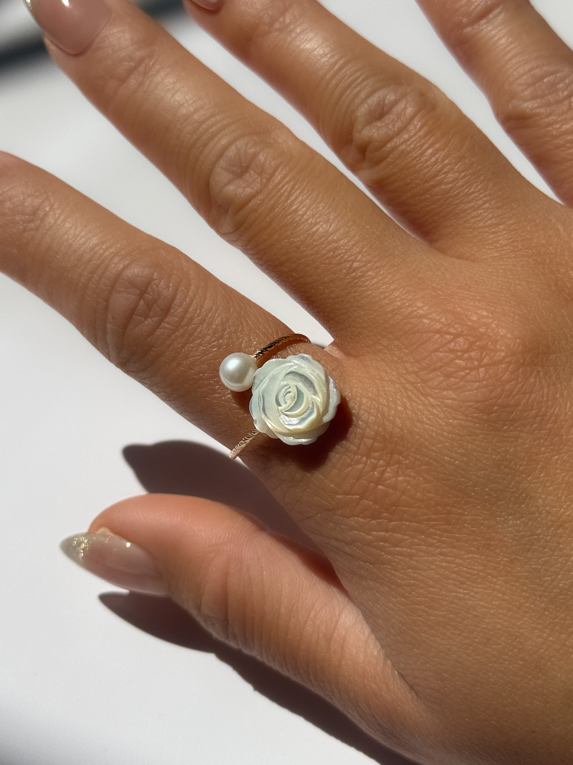 A delicate dance between floral charm and timeless elegance. The Ivory Bloom Ring features a glowing freshwater pearl paired with a beautifully hand-carved white rose made from genuine mother of pearl. Set on a slender 14k gold filled adjustable band, this ring wraps around your finger like a gentle embrace—perfect for stacking or wearing solo as a romantic statement piece.