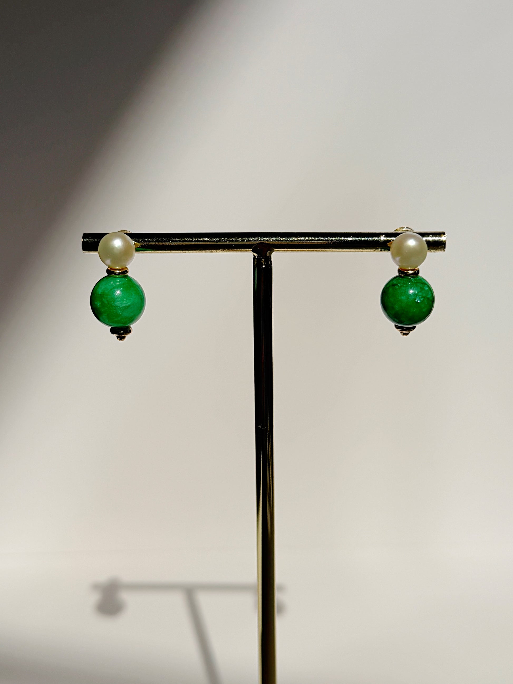 Discover the enchanting beauty of nature with the Jade Dewdrop earrings. These exquisite earrings feature a delicate mini freshwater pearl, gracefully paired with a striking darker green jade stone ball. The harmonious combination of these two natural elements creates a look that is both elegant and grounding.