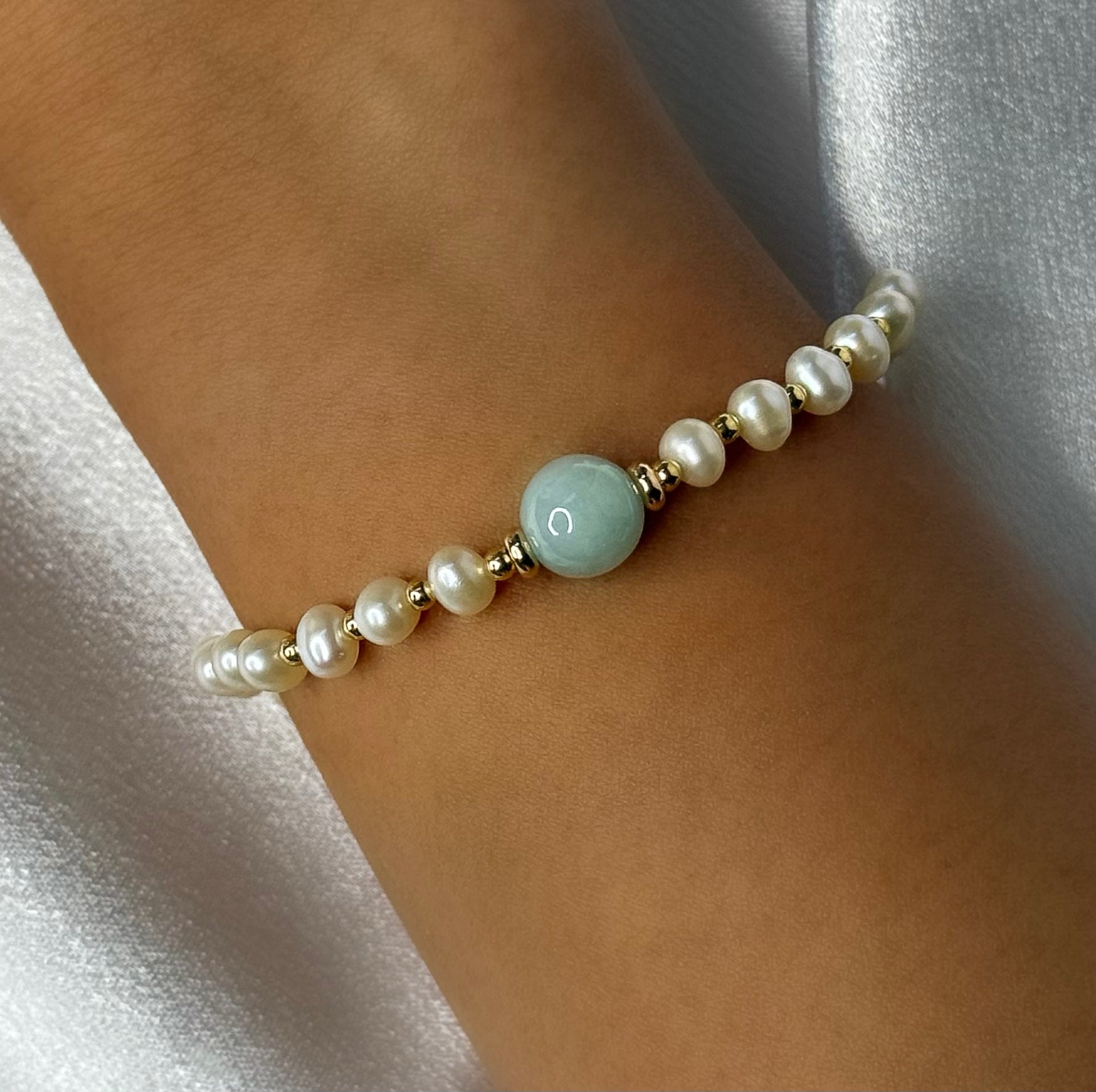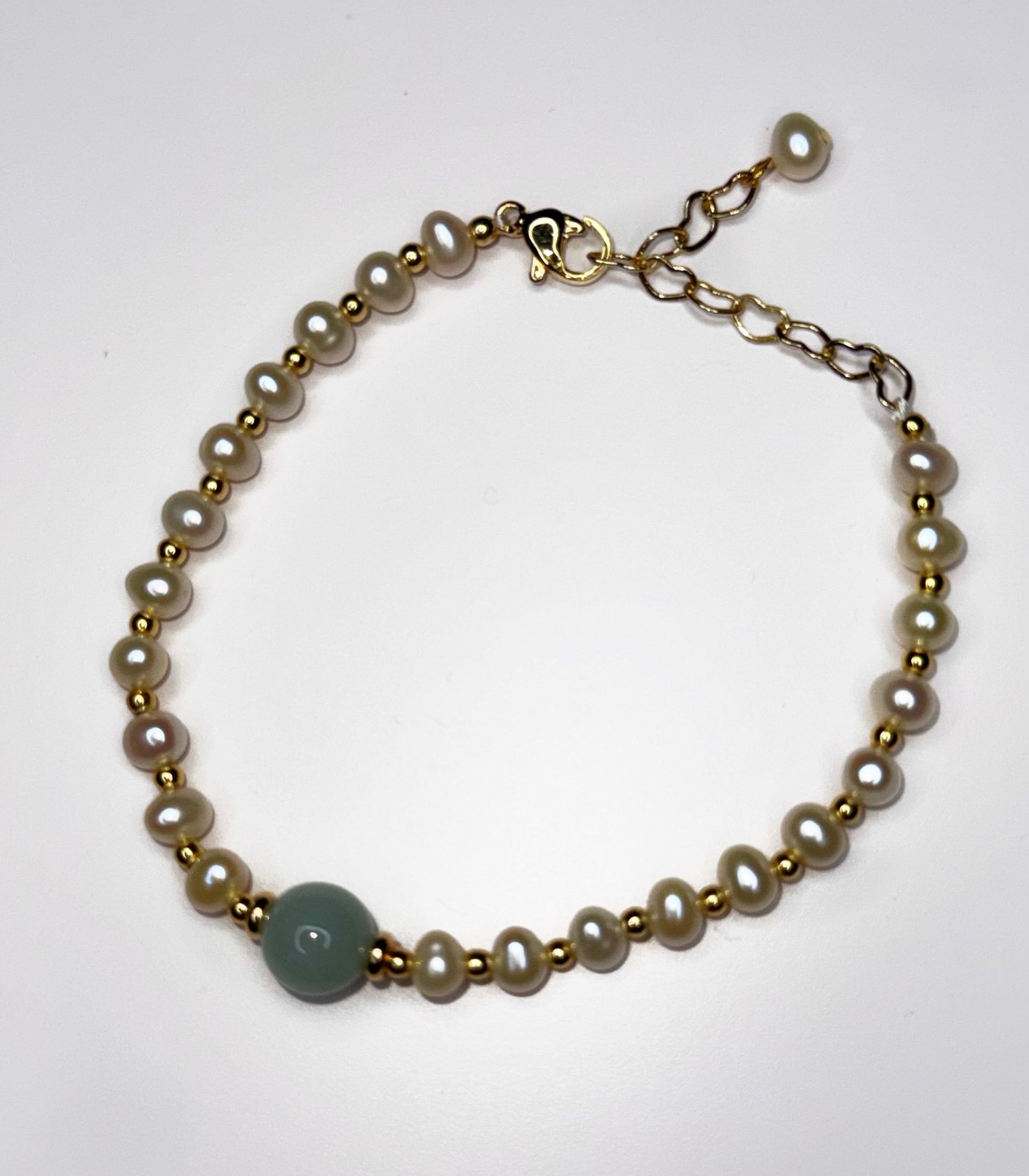 - Design: Pearls accented by gold beads, centered with a single jade stone