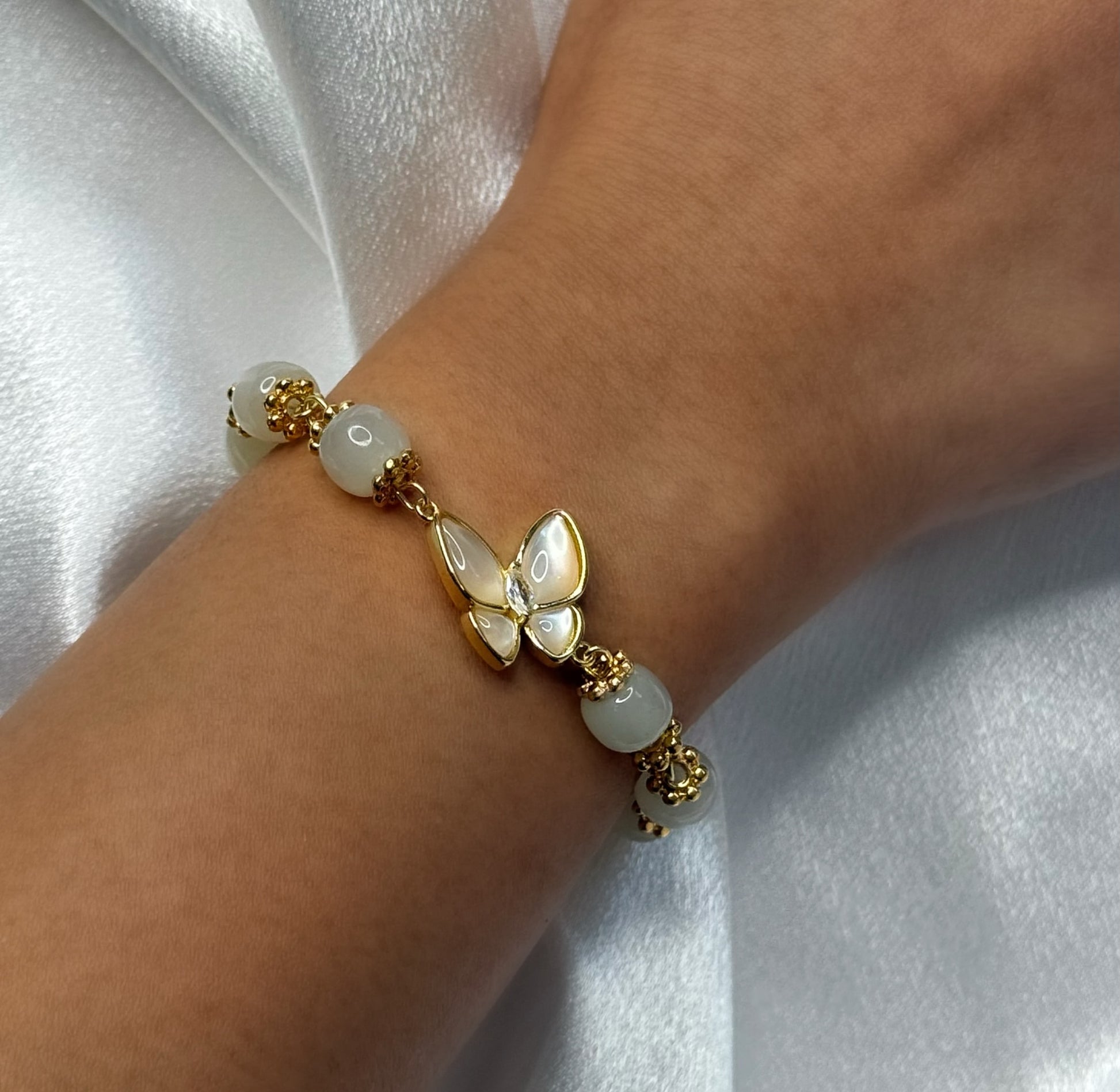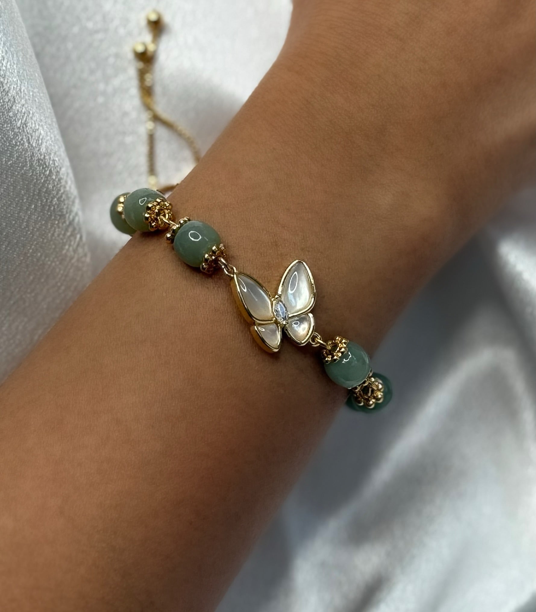 Delicate and enchanting, the Jaded Butterfly bracelet combines natural elegance with timeless charm. At its center is a luminous butterfly crafted from pearl shell, flanked by three natural jade beads on each side, each mounted with gold accents. Set on an adjustable gold-plated chain with a sliding ball clasp, this bracelet offers a refined fit and touch of elegance, perfect for any occasion.