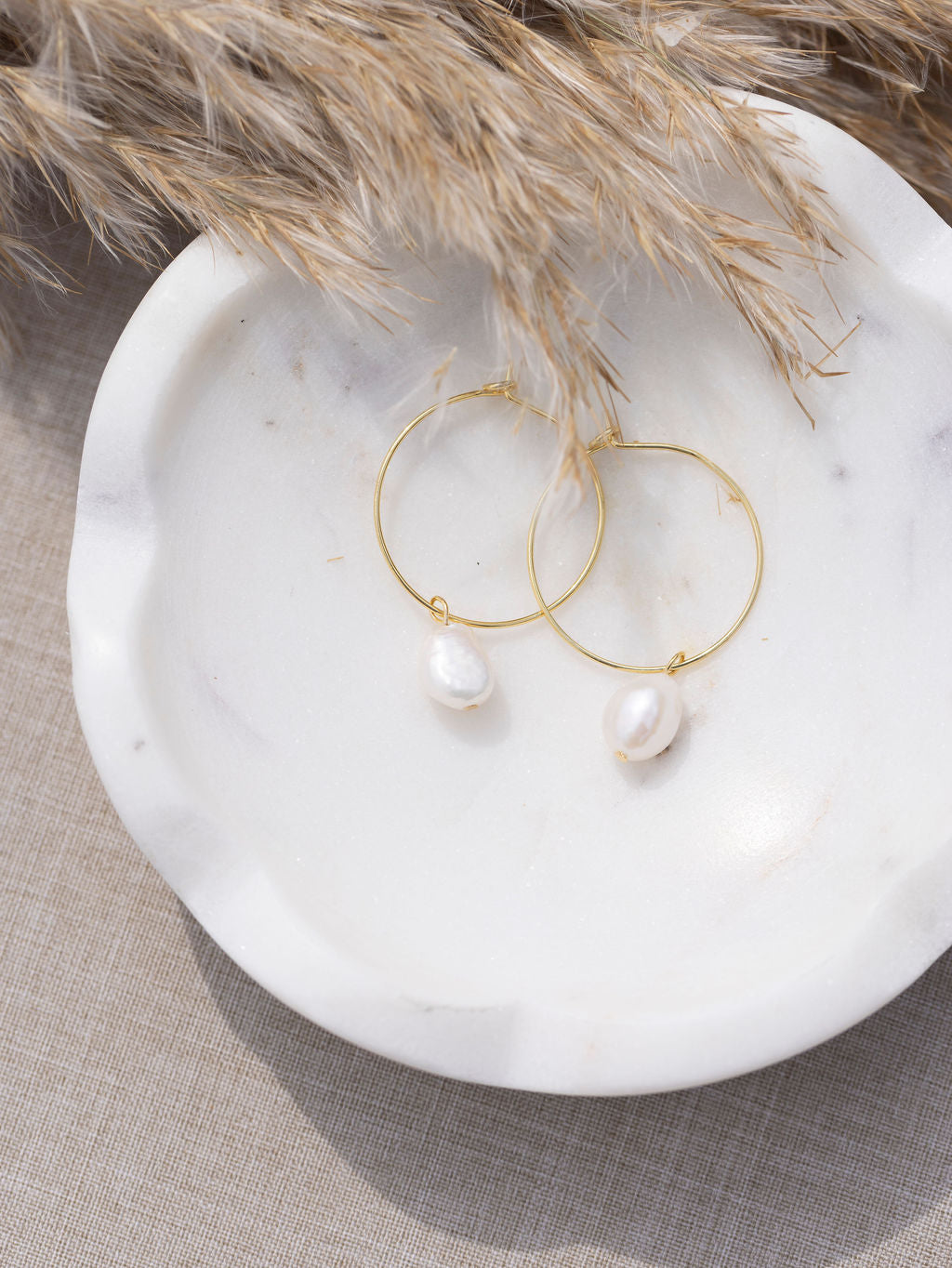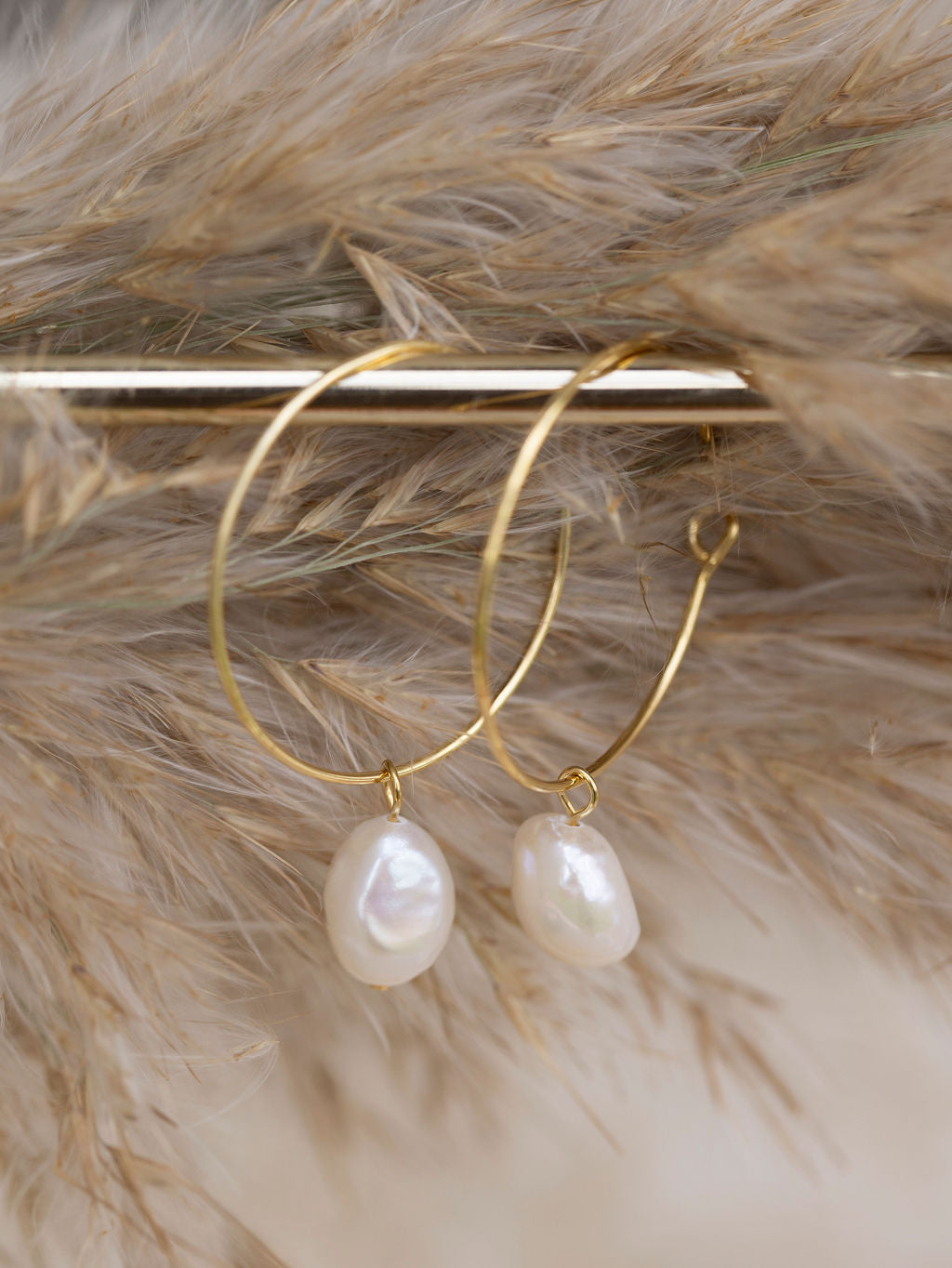 • Design: Thin gold hoop with a single dangling baroque pearl