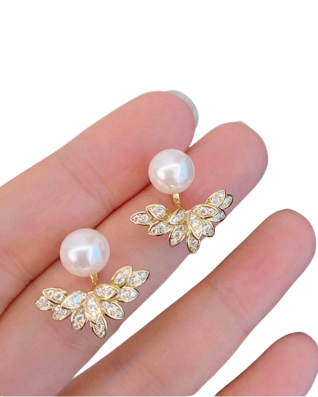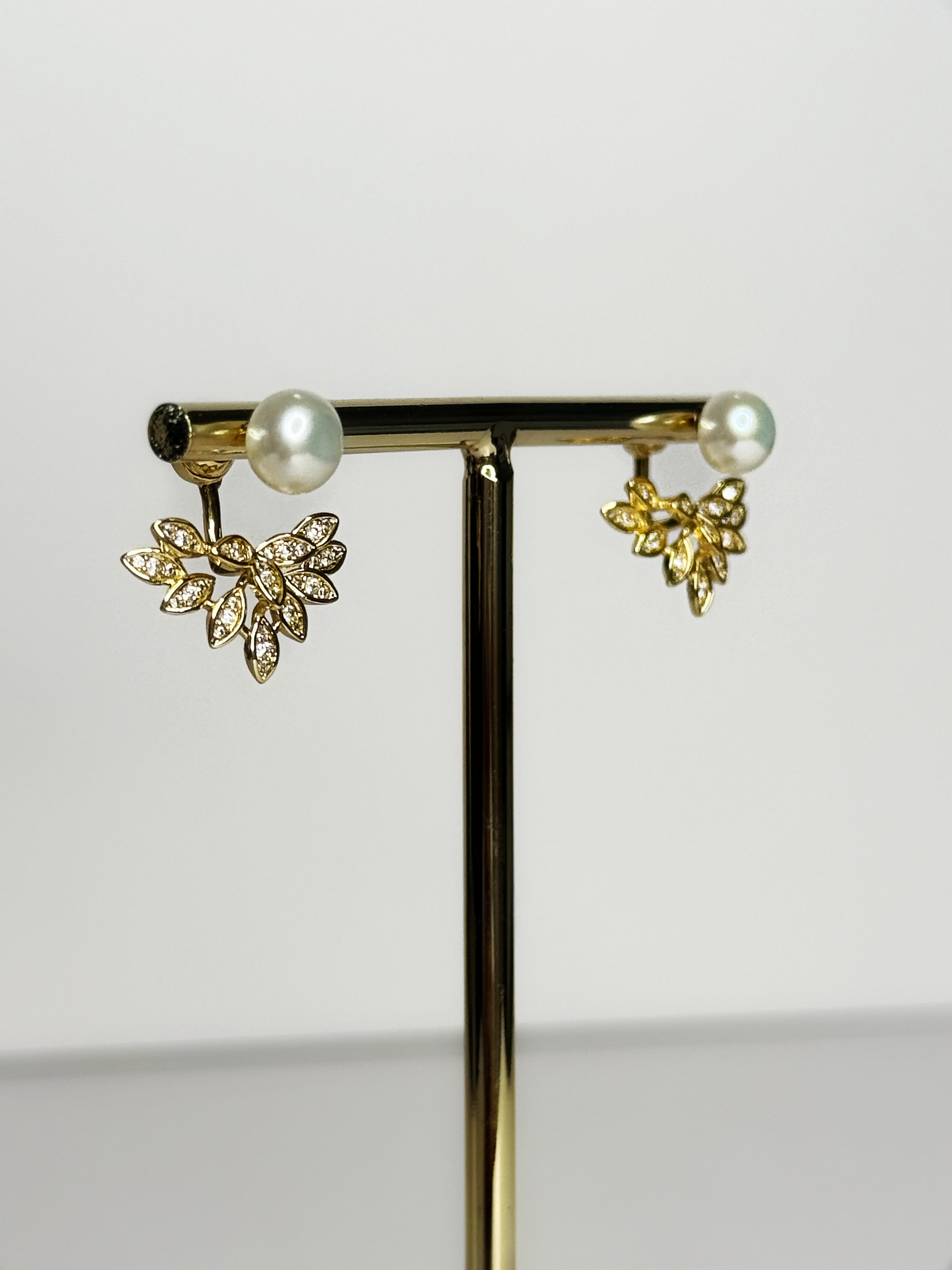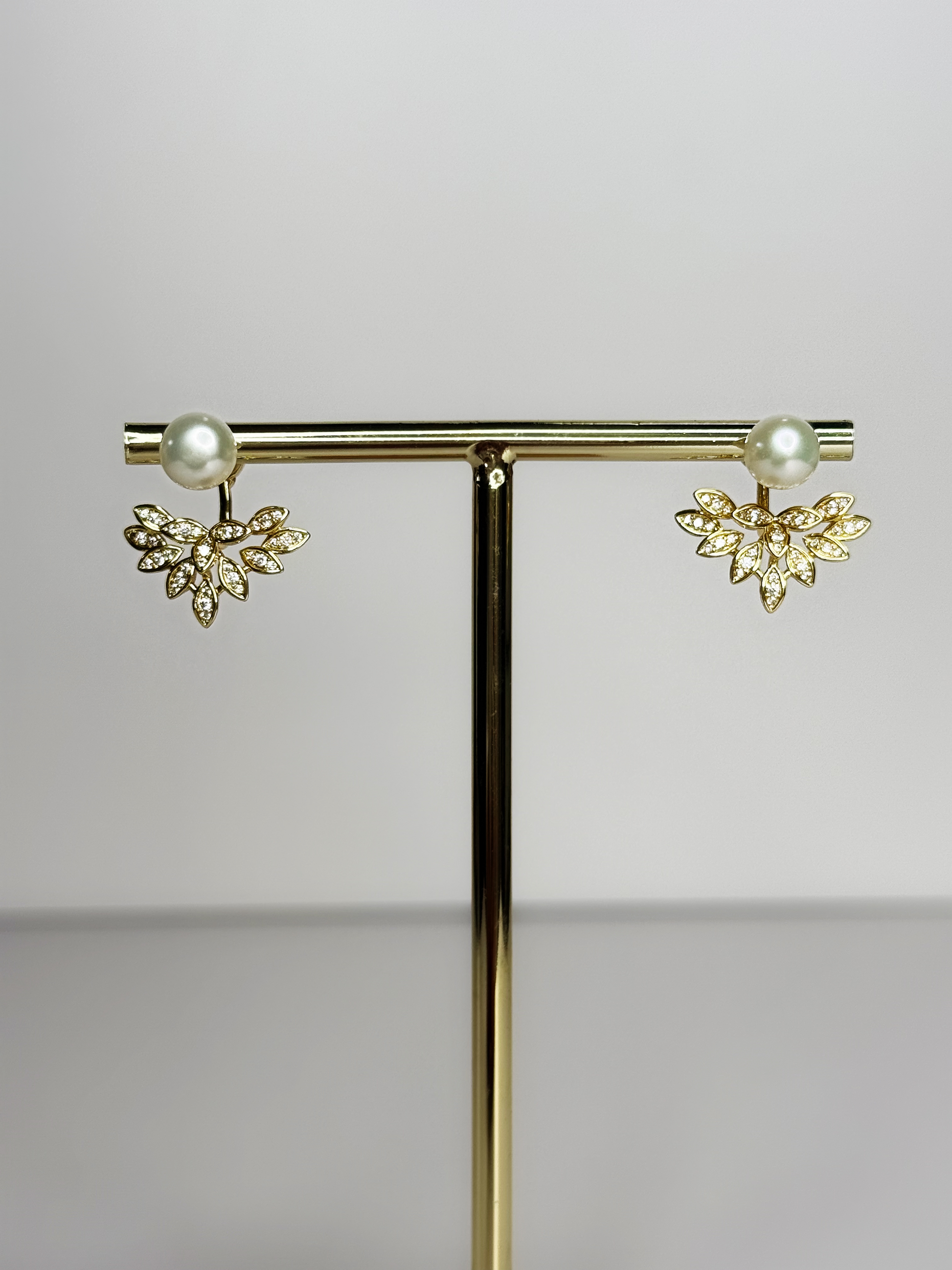 The Leaf & Pearl Earrings offer a versatile and elegant design that effortlessly transitions from day to night. At the center, a delicate pearl stud adds a touch of classic beauty. The unique back closure features an intricate leaf design adorned with CZ diamonds, forming an upside-down triangle that brings both sophistication and a natural charm to the piece.