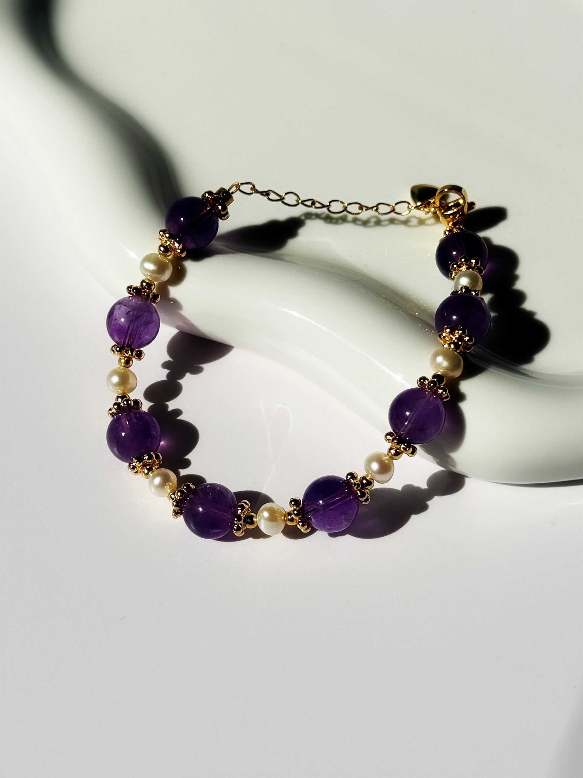 Delicate and serene, the Lilac Bloom Bracelet is a graceful balance of calming amethyst and luminous freshwater pearls. Each natural amethyst bead is hand-strung with care, accented by a petite pearl and gold-toned details throughout. The subtle contrast between soft violet hues and warm gold makes this bracelet a dreamy, feminine touch for everyday elegance or a meaningful gift.