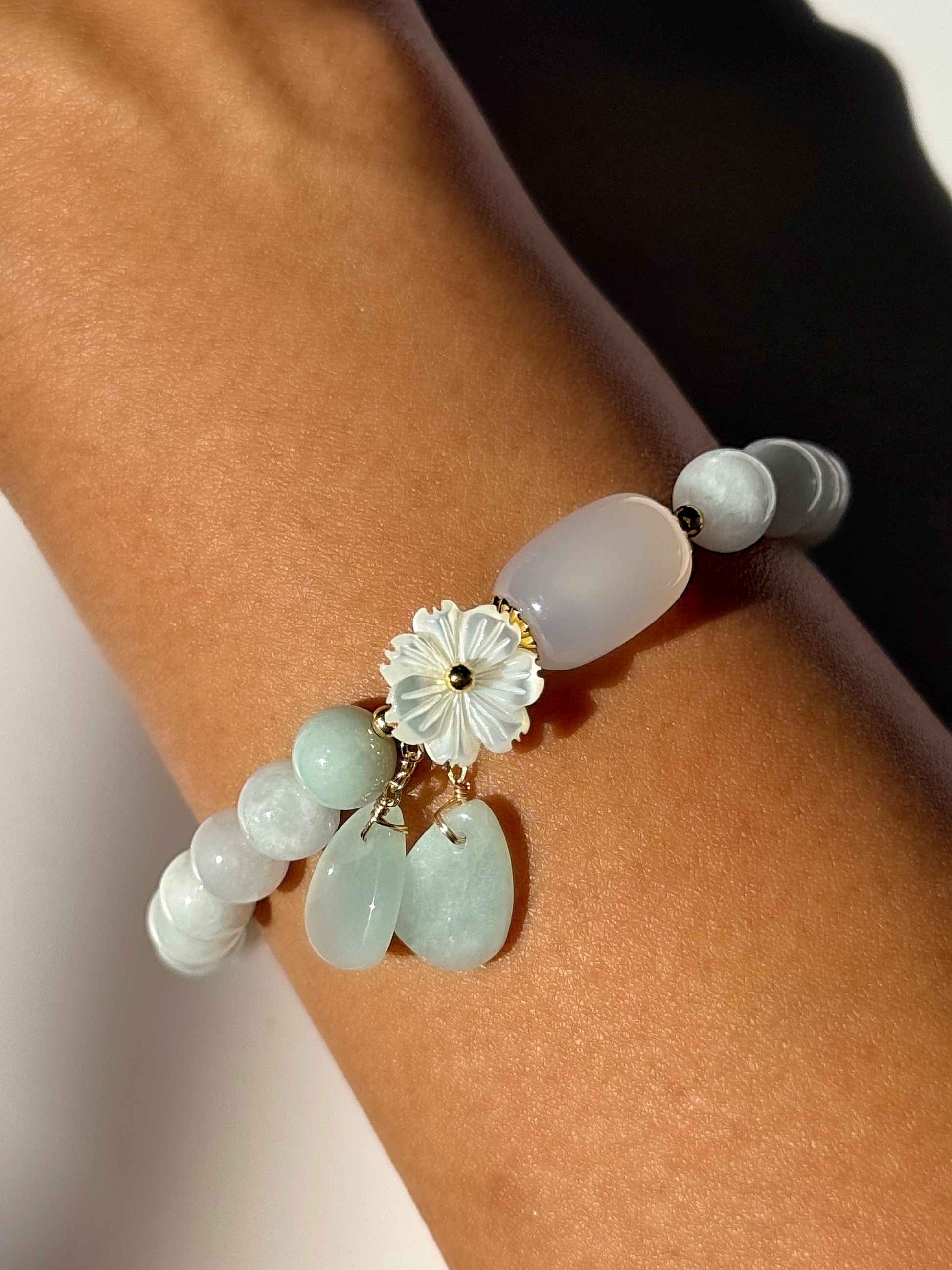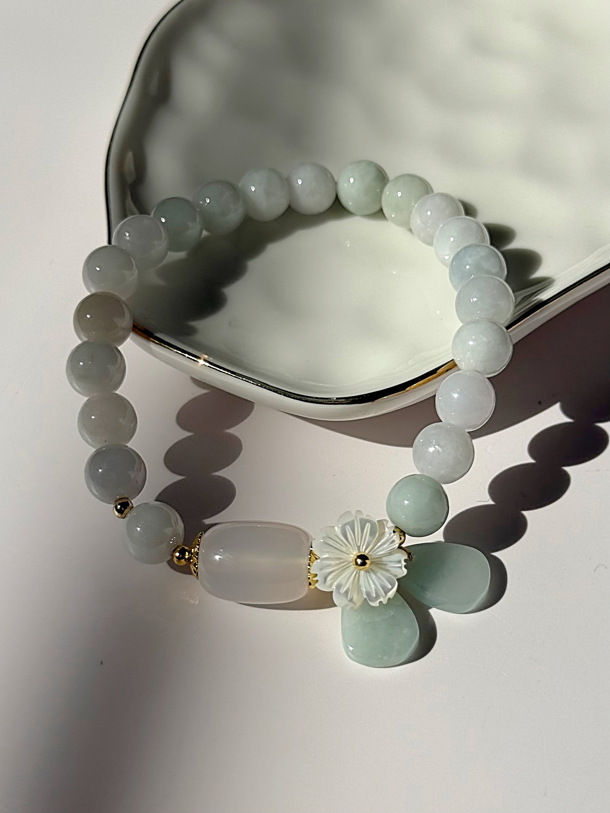 - Centerpiece: Cylinder jade bead with pearl shell flower