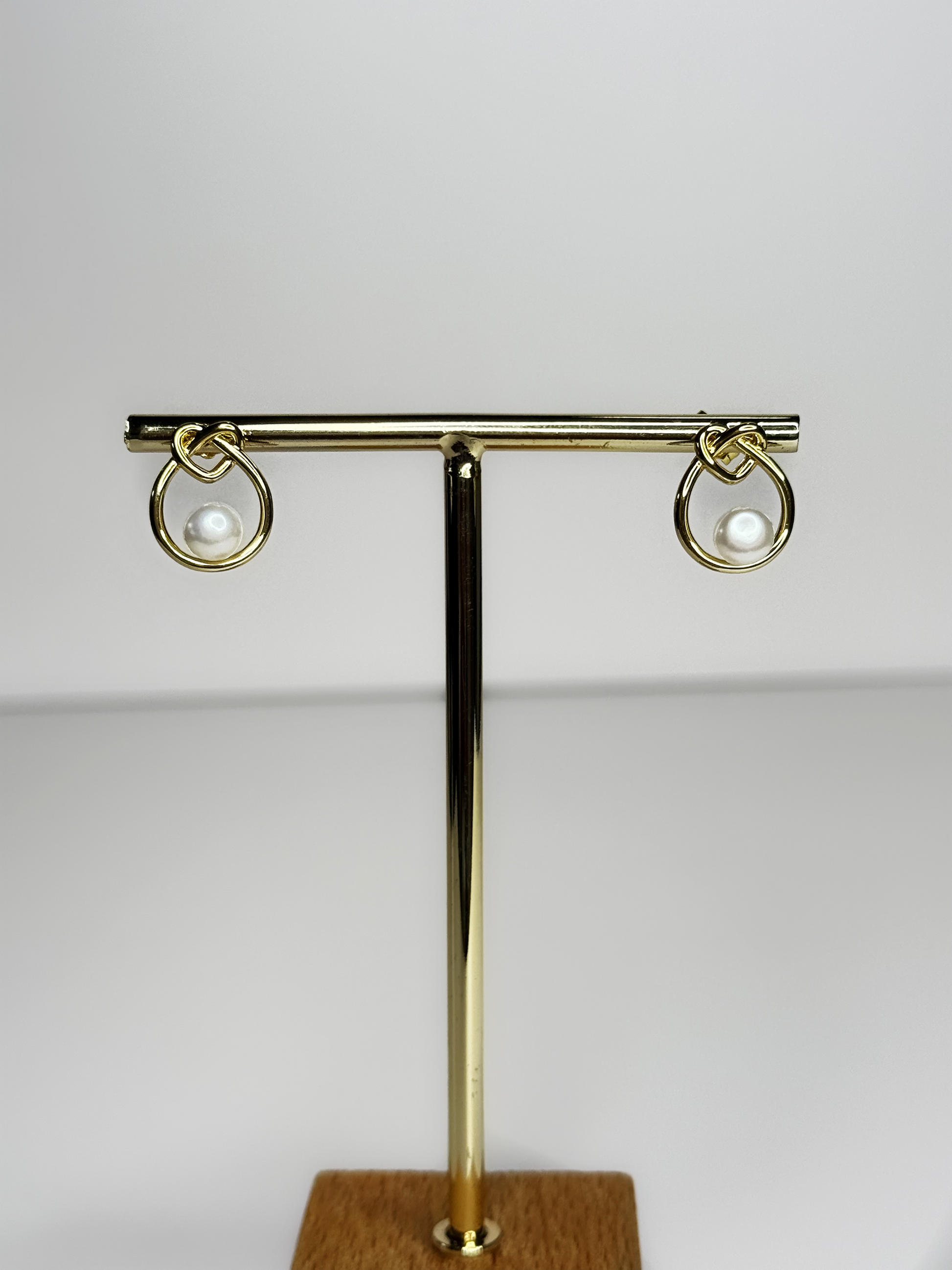 - Design: Heart-shaped knot with open round hoop and pearl accent