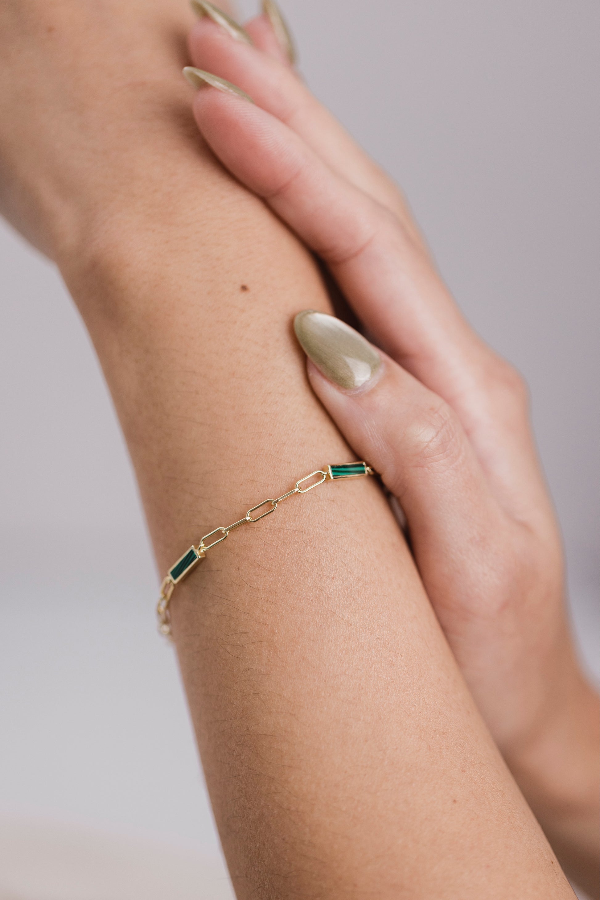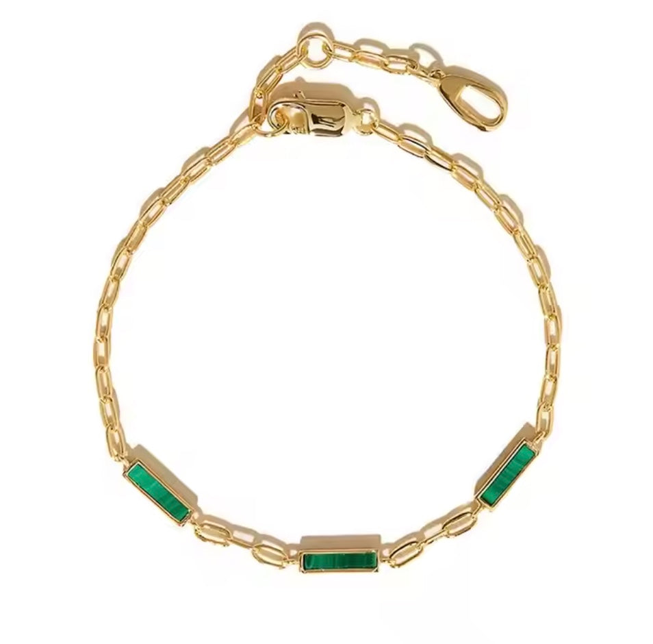 Elevate your look with the Malachite Bracelet, a stunning piece that combines modern elegance with timeless charm. Crafted with 14k gold vermeil over sterling silver, this bracelet features a sophisticated link design adorned with three rectangular synthetic malachite stones. The deep green hues of the malachite add a pop of color, making it a versatile accessory for any occasion. Perfect for layering or wearing on its own, this bracelet is a testament to refined style and quality craftsmanship.