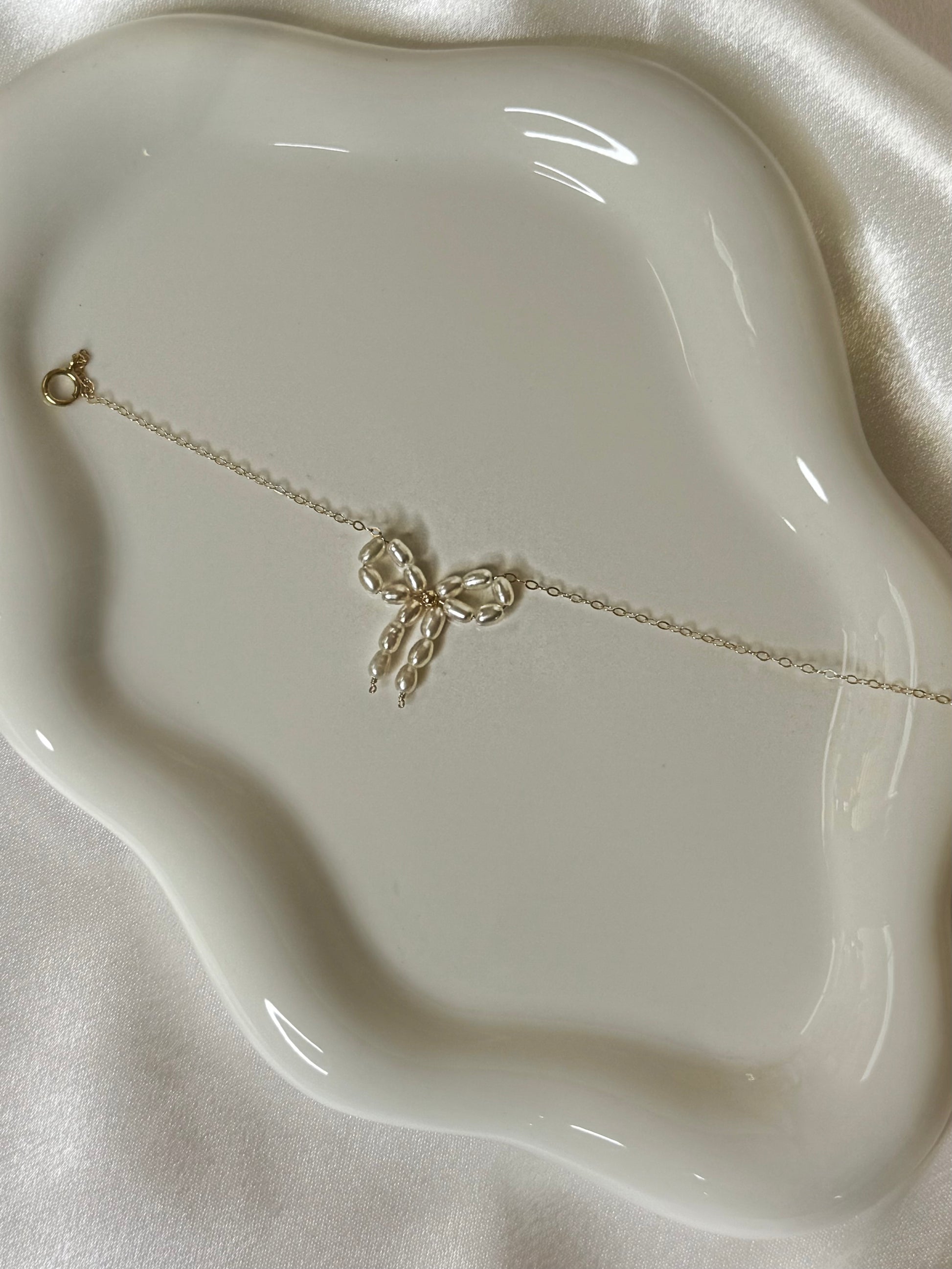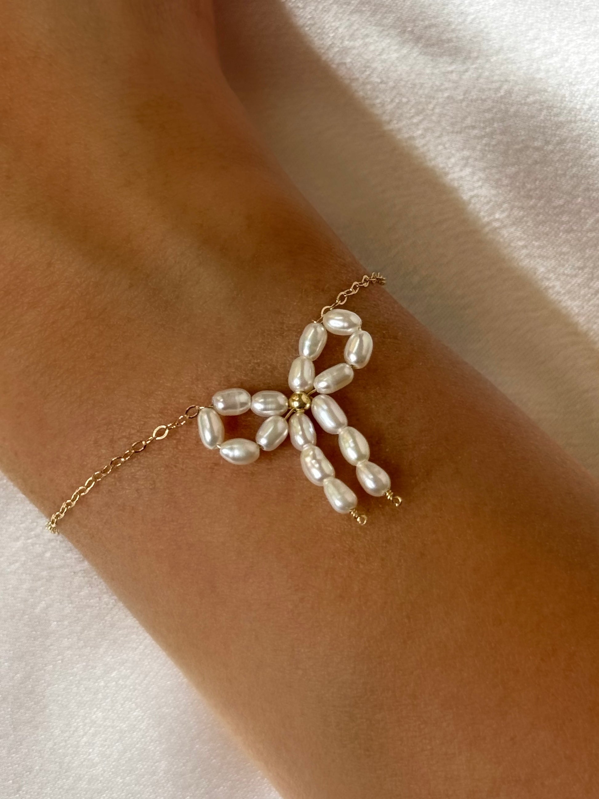 Delicate and timeless, the Margot Bracelet is a true celebration of elegance. Featuring a dainty gold-filled chain, this bracelet is adorned with a graceful bow crafted entirely from small freshwater pearls. Its exquisite design captures a sense of charm and sophistication, making it the perfect accessory for any occasion. The adjustable chain ensures a comfortable fit, adding versatility to its classic beauty.