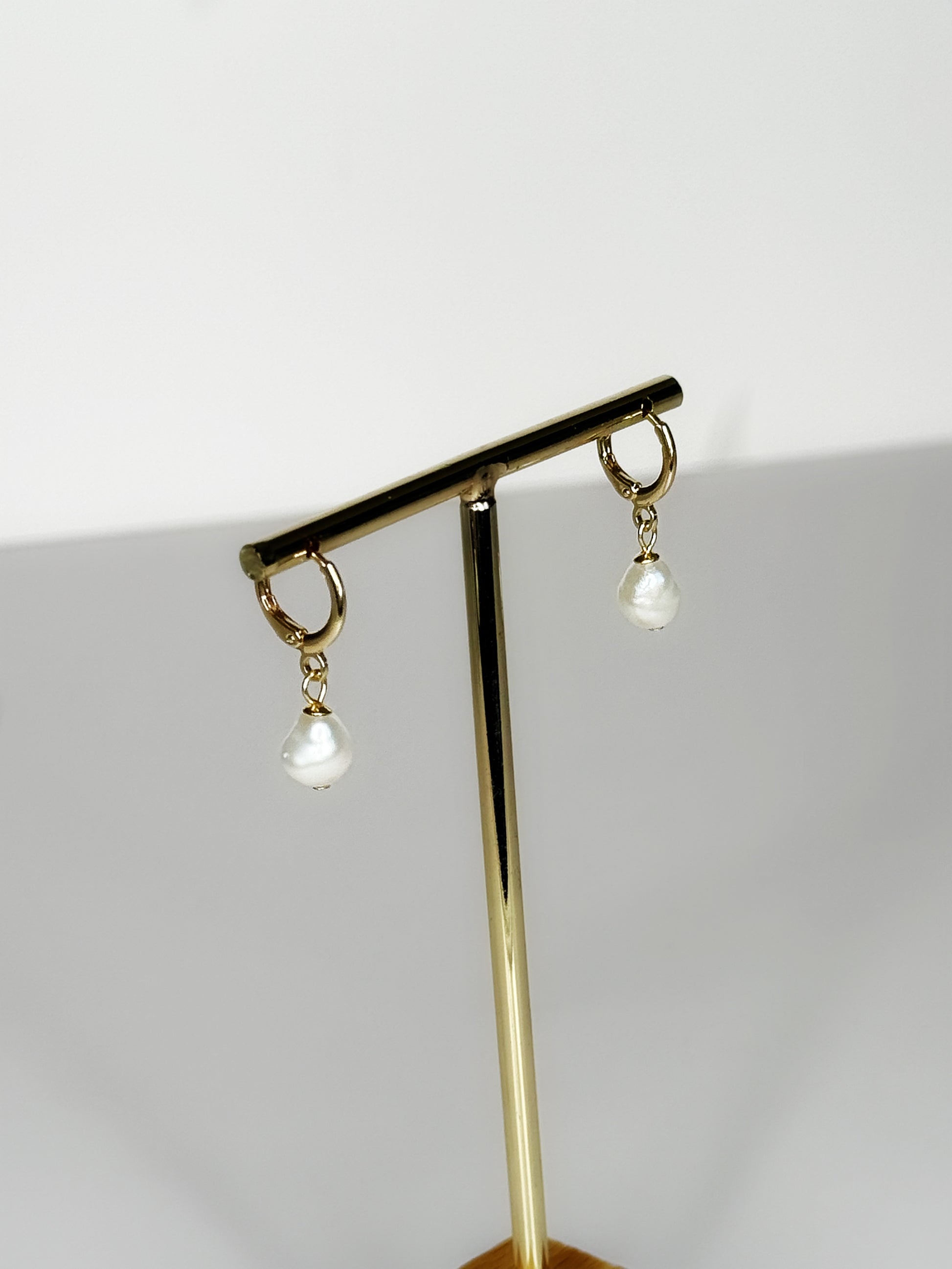 Each Noa Pearl Hoop is crafted with 18k gold plating over durable brass, ensuring a radiant finish while maintaining a comfortable feel. The natural freshwater pearl gently dangles, catching the light with every movement—an understated statement of refinement.