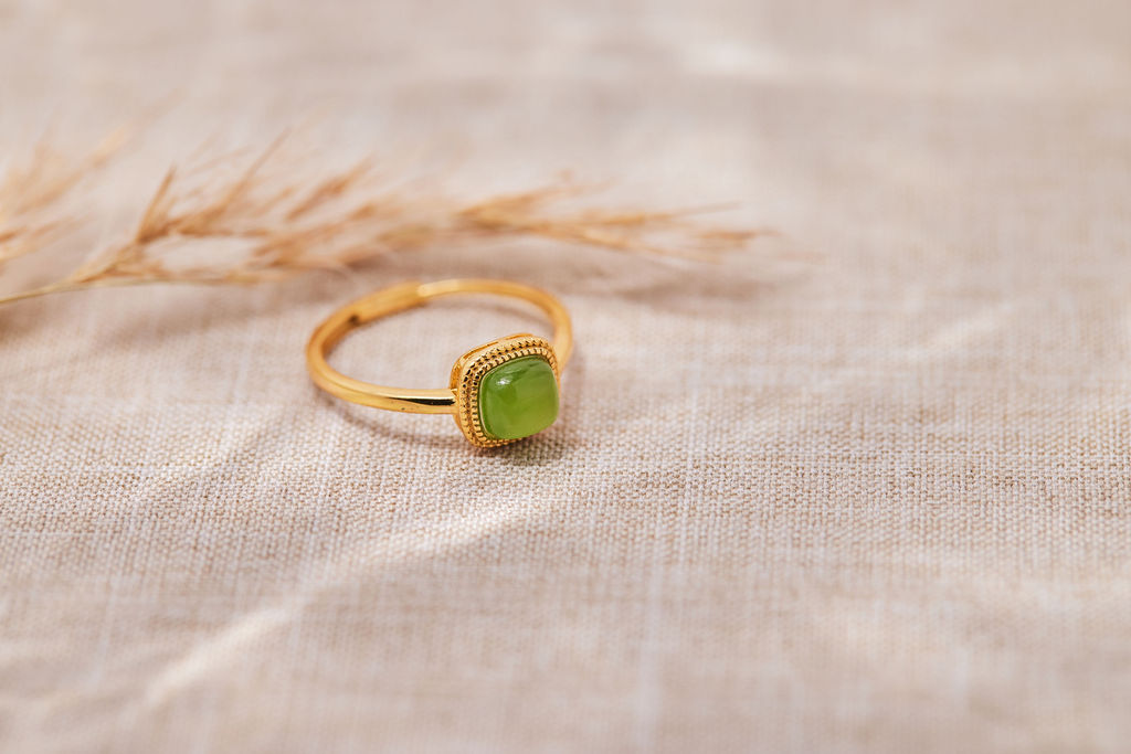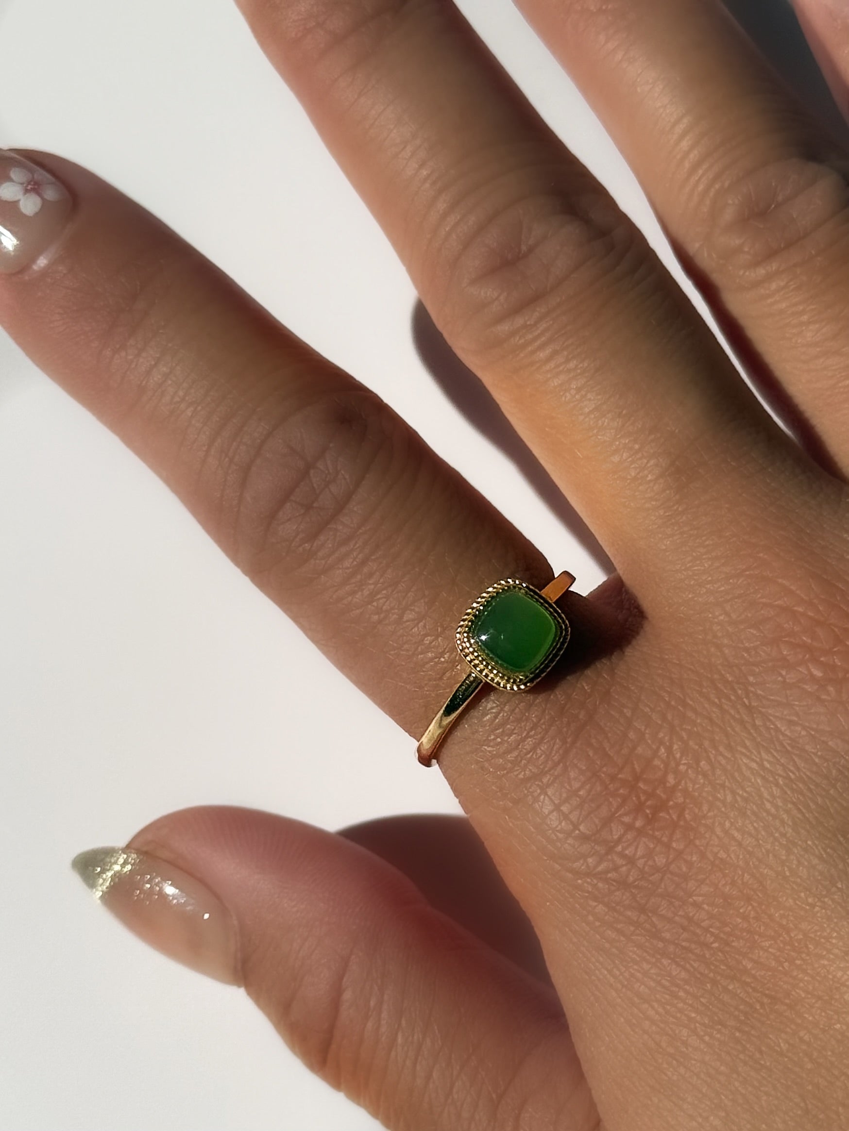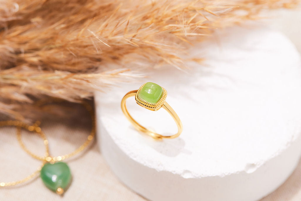 The Odette Jade Ring is the perfect accessory for adding a touch of refined elegance to your everyday look or enhancing a special outfit with its understated luxury.