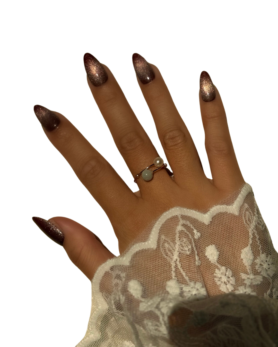 Crafted with 18k gold plating, the delicate wire wraps elegantly around the finger, leaving the two ends open to showcase the luminous pearl and jade as the centerpiece. Its adjustable design ensures a comfortable fit for most finger sizes, blending versatility with timeless elegance.