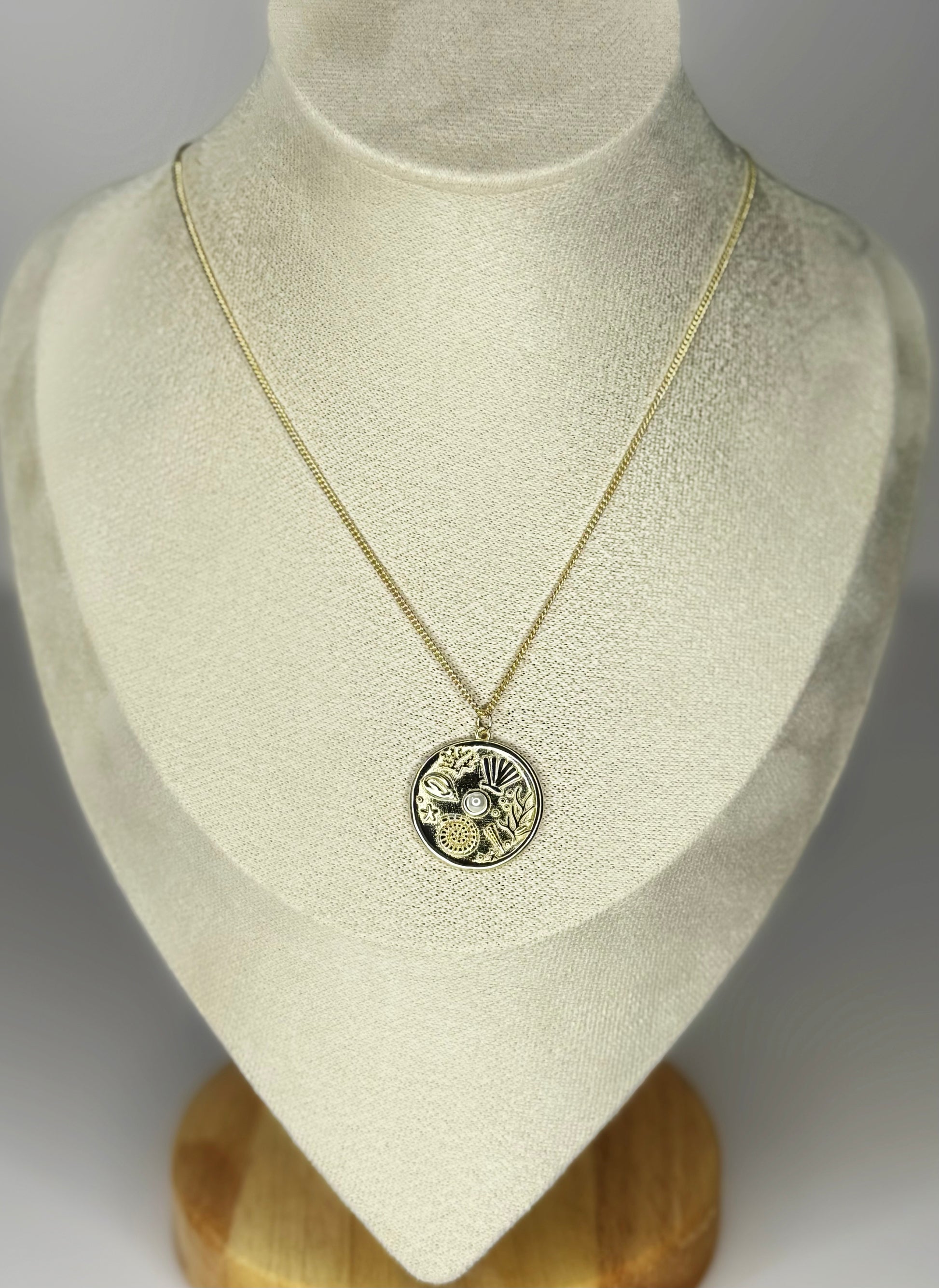 Inspired by the ocean, the Pearl of the Sea necklace features a round gold vermeil pendant adorned with delicate sea symbols—a starfish, seashell, and coral—with a natural freshwater pearl at its center. Crafted from 18k gold vermeil over sterling silver, this elegant piece captures the timeless beauty of the sea.