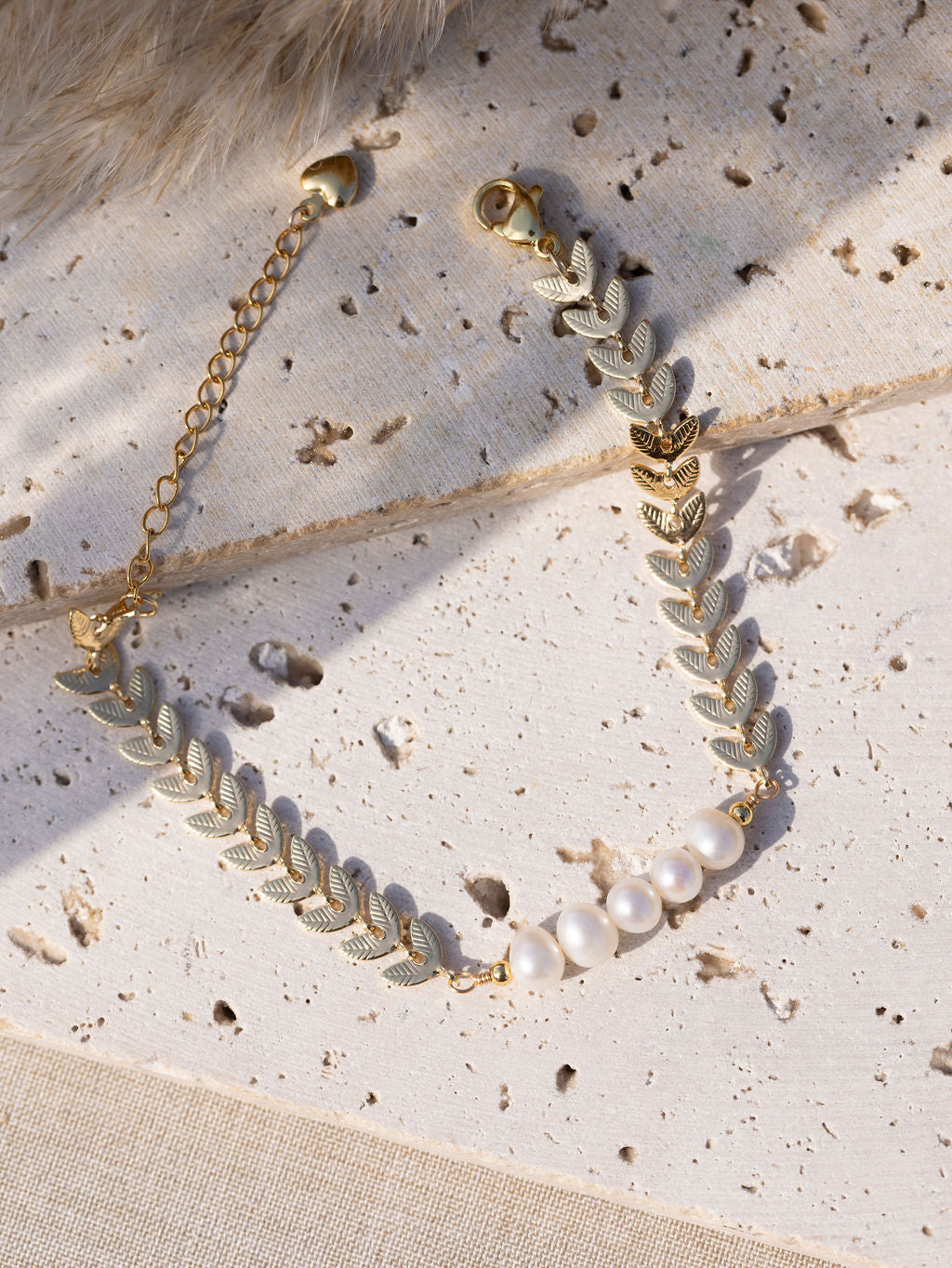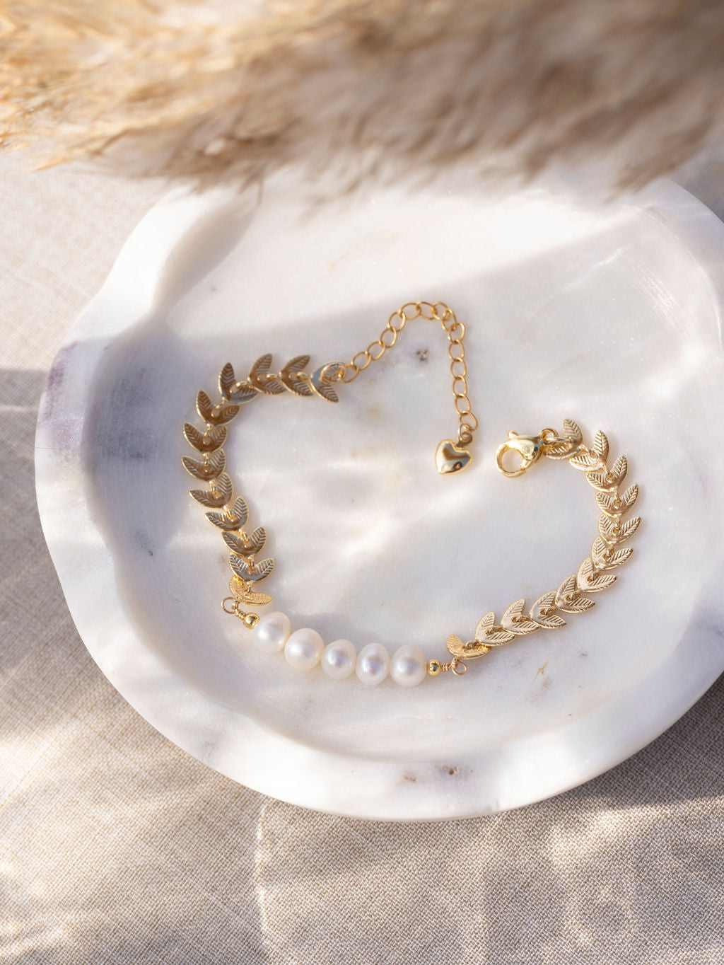 Discover elegance with our Pearl Pathway Bracelet. This beautifully crafted bracelet features five lustrous freshwater pearls as its centerpiece, framed on each side by delicate gold-plated arrow accents pointing toward the pearls. The unique design combines the soft glow of pearls with the modern edge of gold-plated arrows, creating a graceful statement piece.