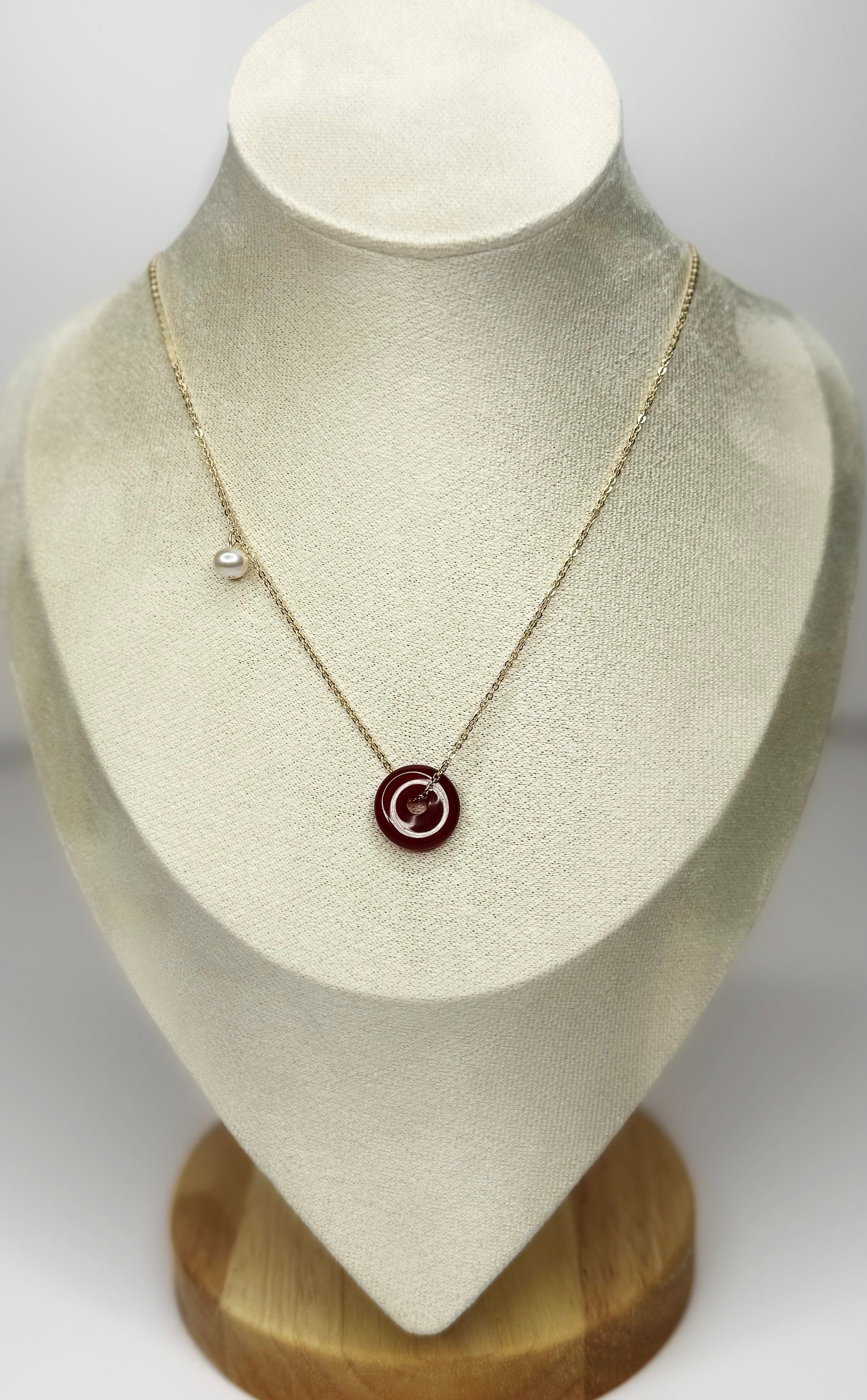 The Red Agate Necklace is a timeless accessory that exudes warmth and vitality. This 18k gold-plated chain is adorned with a natural red agate pendant, complemented by a delicate off-centered freshwater pearl. The rich, fiery hues of the red agate create a bold yet elegant look, perfect for both everyday wear and special occasions. With an adjustable length of 16 to 18 inches, it ensures versatility and comfort for any neckline.