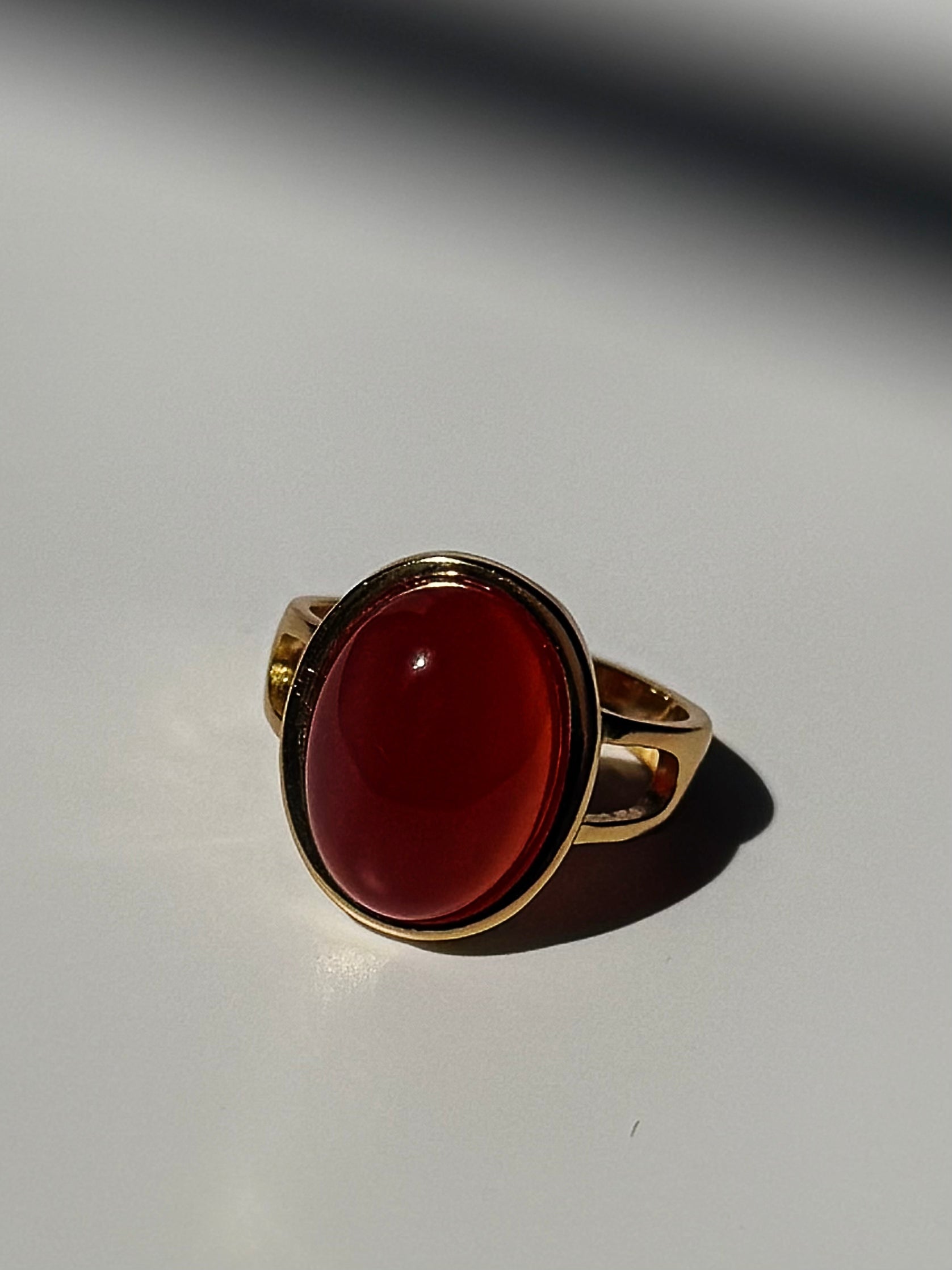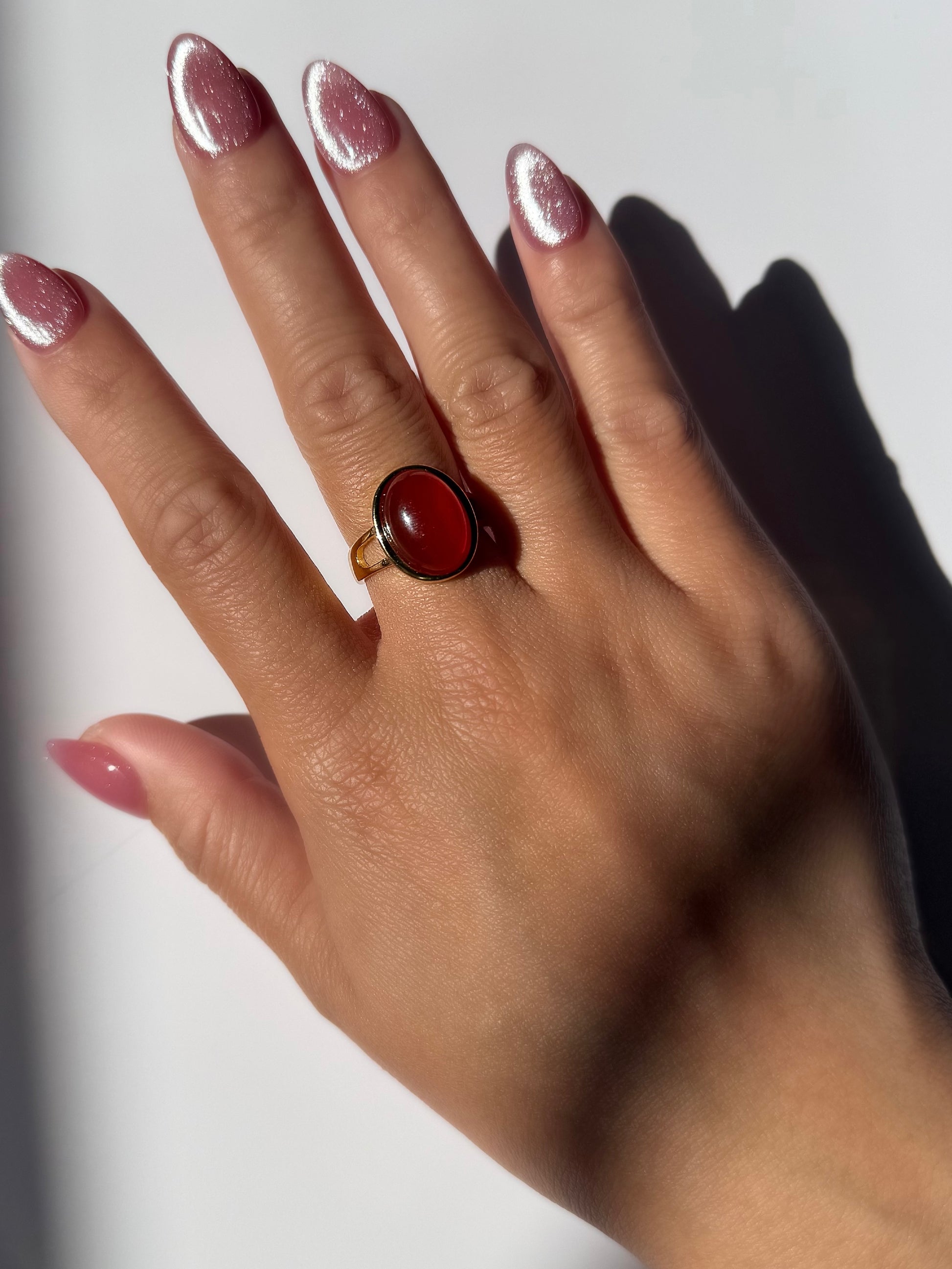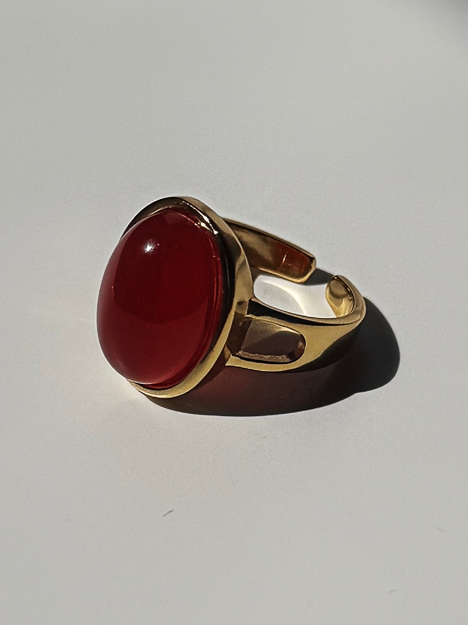 A statement of passion and power, the Scarlett Ring is crafted from sterling silver with 14k gold plating, featuring a stunning oval natural red agate gemstone at its center. Held securely by a delicate gold bezel setting, the deep crimson hues of the red agate radiate warmth and energy. The band is adorned with intricate openwork detailing on the sides, adding a touch of artistry and elegance. Designed with comfort in mind, this ring is adjustable, allowing a perfect fit for most wearers.
