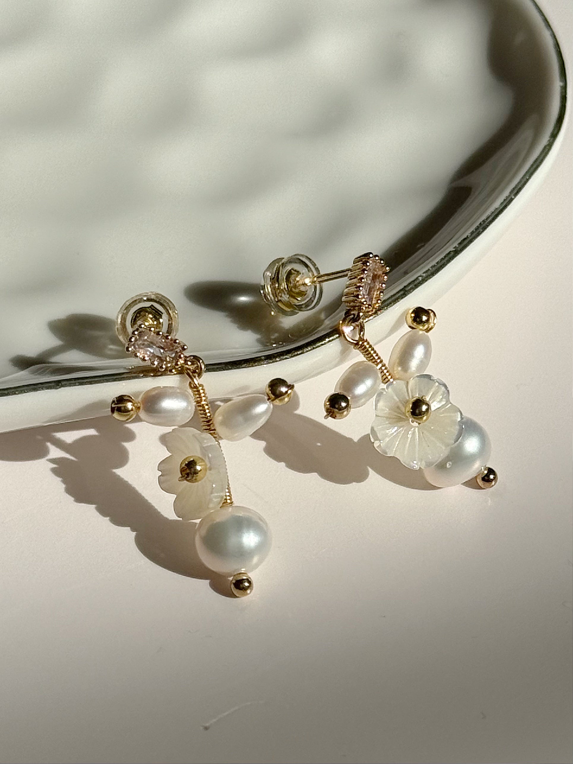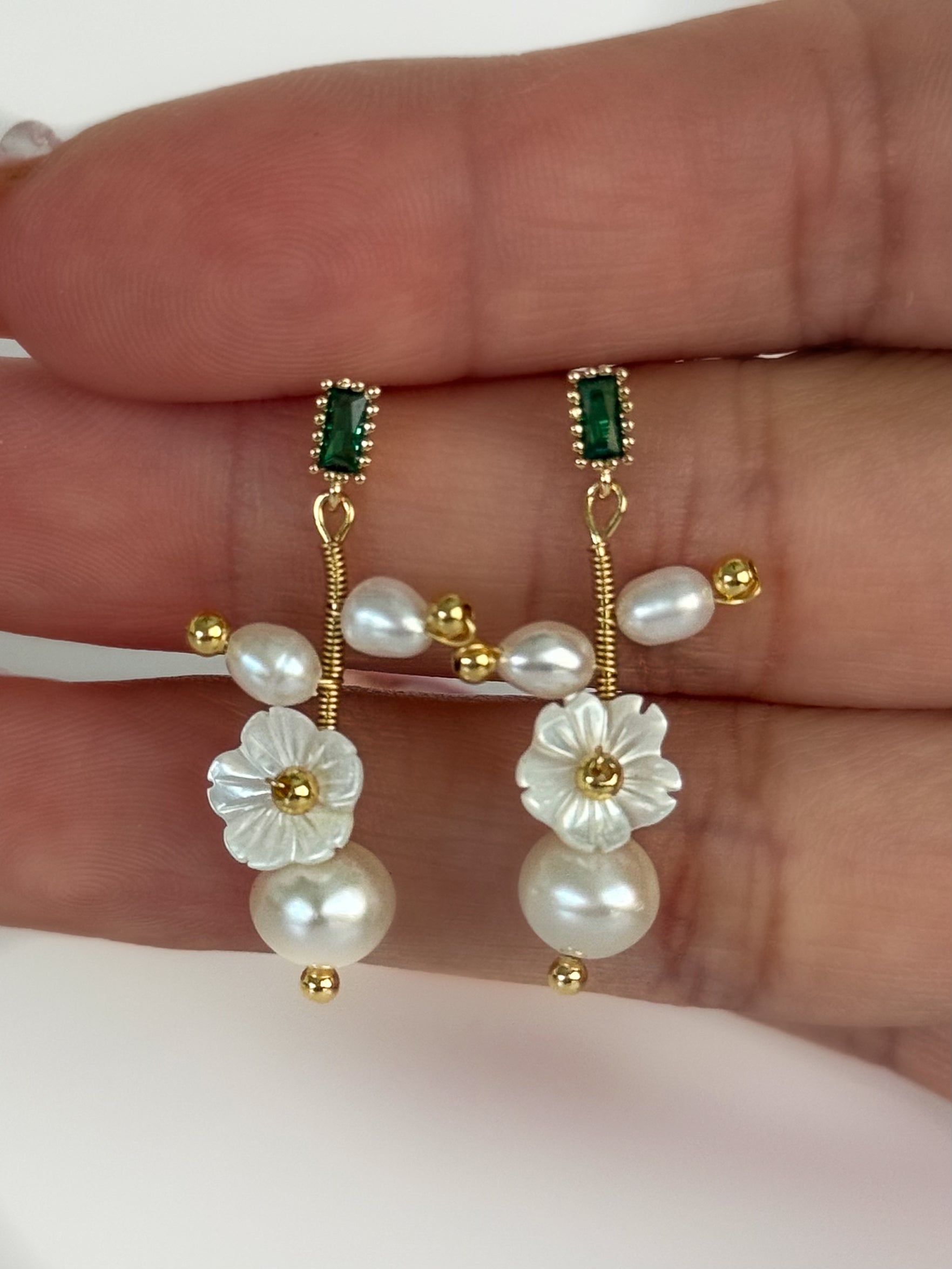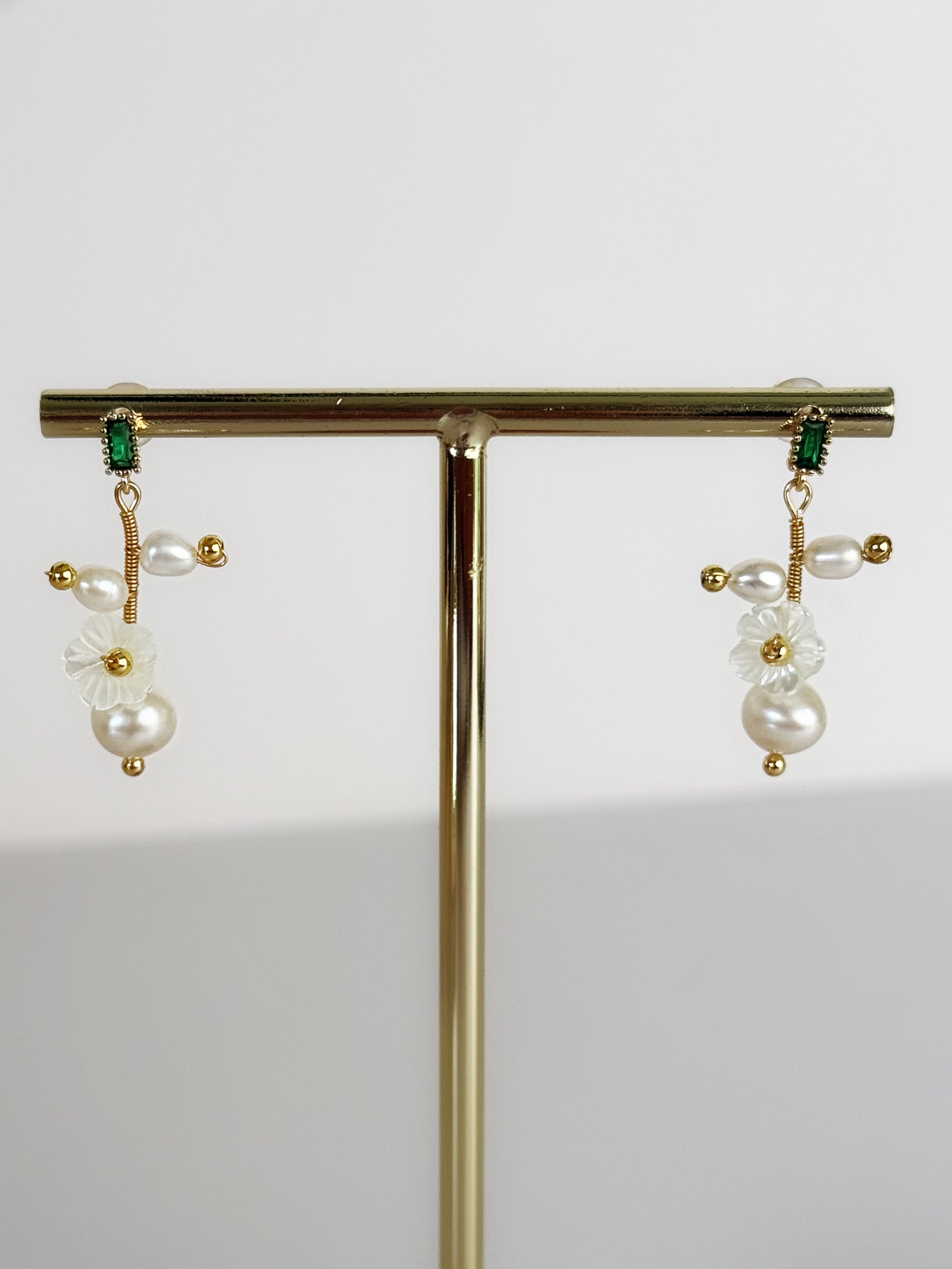 Nature’s soft elegance, reimagined in a pair of graceful dangle earrings. The Vine Bloom Drops feature a delicate cascade of textures and tones—starting with a glimmering choice of a rectangular green or pink zircon stone, followed by a white floral accent and two petite rice pearls stacked above a luminous freshwater pearl. Feminine, earthy, and effortlessly romantic, these earrings add a fresh and refined touch to any look.