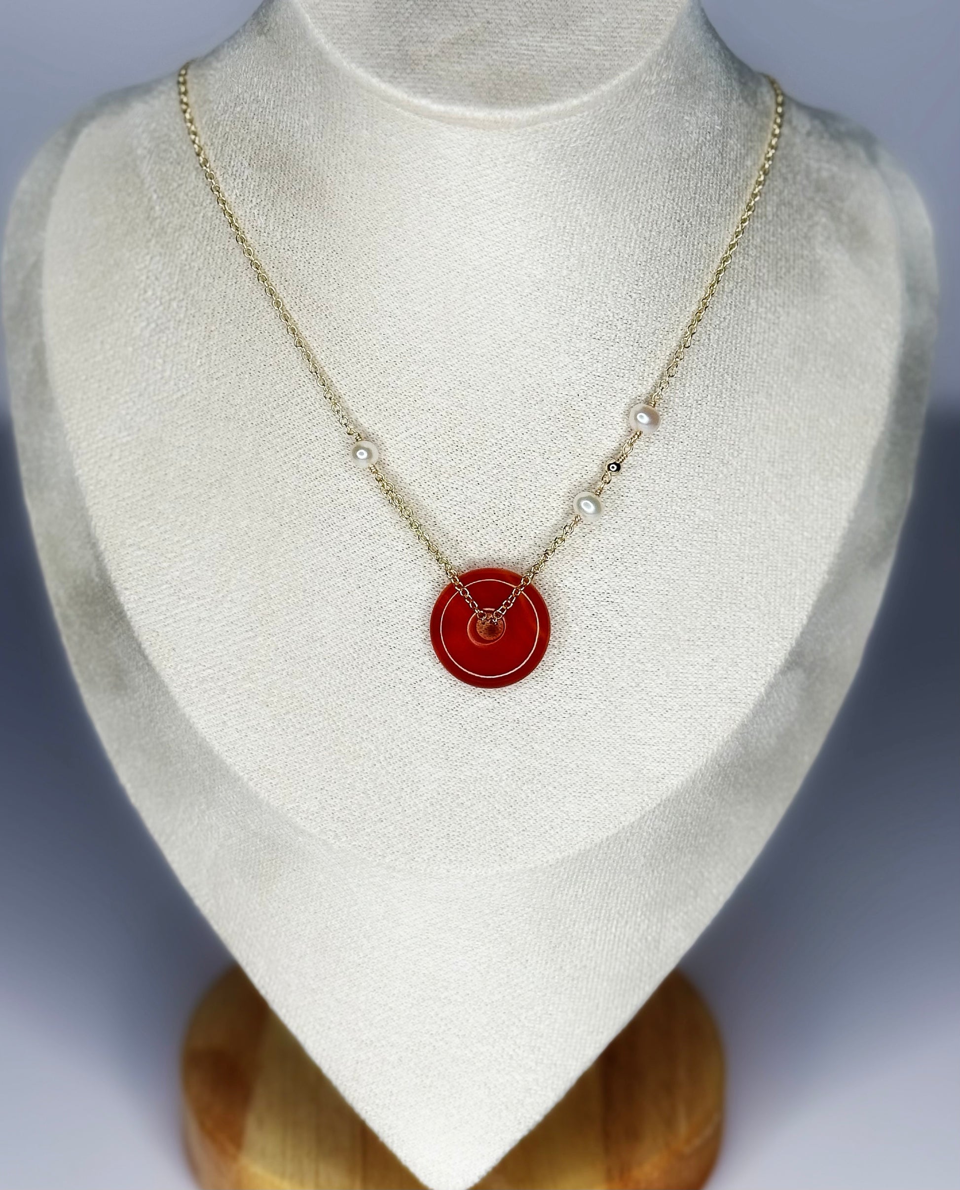 The Scarlet Necklace is a radiant statement of elegance and balance. Featuring a natural red agate donut-style pendant, this design highlights the fiery beauty of the stone, symbolizing passion and vitality. The pendant is framed by a short double chain, adorned with delicate freshwater pearls—one on one side and two on the other—for an asymmetrical yet harmonious look. This unique piece is perfect for adding a bold yet refined touch to any outfit, making it an essential addition to your jewelry collection.