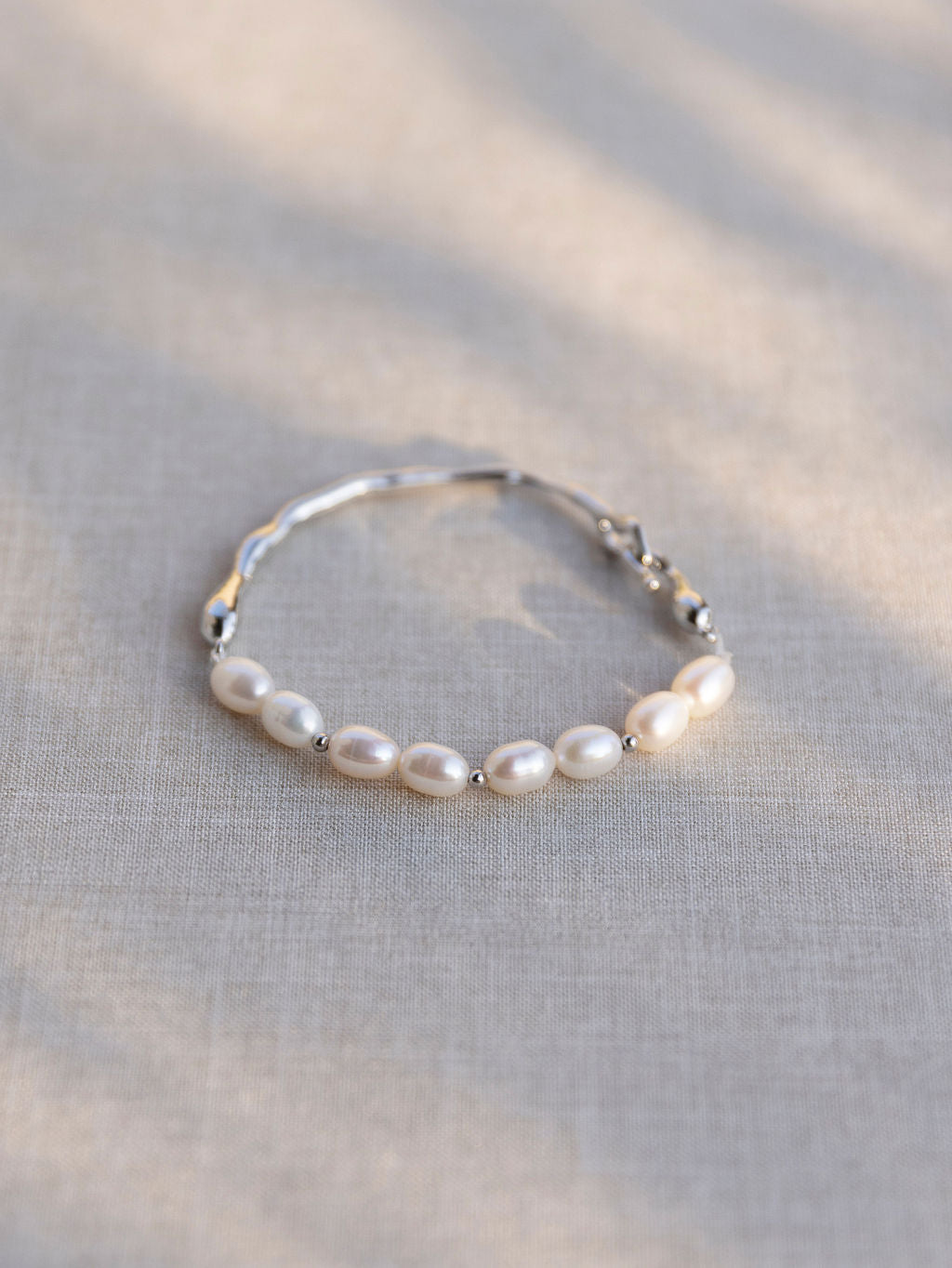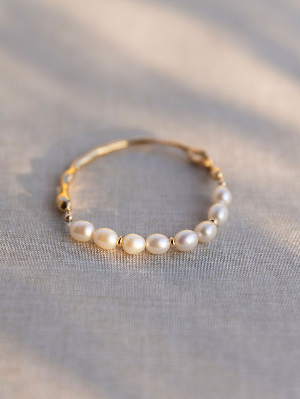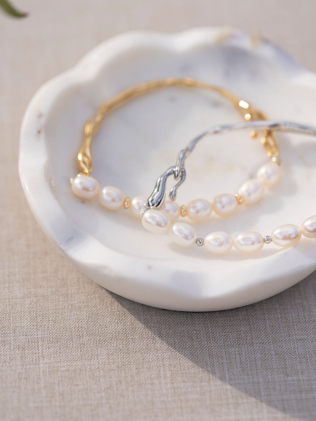 Embrace the beauty of contrast and elegance with the Sun Wave Bracelet. Featuring a stunning design that blends the organic beauty of baroque pearls with the sleek sophistication of metal, this bracelet offers two finishes—yellow gold or platinum plating—to suit your personal style. Half of the bracelet is delicately threaded with baroque pearls, while the other half is made of metal, connecting like a bangle with a secure latch for effortless wear. The harmonious combination of pearls and metal creates a radiant, timeless look, perfect for both casual and formal occasions.