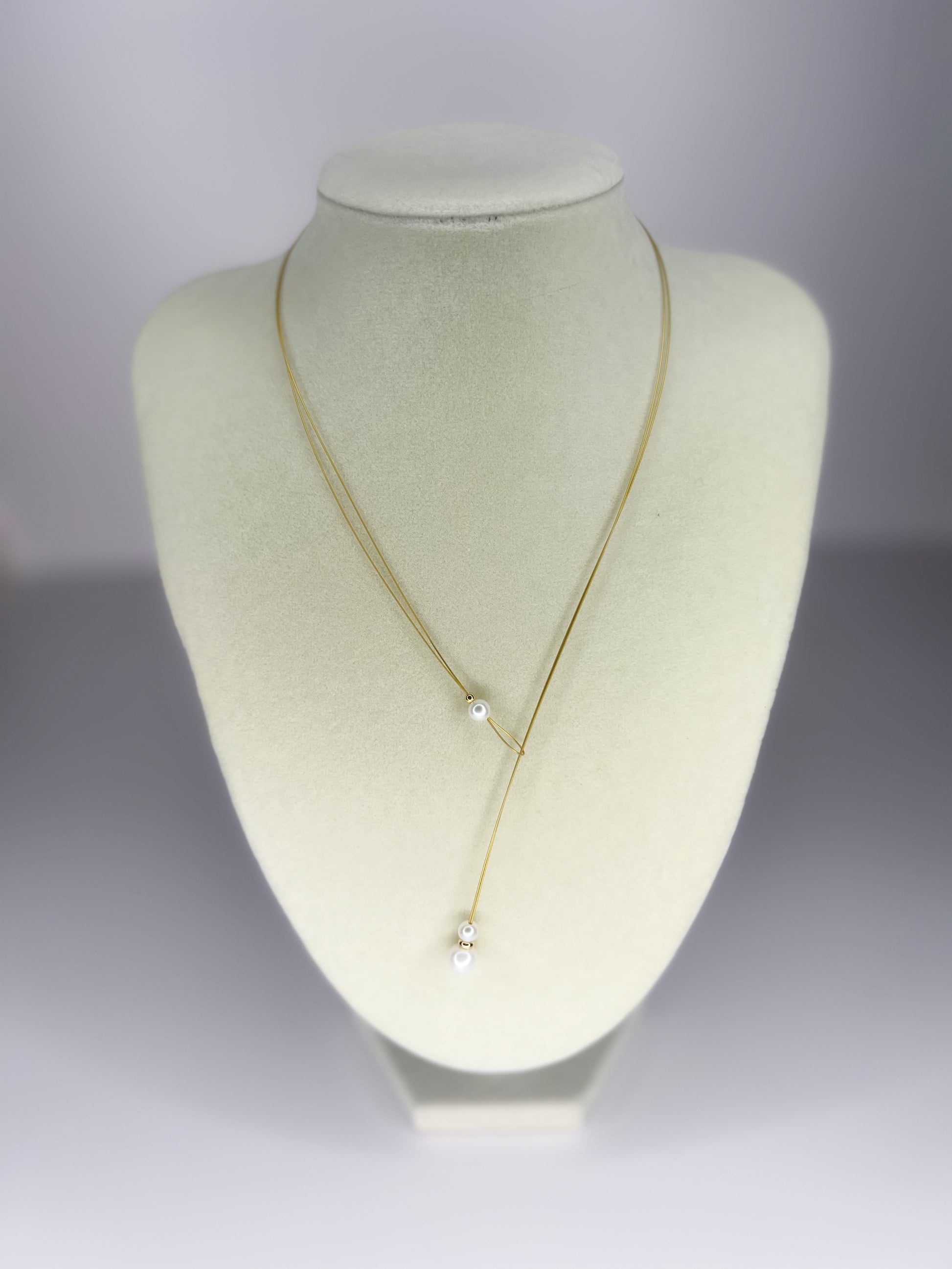 The Tangled in Pearls necklace is a stunning blend of modern design and classic elegance. Crafted from sleek gold wire, this unique piece features two beautiful freshwater pearls at each end, with the double-threaded wire looping gracefully to create a striking visual effect. At 16 inches long, this necklace is perfect for layering or making a statement on its own.